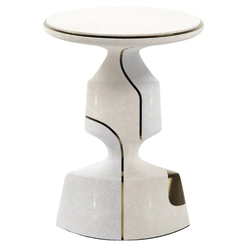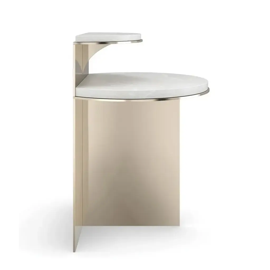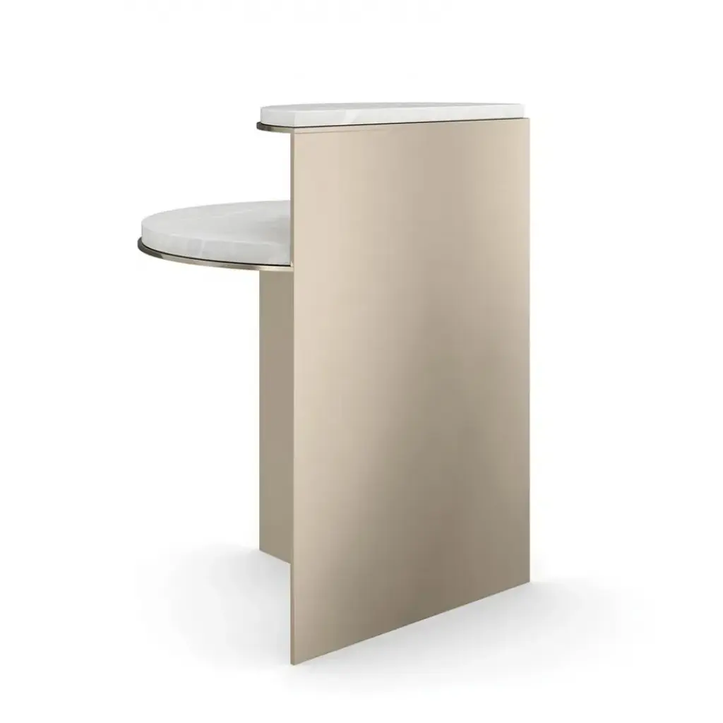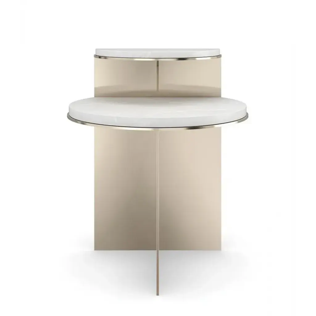 Simple yet elegant with an emphasis on function, this curved end table adds depth and reflection to seating areas. Features two tiers of White Rhino stone atop an angular metal base finished in a Whisper of Gold. A standout on its own, even more memorable in pairs.