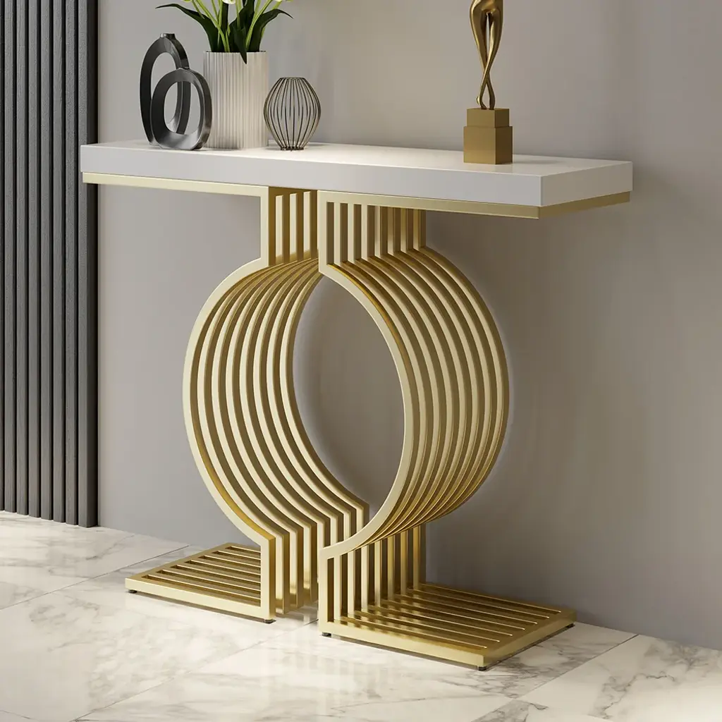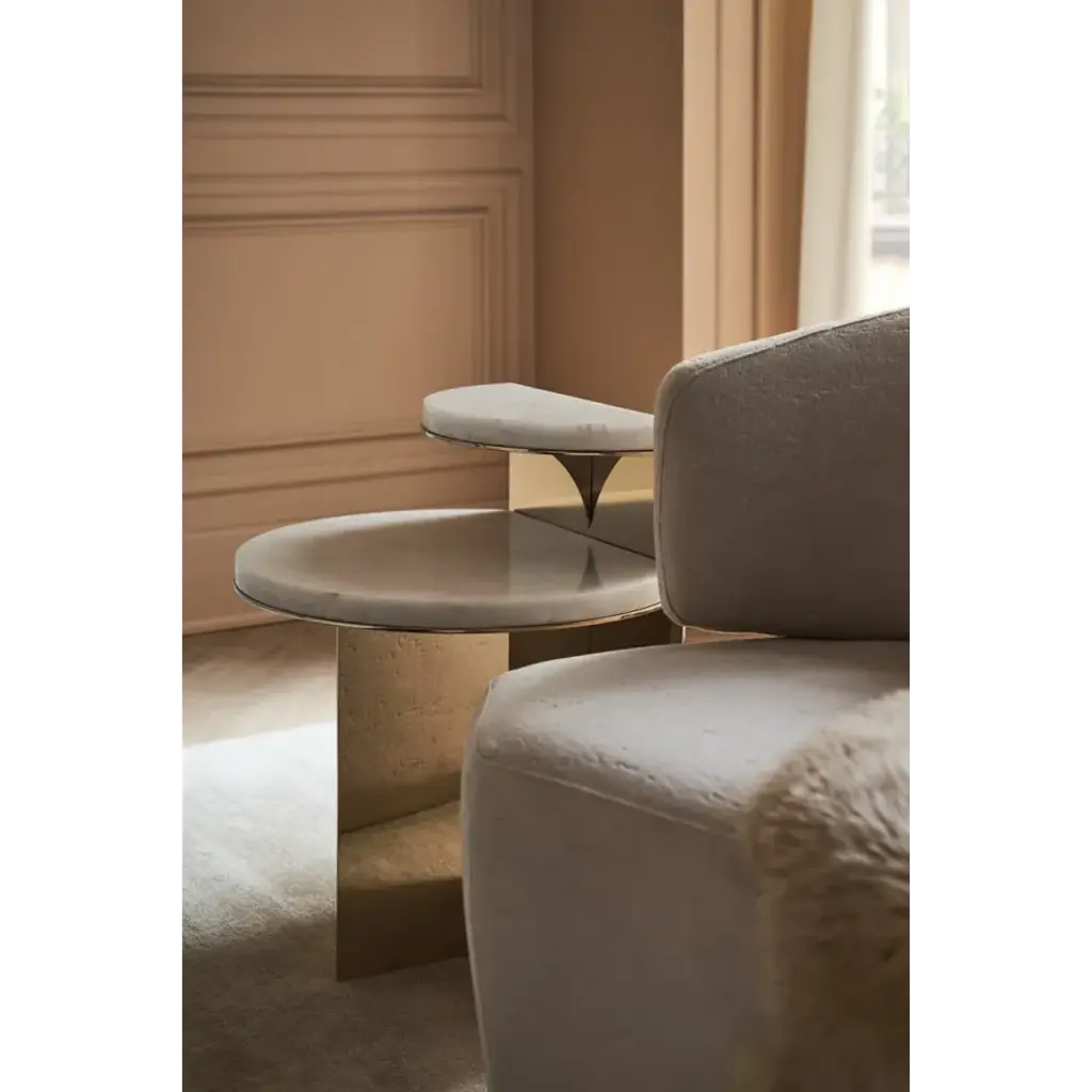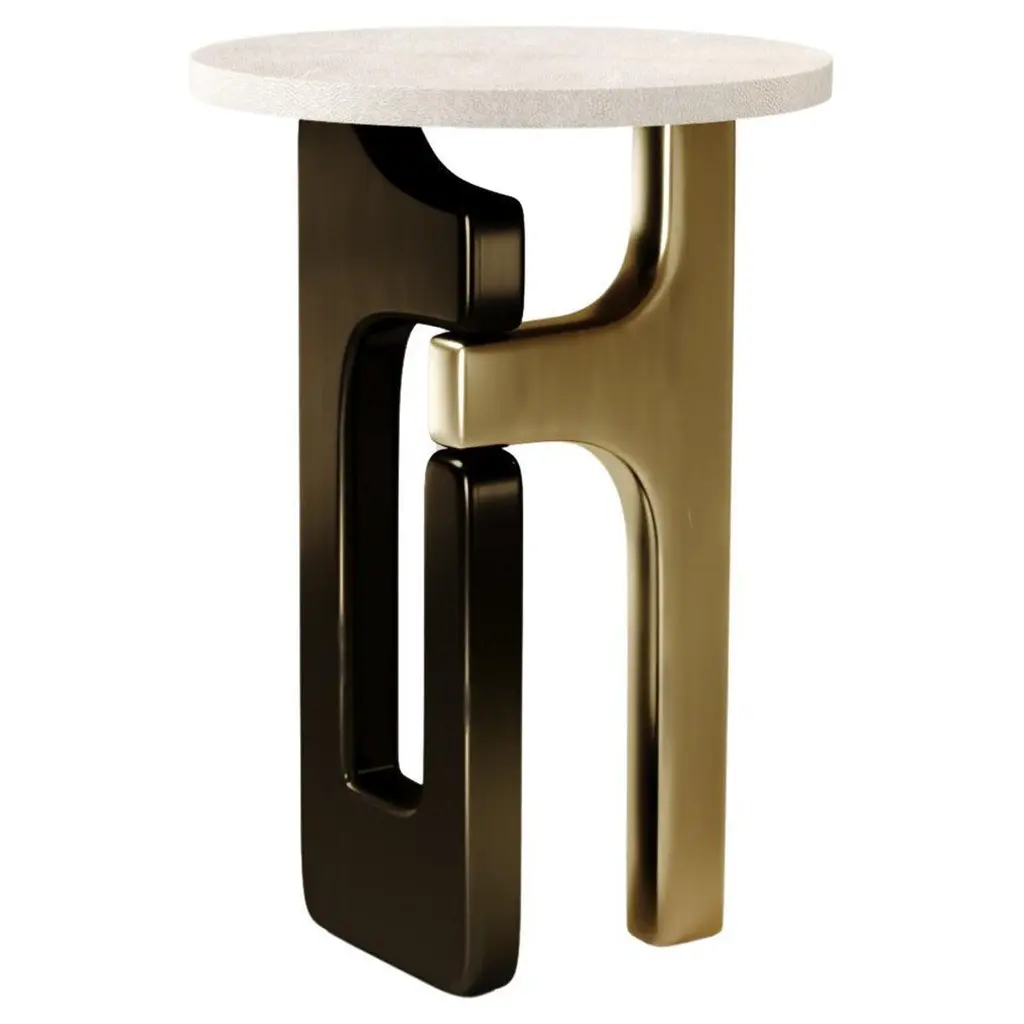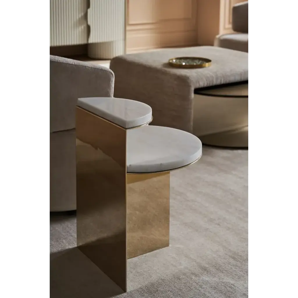 Simple yet elegant with an emphasis on function, this curved end table adds depth and reflection to seating areas. Features two tiers of White Rhino stone atop an angular metal base finished in a Whisper of Gold. A standout on its own, even more memorable in pairs.