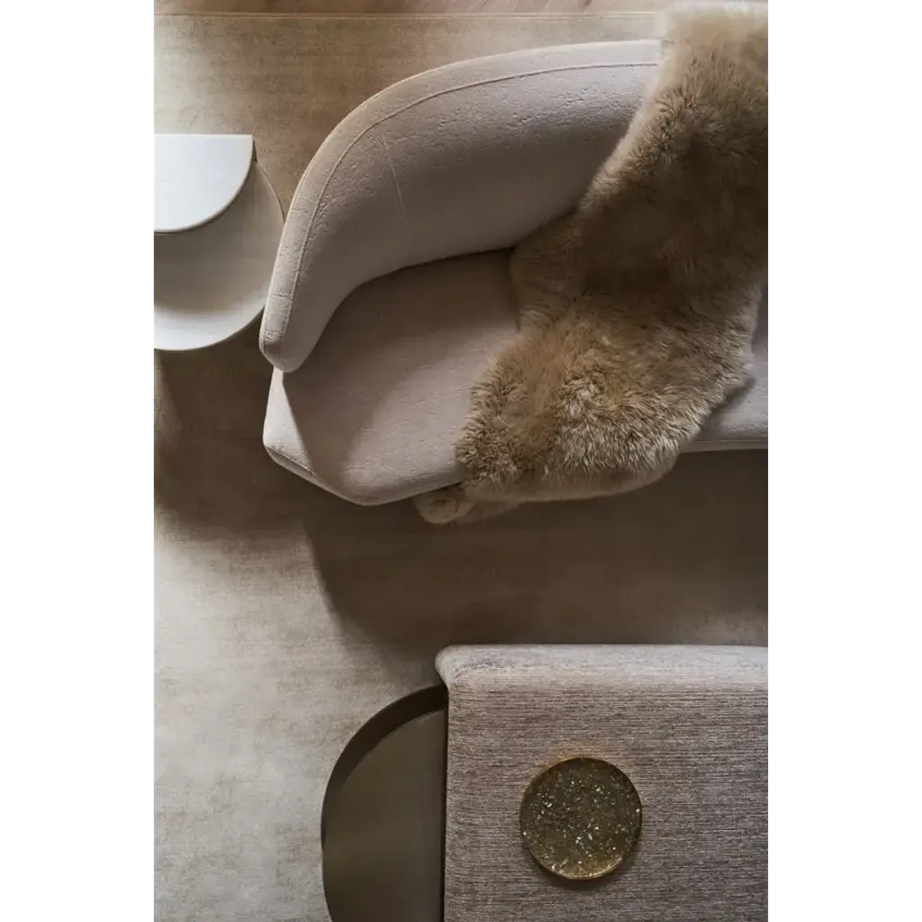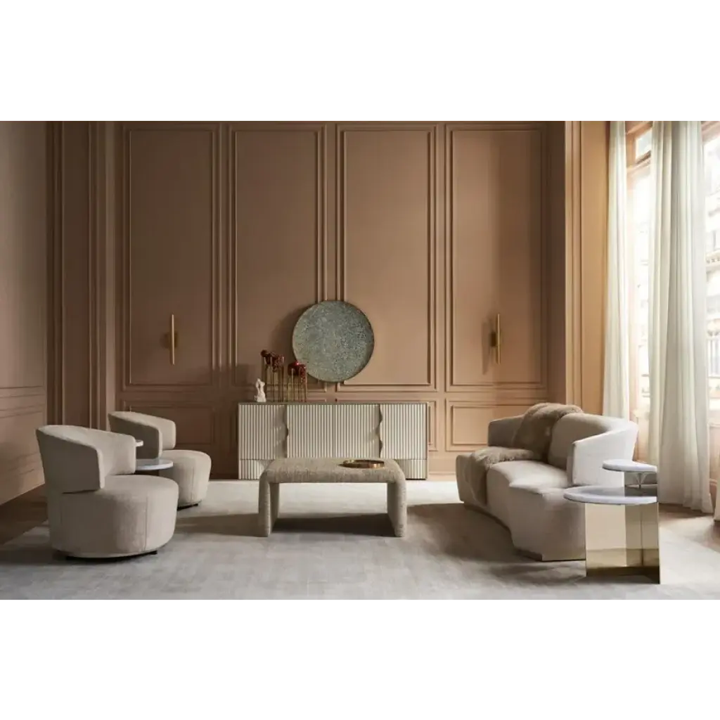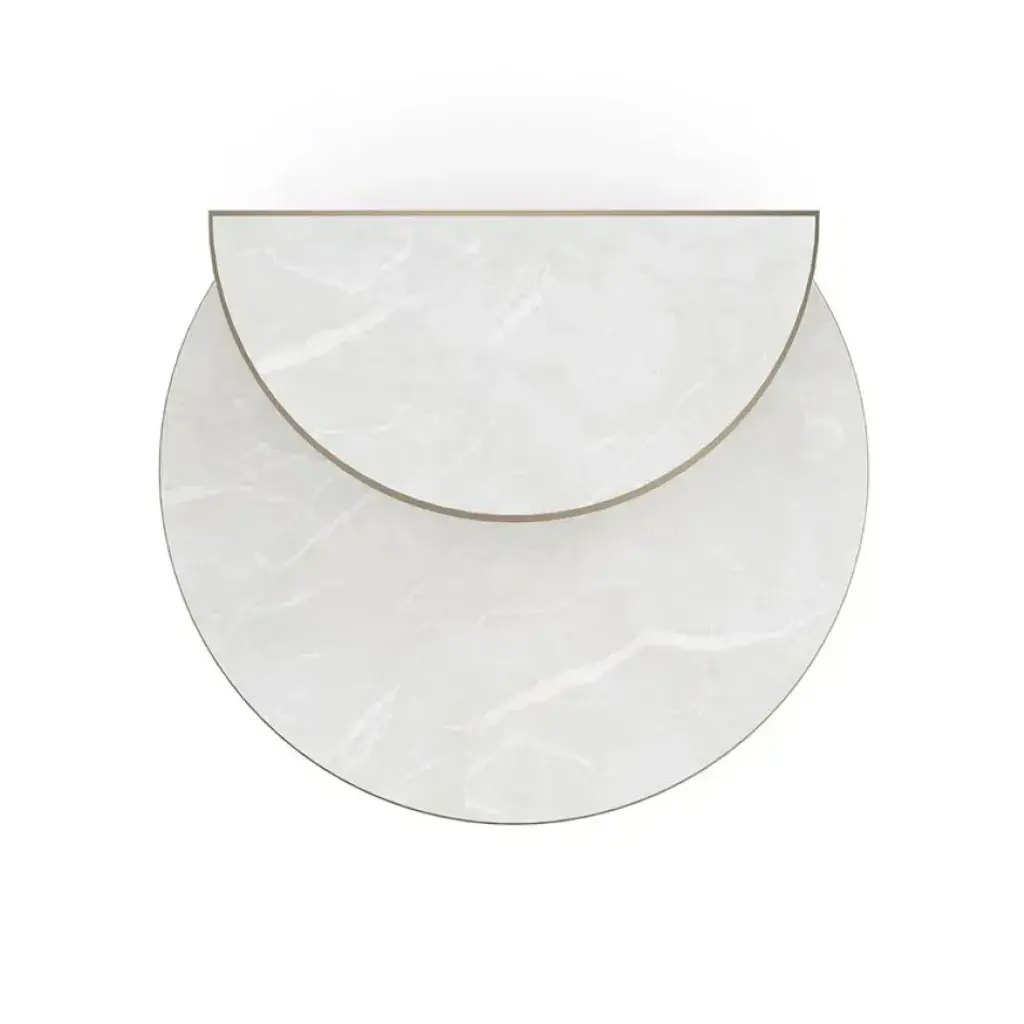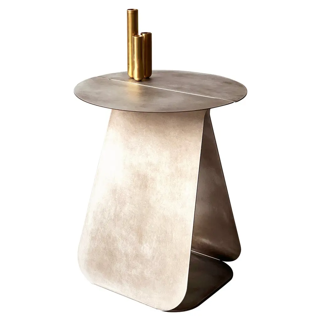 Simple yet elegant with an emphasis on function, this curved end table adds depth and reflection to seating areas. Features two tiers of White Rhino stone atop an angular metal base finished in a Whisper of Gold. A standout on its own, even more memorable in pairs.