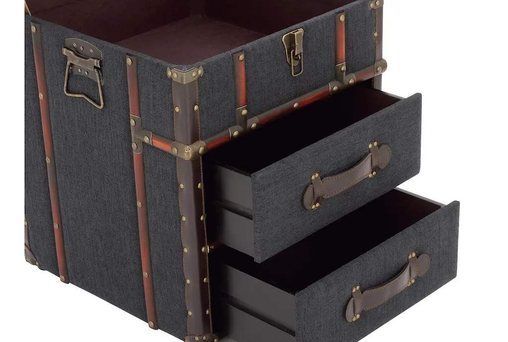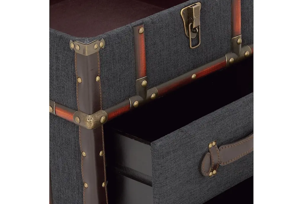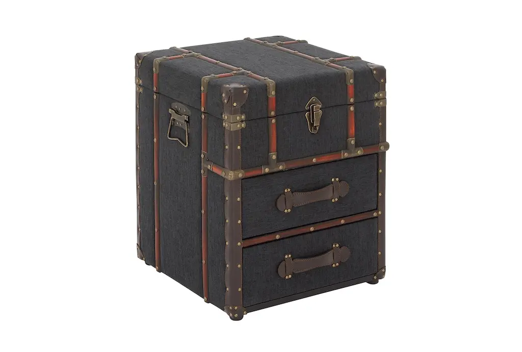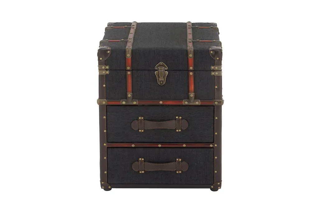 Traditional Style Navy Blue Storage Trunk Chairside Table With 2 Drawers And Leather Trim