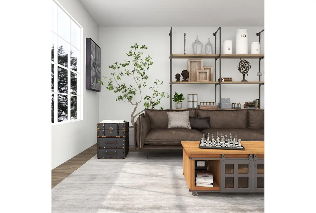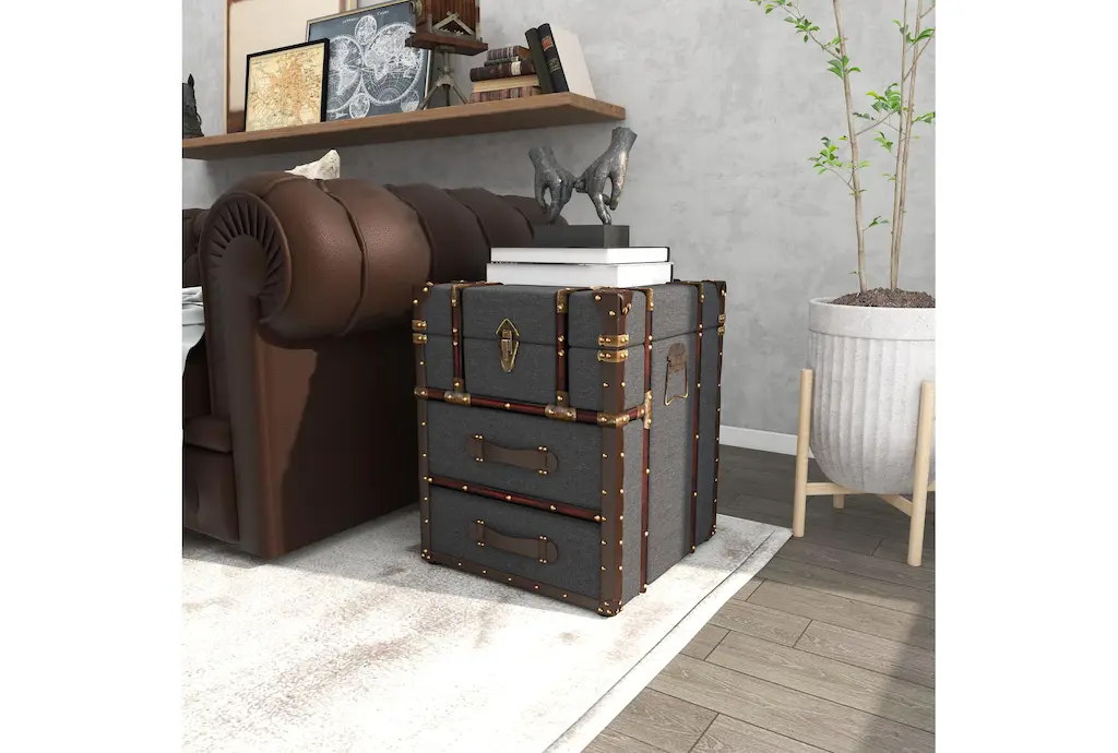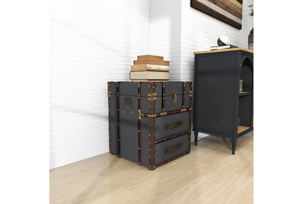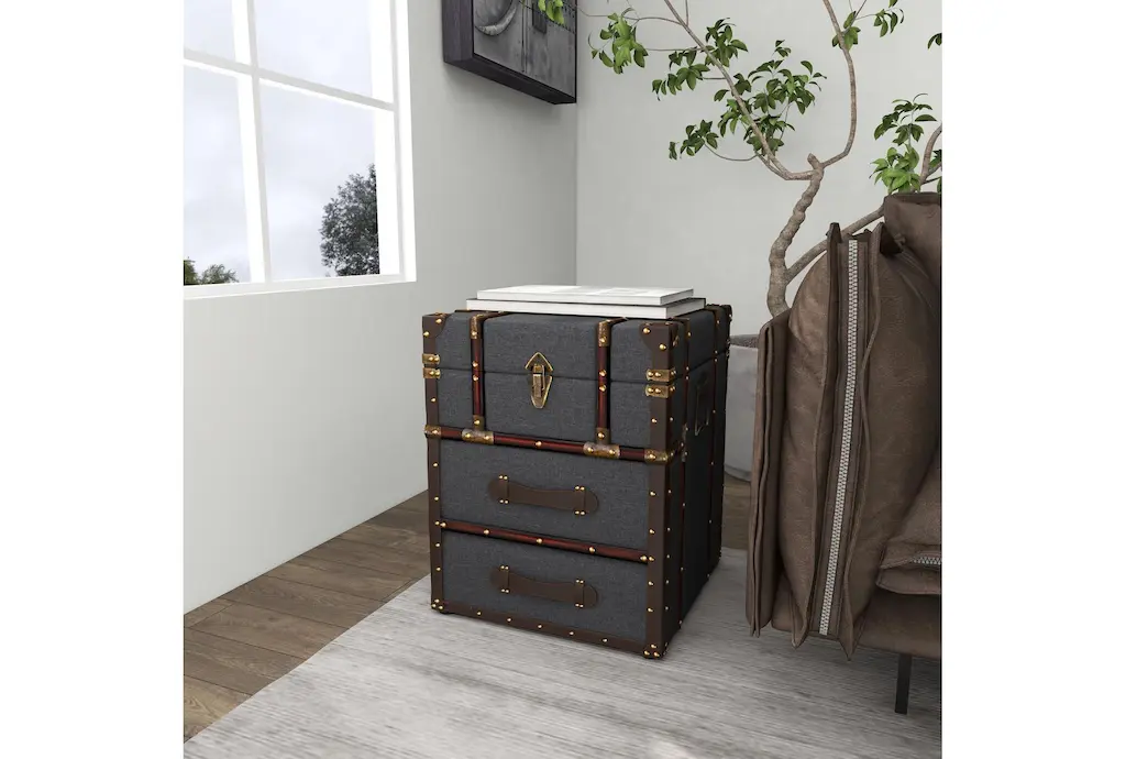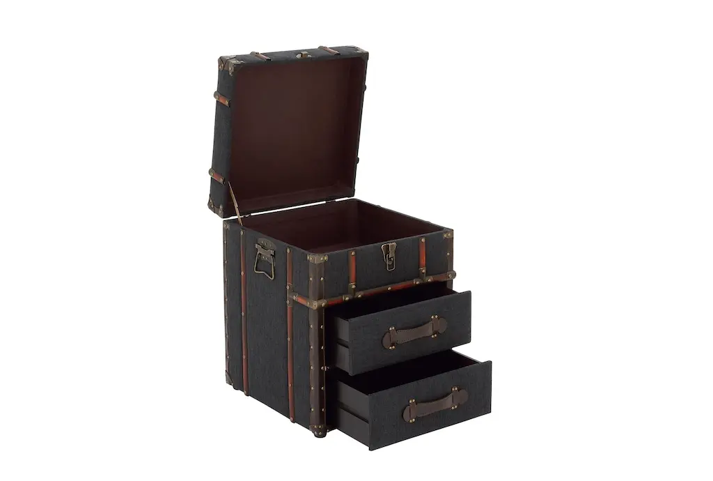 Traditional Style Navy Blue Storage Trunk Chairside Table With 2 Drawers And Leather Trim
