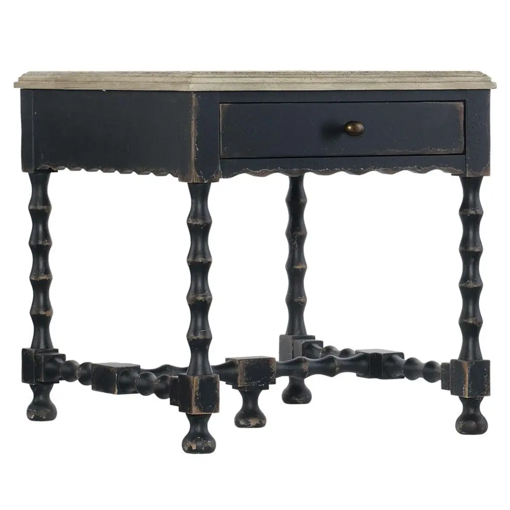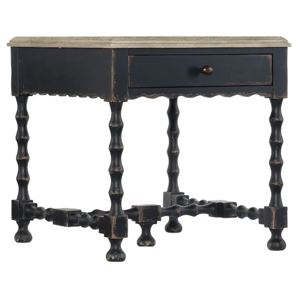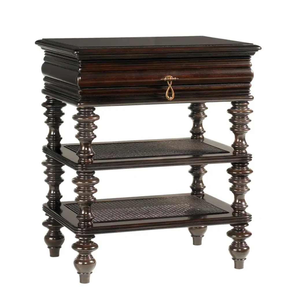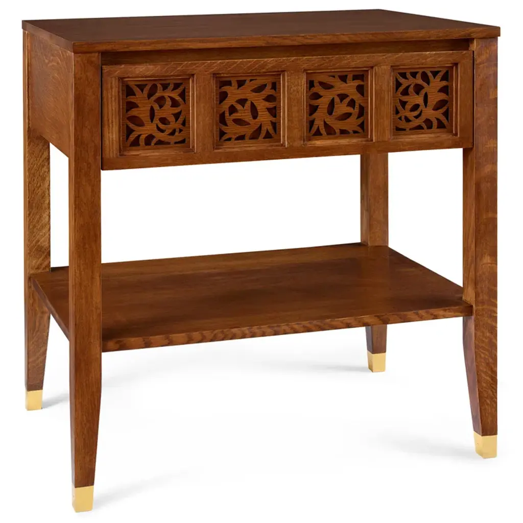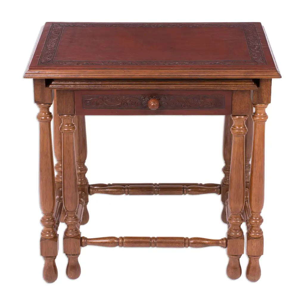 Lavish floral motifs envelop a pair of elegant accent tables. Working in tooled leather on turned tornillo wood, the Rios Family creates two original and useful decorative pieces. The smaller table features a convenient drawer and nests beneath the larger table or stands alone.