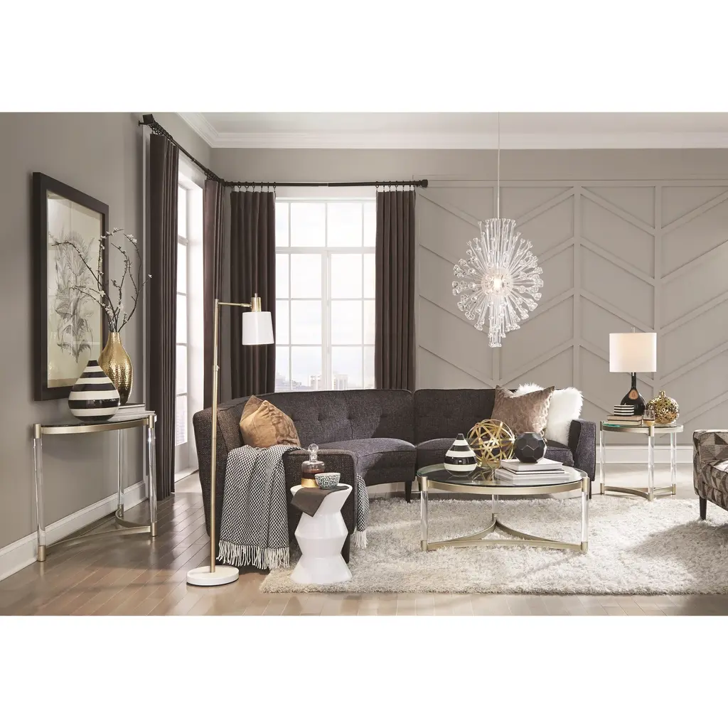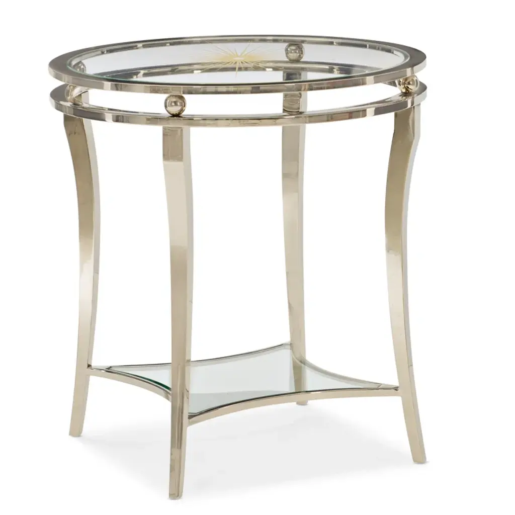 Infuse your space with a breath of fresh air with this sleek metal and glass end table. The table boasts a polished blend of mixed materials from the clear acrylic legs to the graceful metal base with a platinum finish. Not only do the clear legs and top visually open your room, but the polished metal helps catch the light to make your room brighter and more inviting.
