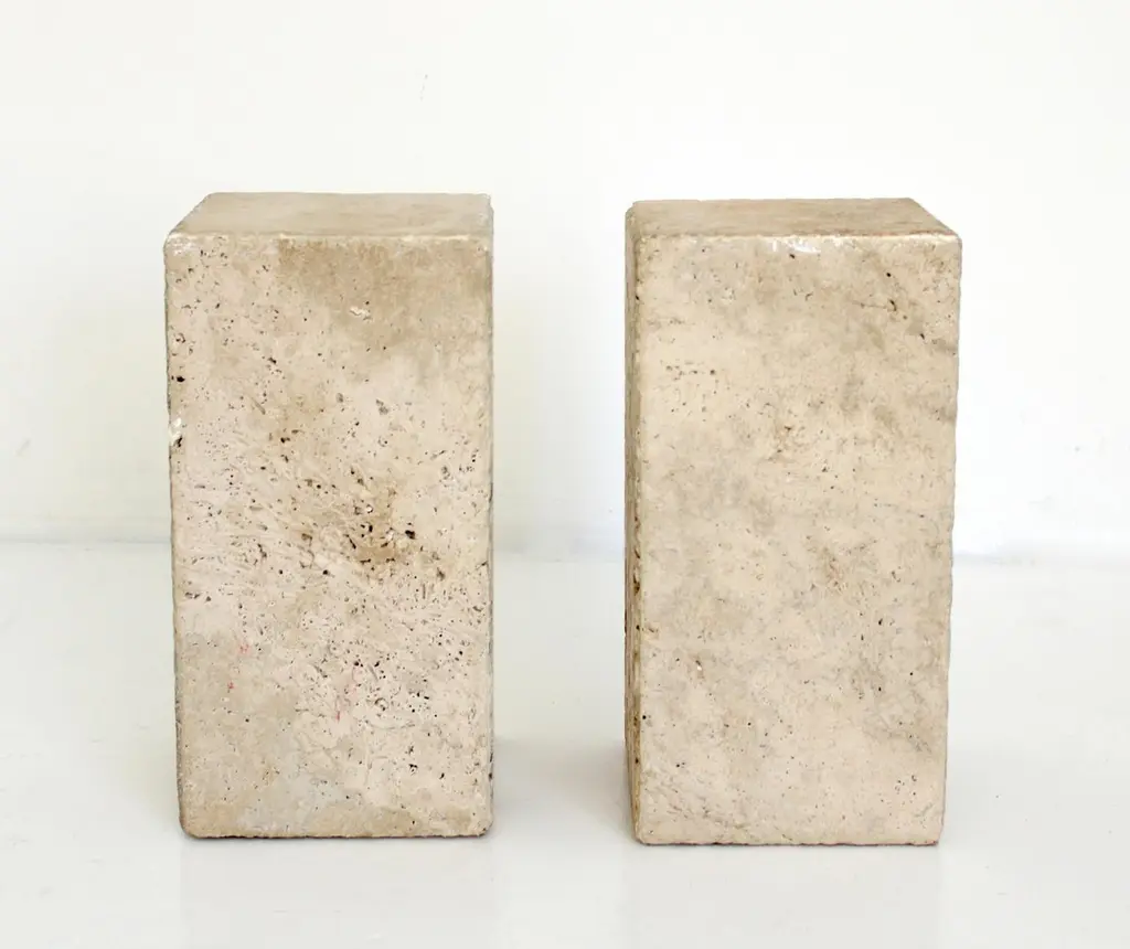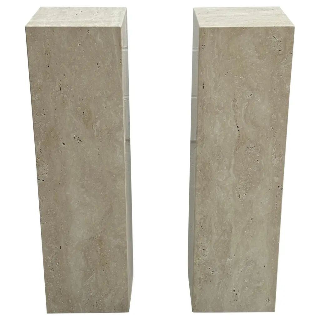 Italian travertine rectangular tall side table, end table or a great drink table.Each table is composed on different travertine slabs making each table unique.Rustic edge travertine table designed by Pavilion Antiques and 20th c.Each slab is chosen for its unique veining and texture.These tables make great side tables or sculpture stands.They are contemporary and may be ordered individually or in multiples.Photo shows a pair. Price per table. Please note that each table will be different as the marble is always different and these photos represent tables that have been made in the past or currently. Each table is unique as the marble is always unique. The edges are always a chiseled edge.Lead time is 2 weeksNot intended for outdoor use. These tables cannot be shipper by fed ex or ups and our private shipper must be used within the USA.
