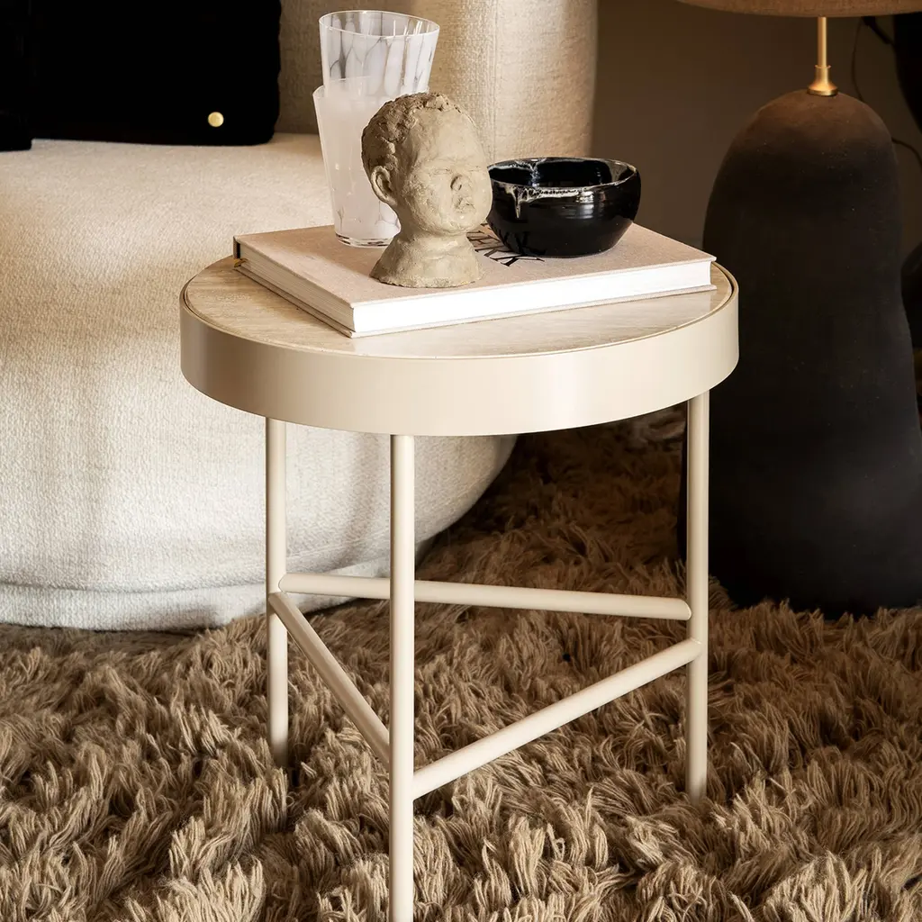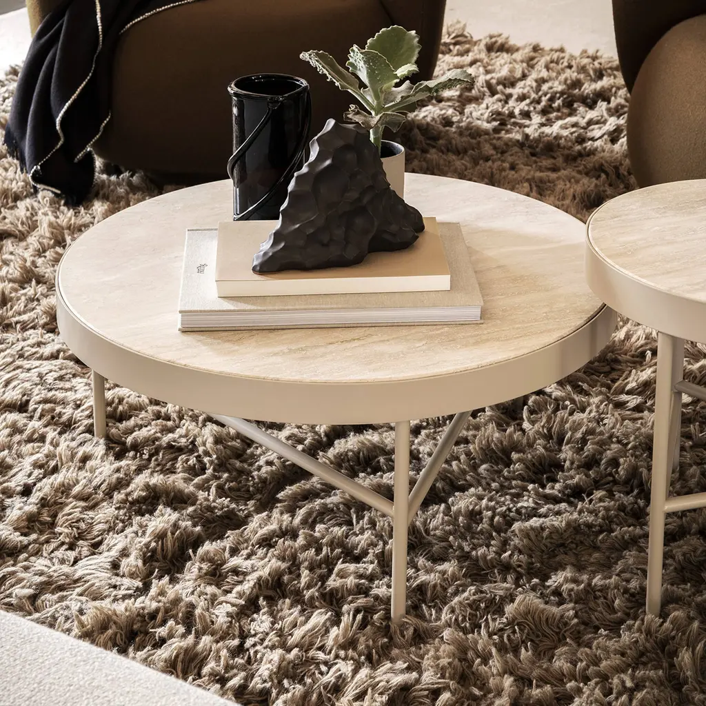 With its earthy light coloration and intriguing textural detailing, Ferm Living conceives a gorgeous table in natural travertine. A functional and beautiful addition to the home, it takes a minimalist turn with the triangulated expression of its powder-coated steel frame. Available in a pair of choices—a larger low coffee table and a smaller side table—it reflects the serene demeanor of the Danish brand’s neutral palette.
