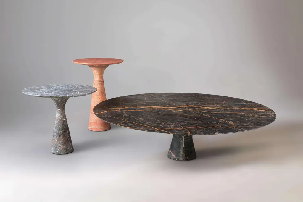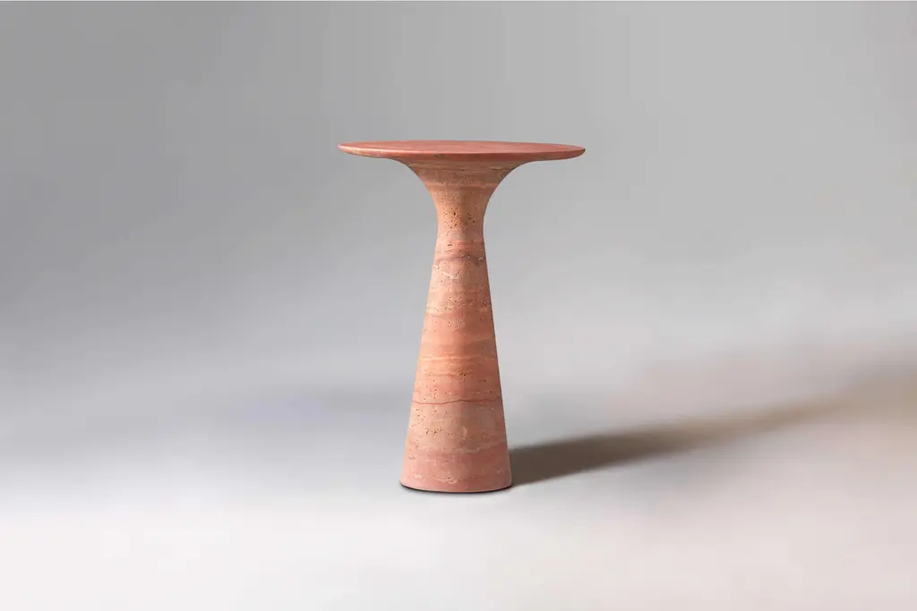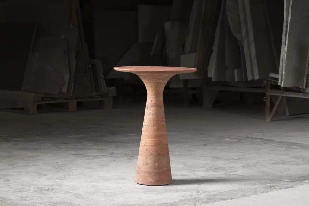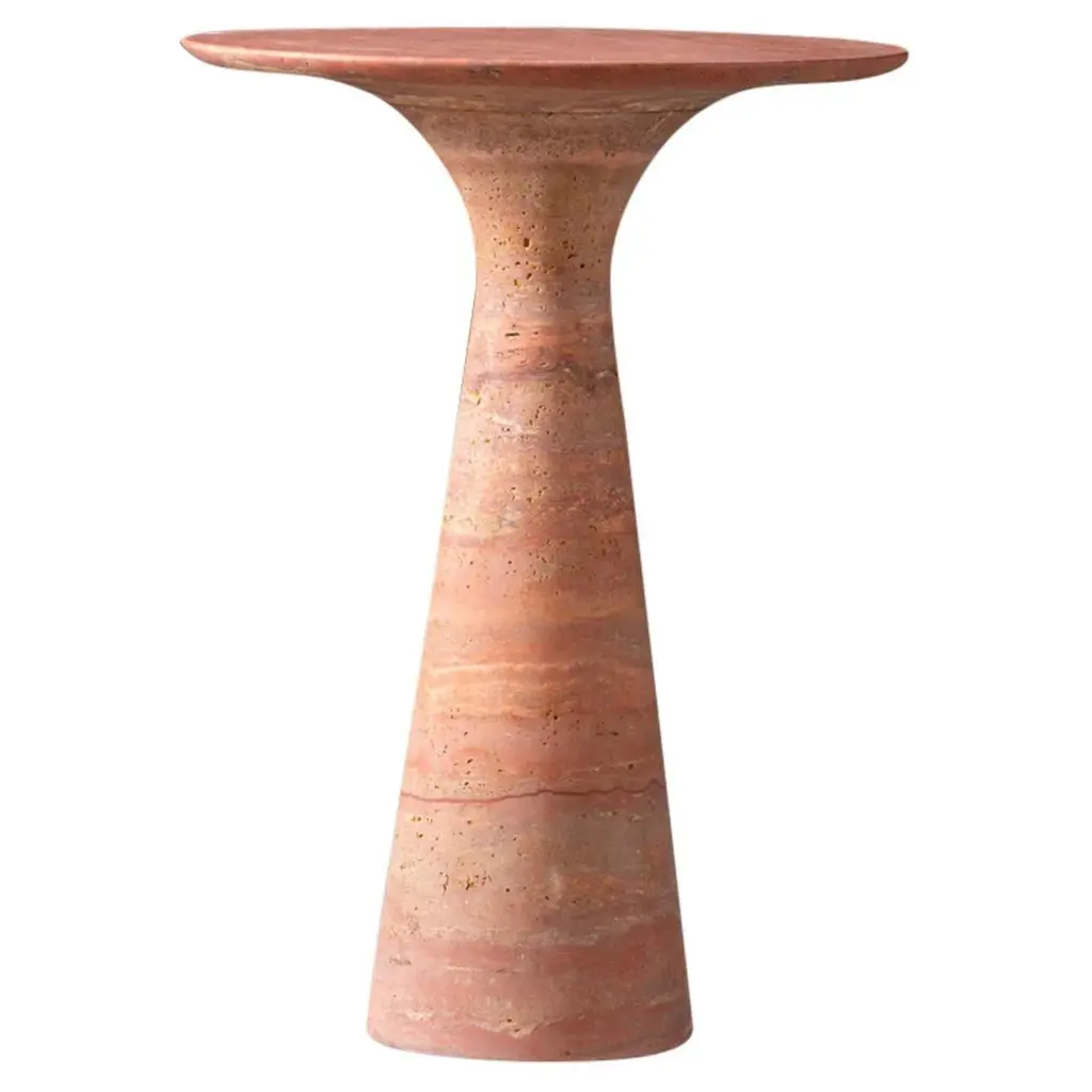 Travertino Rosso refined contemporary marble side table Dimensions: Diameter 62 x height 45 cm Materials: Travertino rosso. Angelo is the essence of a round table in natural stone, a sculptural shape in robust material with elegant lines and refined finishes. The collection consists of a round/oval dining or conference table, side tables and lower tables. Suitable for both indoor and outdoor use! All tables are made by order and finished by hand to be sure that the tabletop and base become one piece The basic collection consists of 9 different marbles and different standard dimensions, however on request we make to measure. Almost any size or marble is possible! All tables are signed and numbered (the low and side tables are only signed). All tables are impregnated with Lithofin Nanotop. This protection is not visible and the marble keeps its natural look and feel. With the delivery of every table, a maintenance set of Lithofin is included. The design Angelo is the essence of a round or oval table in natural stone, it features a sculptural form, sturdy material, an elegant line and a refined finish. Two elements, table base and top, form one whole together. The bottom is one running curve from table foot to edge. The conical connection creates a stabile whole. To show the marble in it’s most expressive character, different finishes are possible (polished, honed, brushed, striped, sandblasted & brushed). The basic collection consists of nine different types of marble and different sizes. On request this design can be executed in almost any type of marble and on measure. This table is perfectly suitable in a housing, retail or office environment. As the table is supported by one central foot it creates a lot of flexibility in seating. Executed in hard variations of natural stone suited for external use, this design can be a perfect garden table or sculpture.