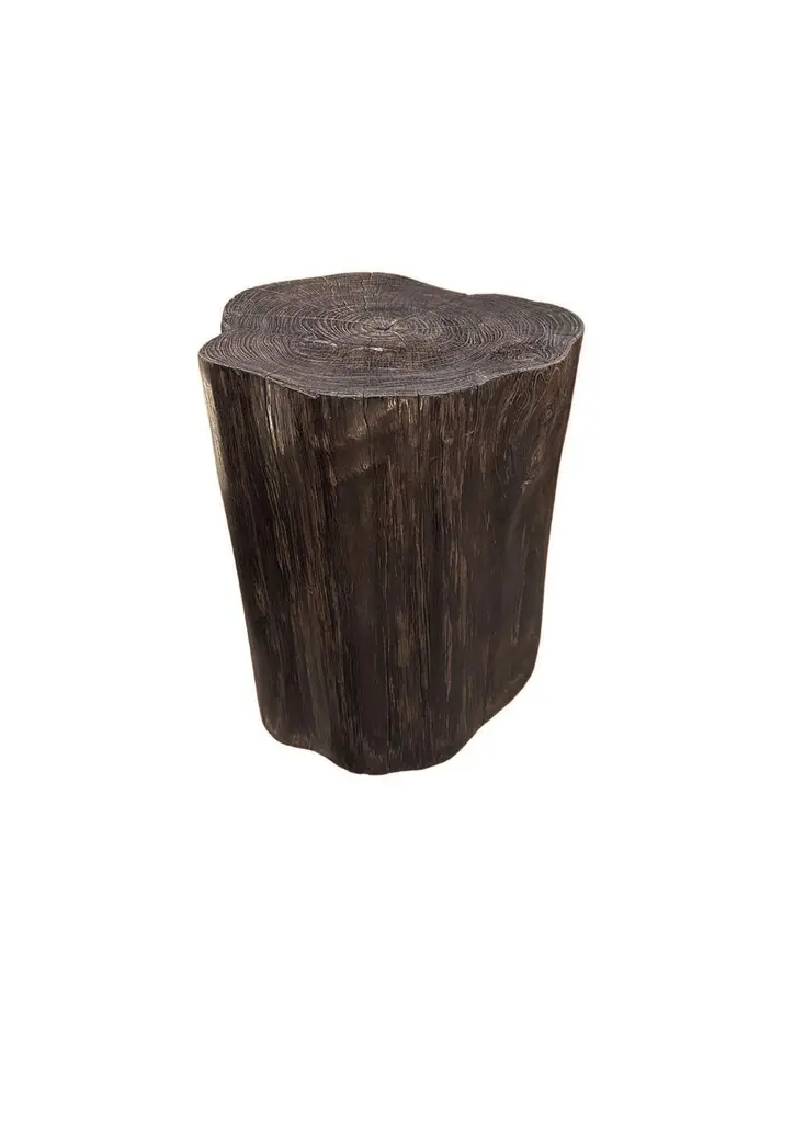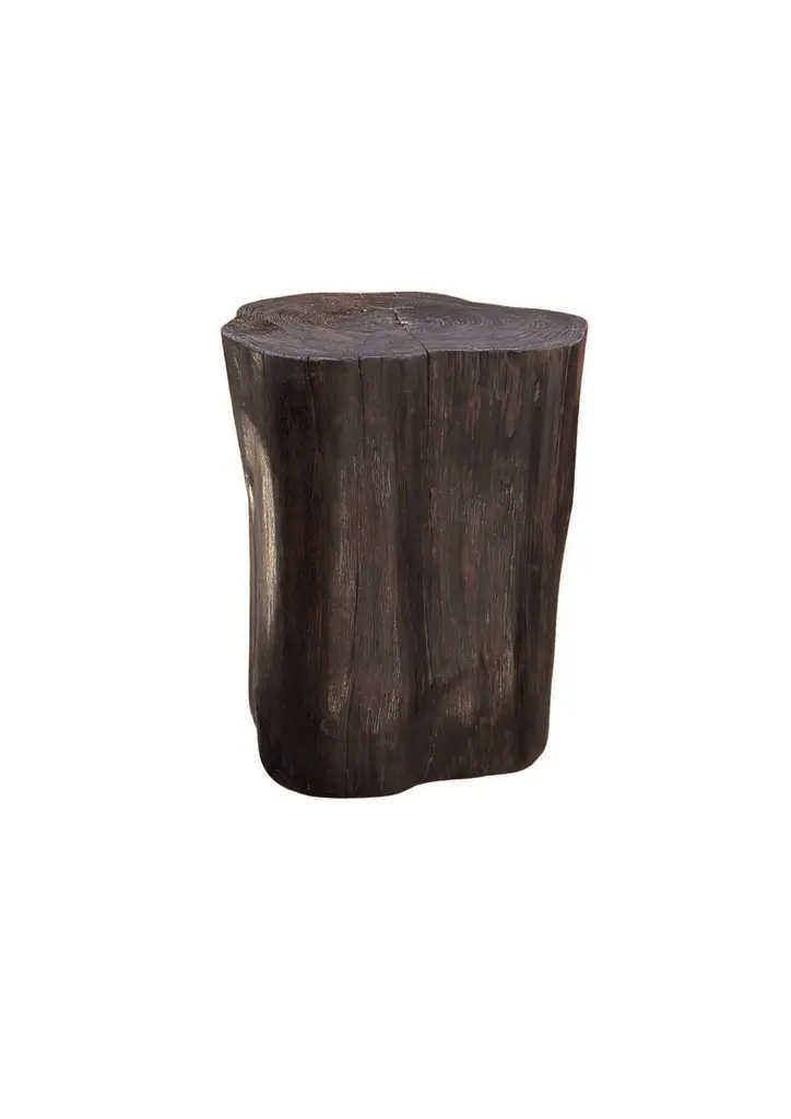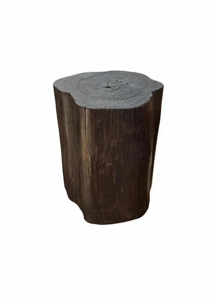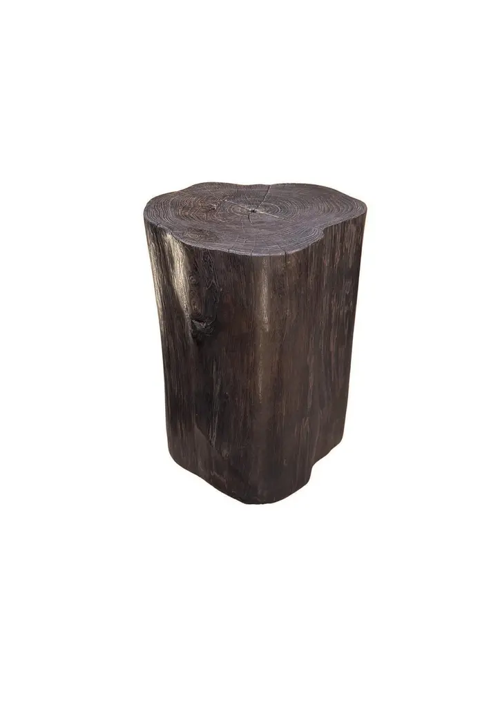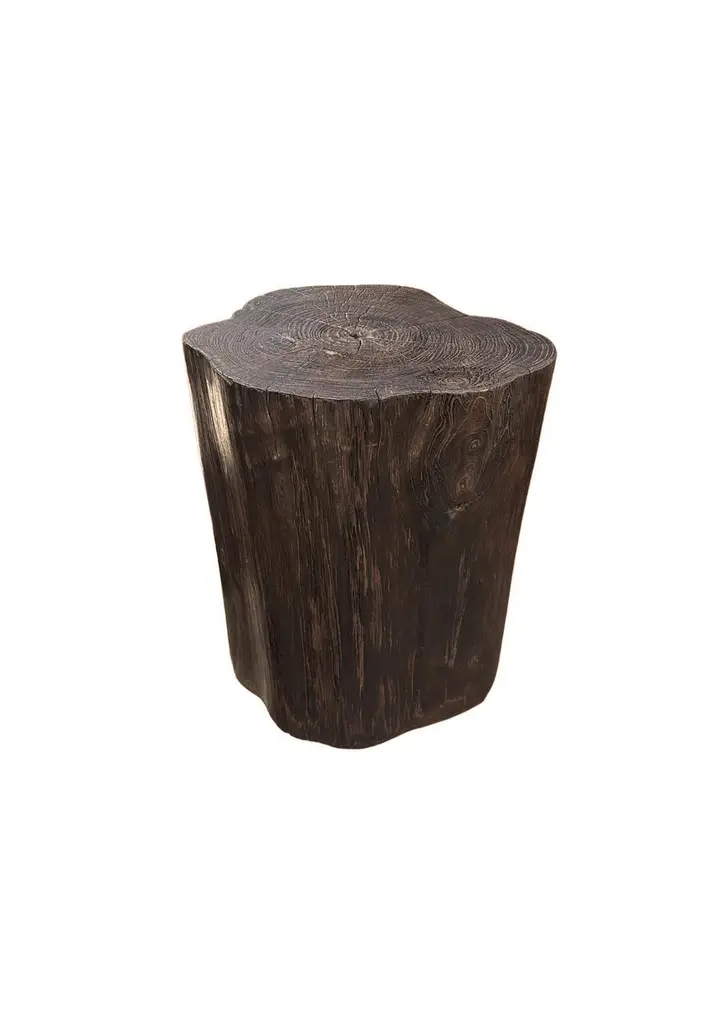 A wonderfully organic round side table. Its neutral pigment and subtle wood texture makes it perfect for any space. This table was crafted from a solid trunk of teak wood. The mix of shades and textures add to its charm. To achieve its tone the wood was burned several times.