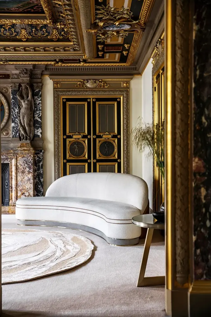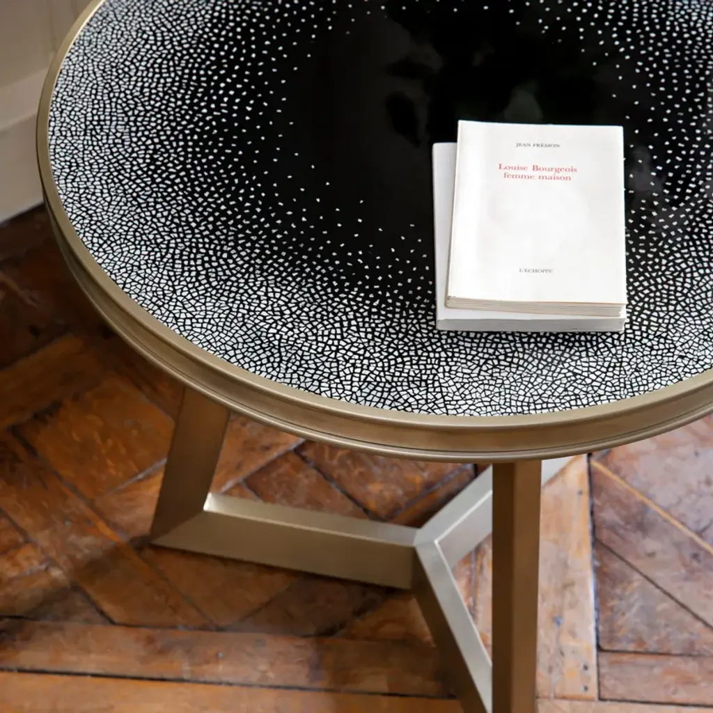 Neither too tall, nor too low, the multi-purpose Trévise table is perfect for working, dining or just spending time together.Its minimalist lines are poetically highlighted by the eggshell design painstakingly applied by hand onto a dark coloured lacquer background.Brass base. Brass strapping.Lacquer tray inlaid by hand with eggshells.PREMIERACTE is the reflection of a French-style art of living, showcasing strong savoir-faire and ‘Couture’ detailing. Planned as a set for a luxurious suite, the furniture creations, designed on the principle of an all-enveloping double skin, invite relaxation and immerse us in exclusive universe. PREMIERACTE is designed by Atelier Tristan Auer, Wilson Associates, produced and edited by Red Edition and set-dressed by Lelièvre Paris