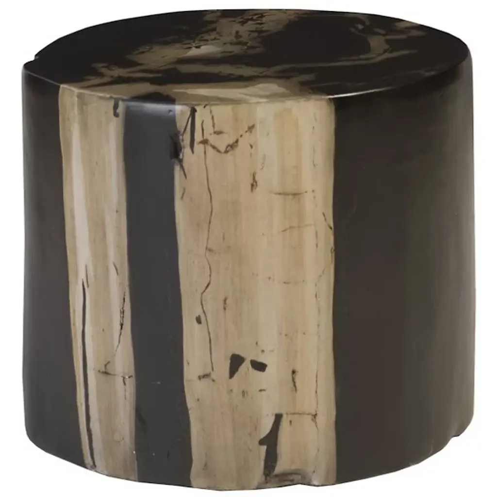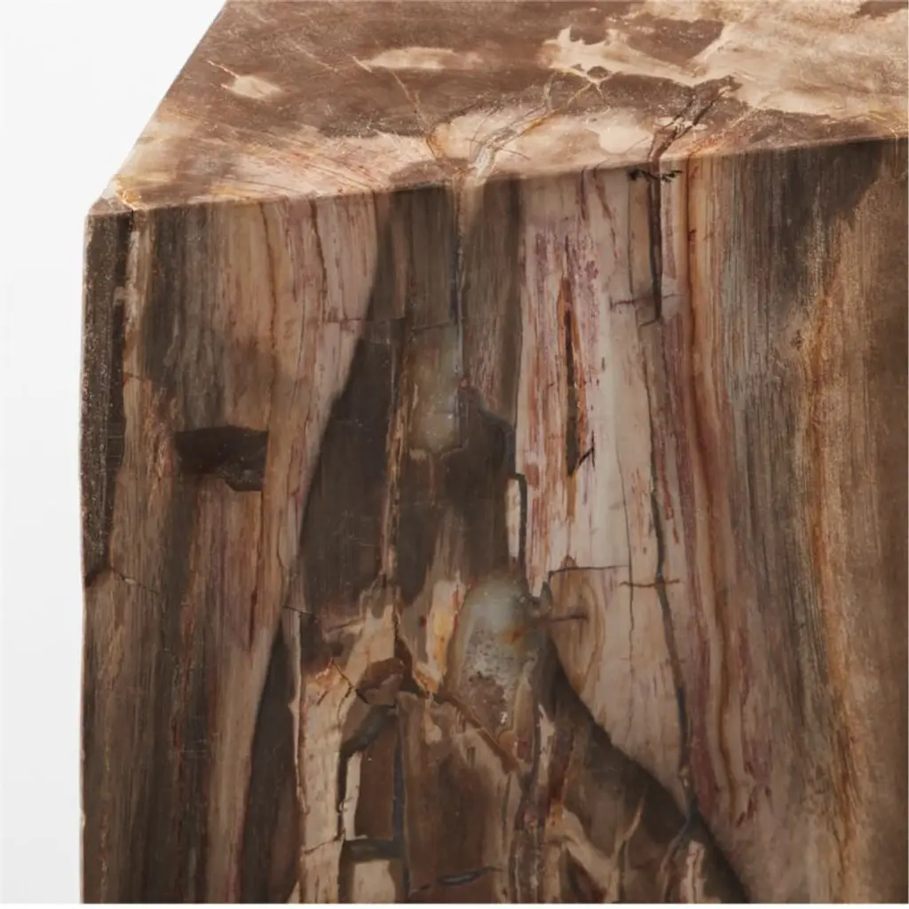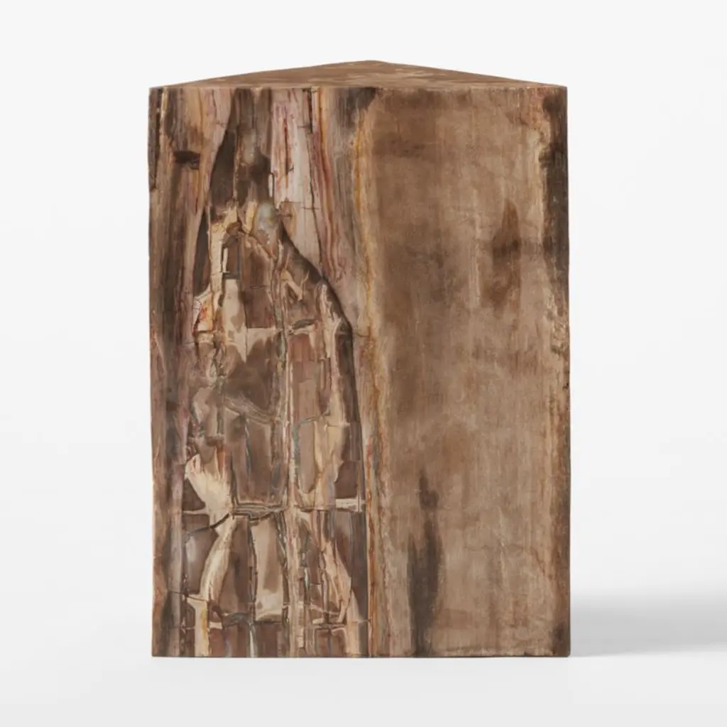 Ancient material is transformed into modern geometric form in the Tri Petrified Wood Side Table. Coalescing the warmth of wood with the deep veining of stone, petrified wood is literally one turning into the other. When cut and polished, the stone's rich striations of charcoal, ochre and pearl-grey emerge strikingly. Each three-sided table has its own ancient history, so variations in coloring and knot pattern and placement will occur. CB2 exclusive.