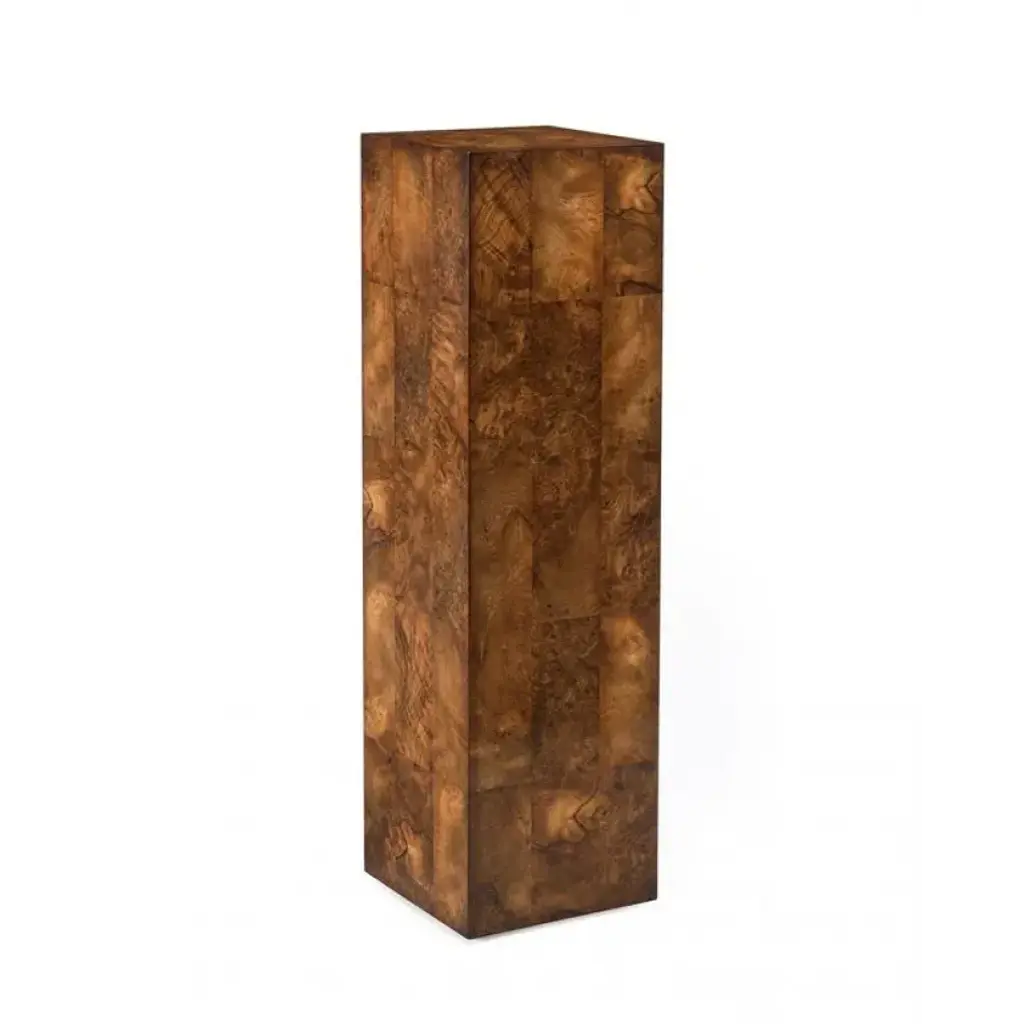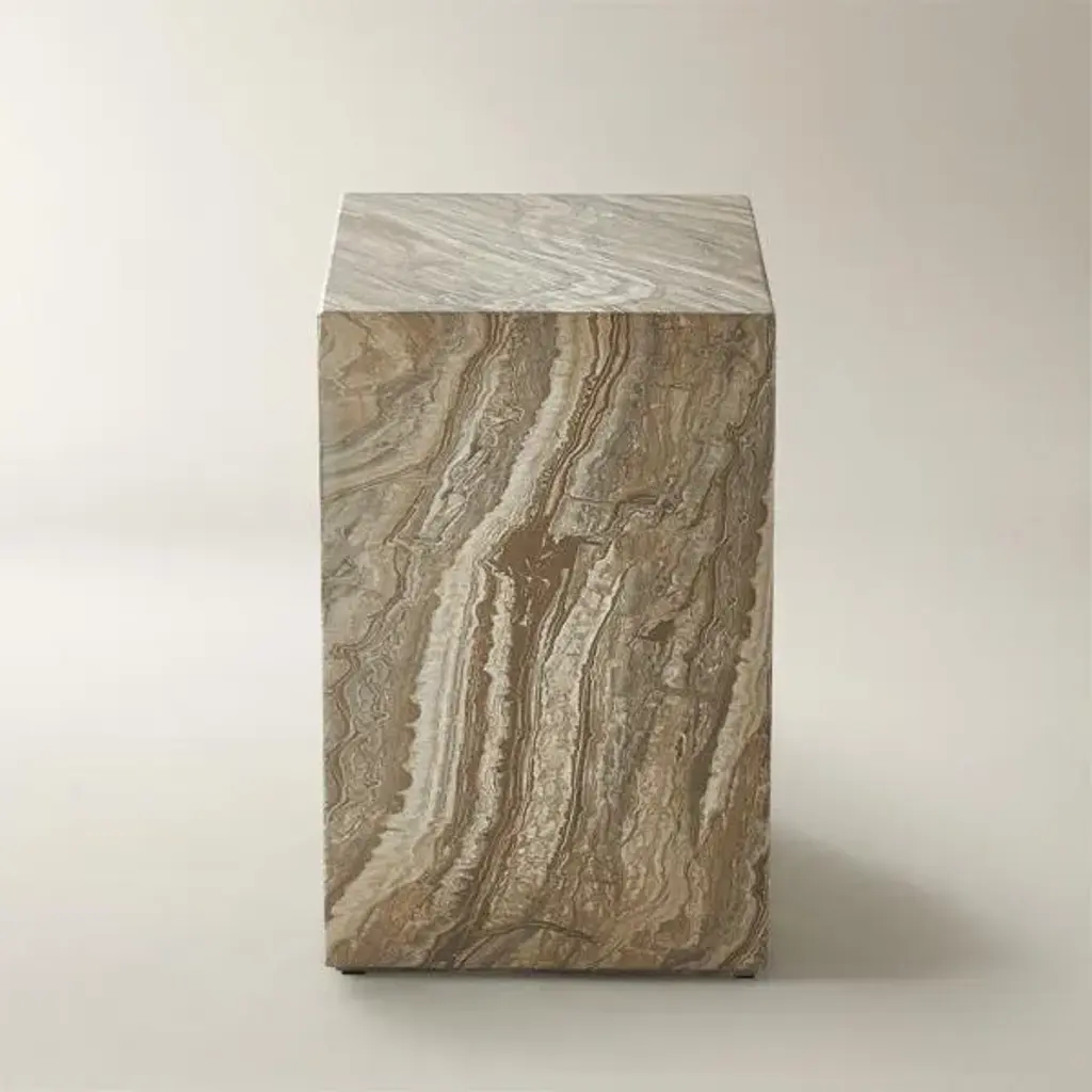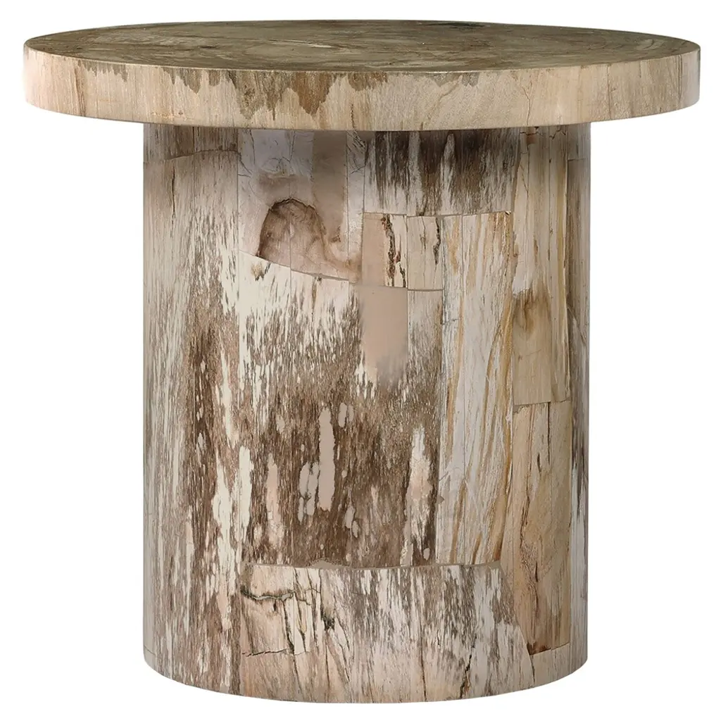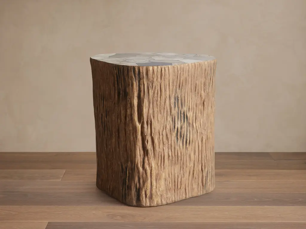 Ancient material is transformed into modern geometric form in the Tri Petrified Wood Side Table. Coalescing the warmth of wood with the deep veining of stone, petrified wood is literally one turning into the other. When cut and polished, the stone's rich striations of charcoal, ochre and pearl-grey emerge strikingly. Each three-sided table has its own ancient history, so variations in coloring and knot pattern and placement will occur. CB2 exclusive.