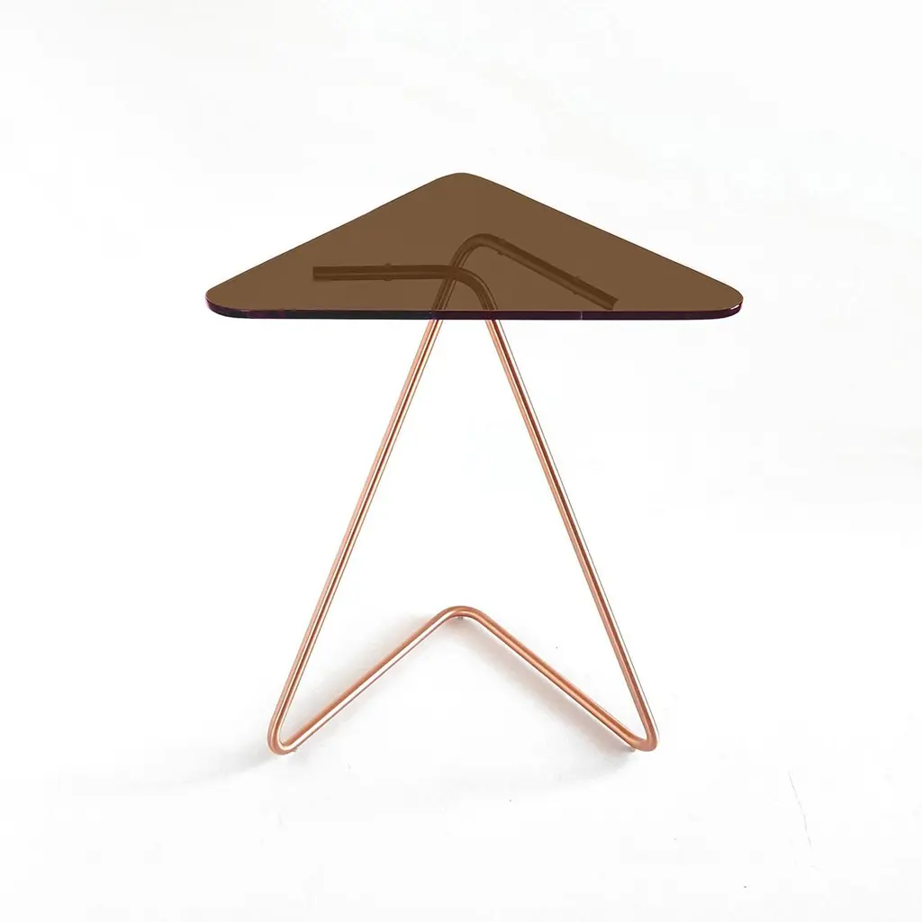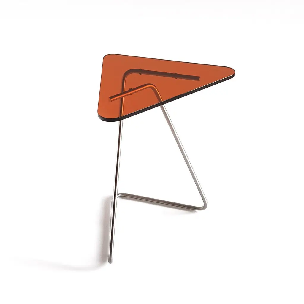 The triangle side table by Rita Kettaneh Dimensions: The base: brushed stainless steel optionally plated with copper or brass The top: acrylicMaterials: H 49.5 x W 41 x D 9.5 cmWeight: 2.6 KgColors and finishes: Stainless finish: Burnt orange, maya blue, cherry red, navyCopper finish: Light pink, brownBrass finish: Mint green The crystal tables are proudly produced in Lebanon by combining top notch industrial methodswith authentic craftsmanship. The result is high quality products that capture the delicateness ofthe human touchThe Triangle is one of the side tables in the award-winning Crystal Tables Collection designed by RitaKettaneh. Inspired by the crystal's transparency, purity, and geometry, The Triangle has a geometric identity which influences its entire shape and various silhouettes.Rita Kettaneh designs furniture that is unique, playful and meaningful. She seeks to make the experience of owning furniture an inspiring one where pieces evoke an emotion within their users. With an engineeringfoundation, an entrepreneurial specialisation, and experience in marketing and design, she brings in amultitude of perspectives when designing her products. Rita won the A’ Design Award for The Crystal Tables and has participated in exhibitions in Como, Beirut, Dubai, and Berlin.KRAY Studio is an emerging furniture brand that seeks to make the experience of owning furniture more meaningful and beautiful. Our vision is for you to connect with the pieces of furniture so your home starts resonating with you and becomes a space of discovery and restored vitality. We introduce a new kind of luxury, that is socially aware, spatially smart, all the while being fresh and contemporary. Designed by Rita Kettaneh, our high end pieces are produced by collaborating with local fabricators and craftsmen to preserve the authenticity of the craft and the delicateness of the human touch.