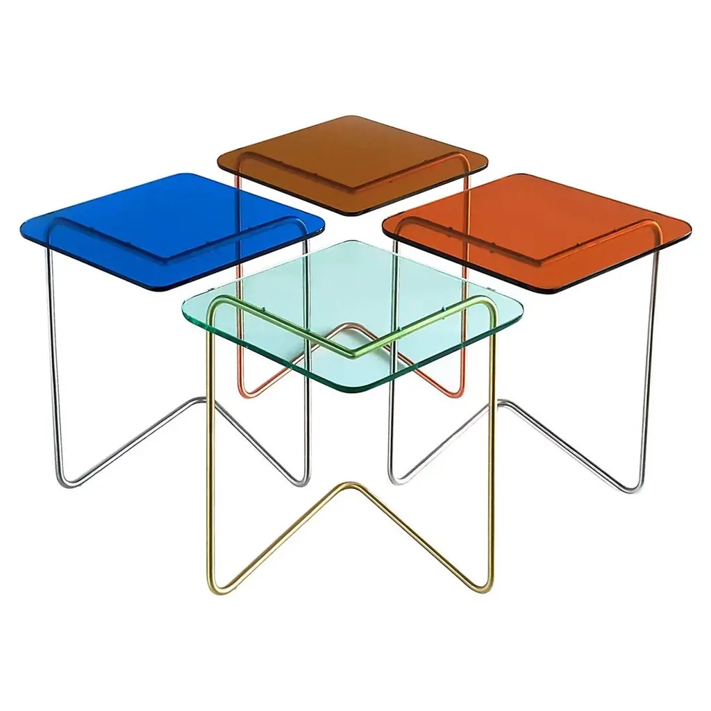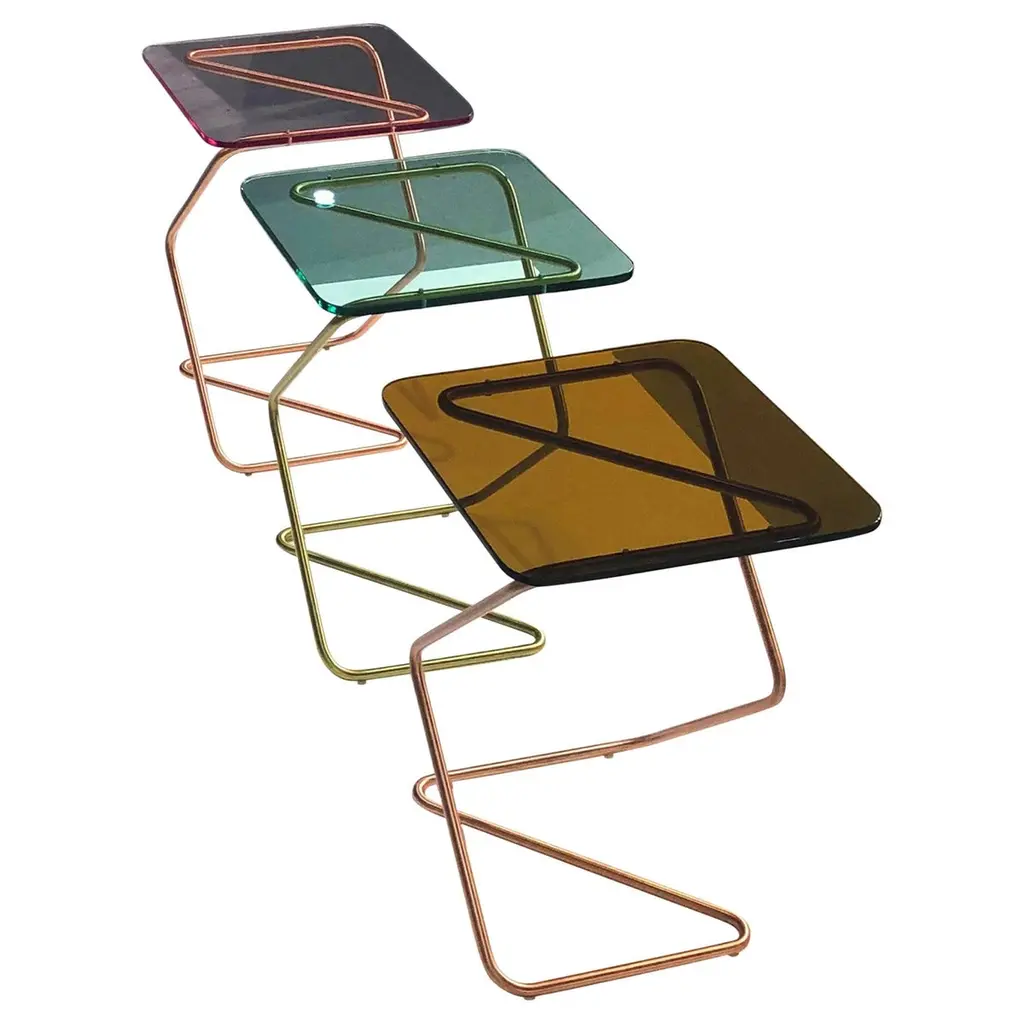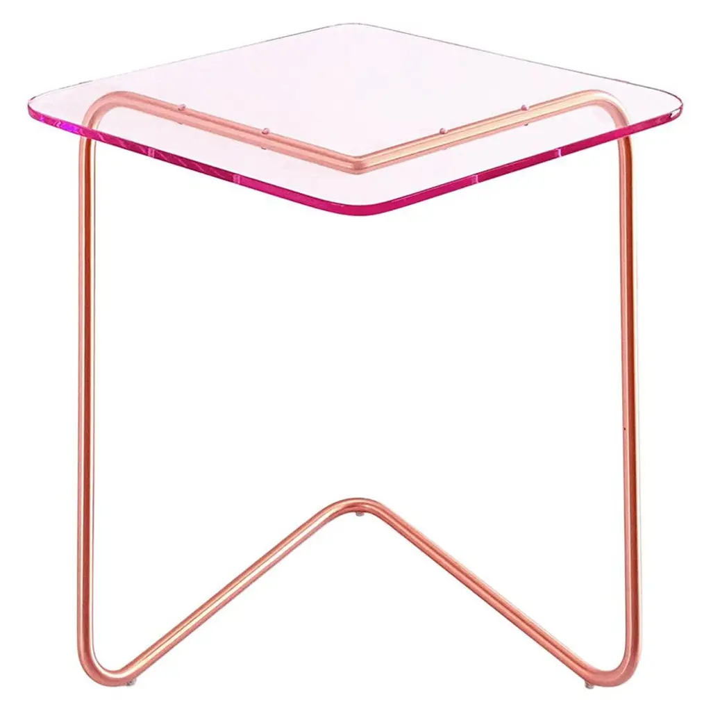The triangle side table by Rita KettanehDimensions: The base: brushed stainless steel plated with copperoptionally plated with copper or brassThe top: AcrylicMaterials: H 49.5 x W 41 x D 9.5 cmWeight: 2.6 KgColors and finishes:Stainless finish: Burnt orange, maya blue, cherry red, navyCopper finish: Light pink, brownBrass finish: Mint green.The crystal tables are proudly produced in Lebanon by combining top notch Industrial methodswith authentic craftsmanship. The result is high quality products that capture the delicateness ofthe human touchThe triangle is one of the side tables in the award-winning Crystal Tables Collection designed by RitaKettaneh. Inspired by the crystal's transparency, purity, and geometry, The Triangle has a geometric identity which influences its entire shape and various silhouettes.Rita Kettaneh designs furniture that is unique, playful and meaningful. She seeks to make the experience of owning furniture an inspiring one where pieces evoke an emotion within their users. With an engineeringfoundation, an entrepreneurial specialisation, and experience in marketing and design, she brings in amultitude of perspectives when designing her products. Rita won the A’ Design Award for The Crystal Tables and has participated in exhibitions in Como, Beirut, Dubai, and Berlin.KRAY Studio is an emerging furniture brand that seeks to make the experience of owning furniture more meaningful and beautiful. Our vision is for you to connect with the pieces of furniture so your home starts resonating with you and becomes a space of discovery and restored vitality. We introduce a new kind of luxury, that is socially aware, spatially smart, all the while being fresh and contemporary. Designed by Rita Kettaneh, our high end pieces are produced by collaborating with local fabricators and craftsmen to preserve the authenticity of the Craft and the delicateness of the human touch..