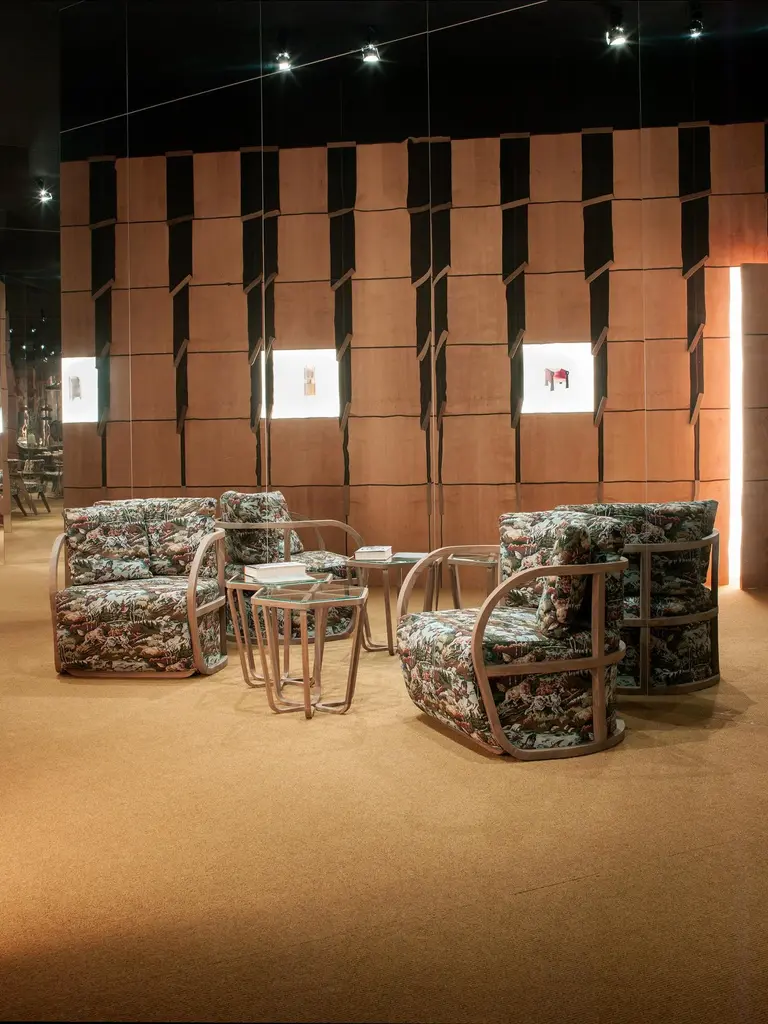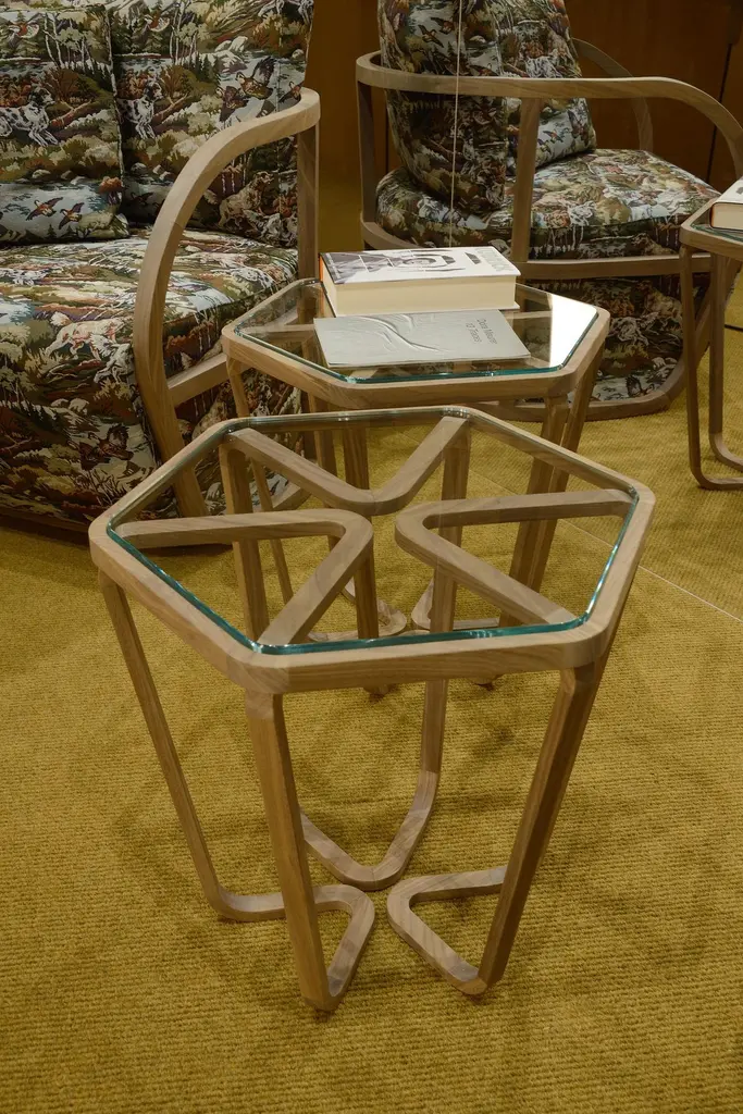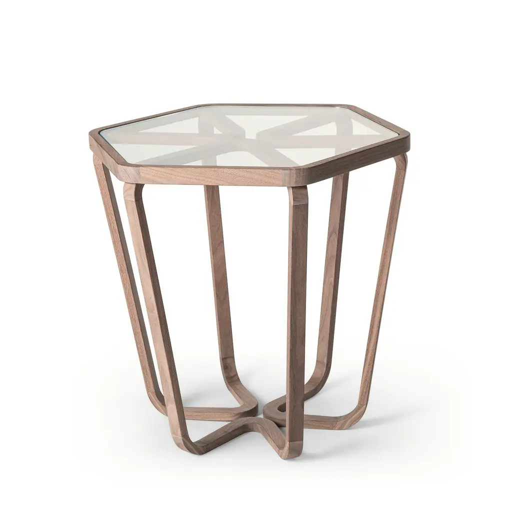 Trifolio is a coffee table with a hexagonal shape made with a walnut wood structure shaped from solid wood and rounded angles. The diverging legs create an illusion of dynamism that changes based on the observer's point of view. The sections of the wooden elements, legs, and the supporting edge of the top, intersect each other to form a structural joint that defies static conventions.The top is made of 8m transparent tempered glass and adds an additional level of visual complexity, allowing you to observe the intersections of lines between top and legs which amplify the three-dimensional perception.
