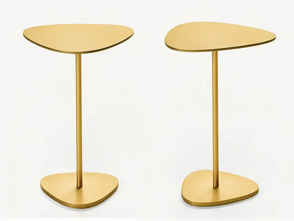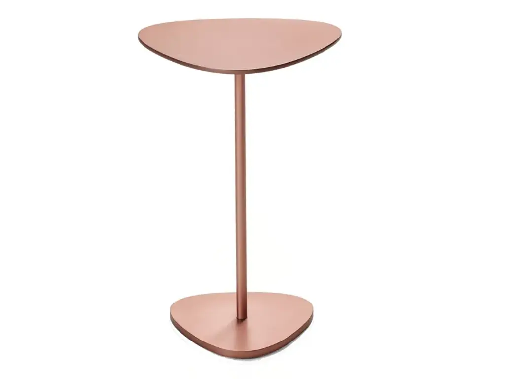 Trigon is a pedestal side table in nanoceramic coated steel. Materials: Satin Nickel, Bronze, Satin Brass, Gunmetal nanoceramic coated solid steel. The BassamFellows Trigon Pedestal Side Table utilizes a triangular shape to provide a directional edge for lounge seating while allowing better clustering. Softened edges create a “guitar pick” shape that is more abstract and sculptural allowing for different layouts without looking messy. The table was the result of numerous experiments to get the optimum balance right between the top, super thin pedestal and thick steel base plate.