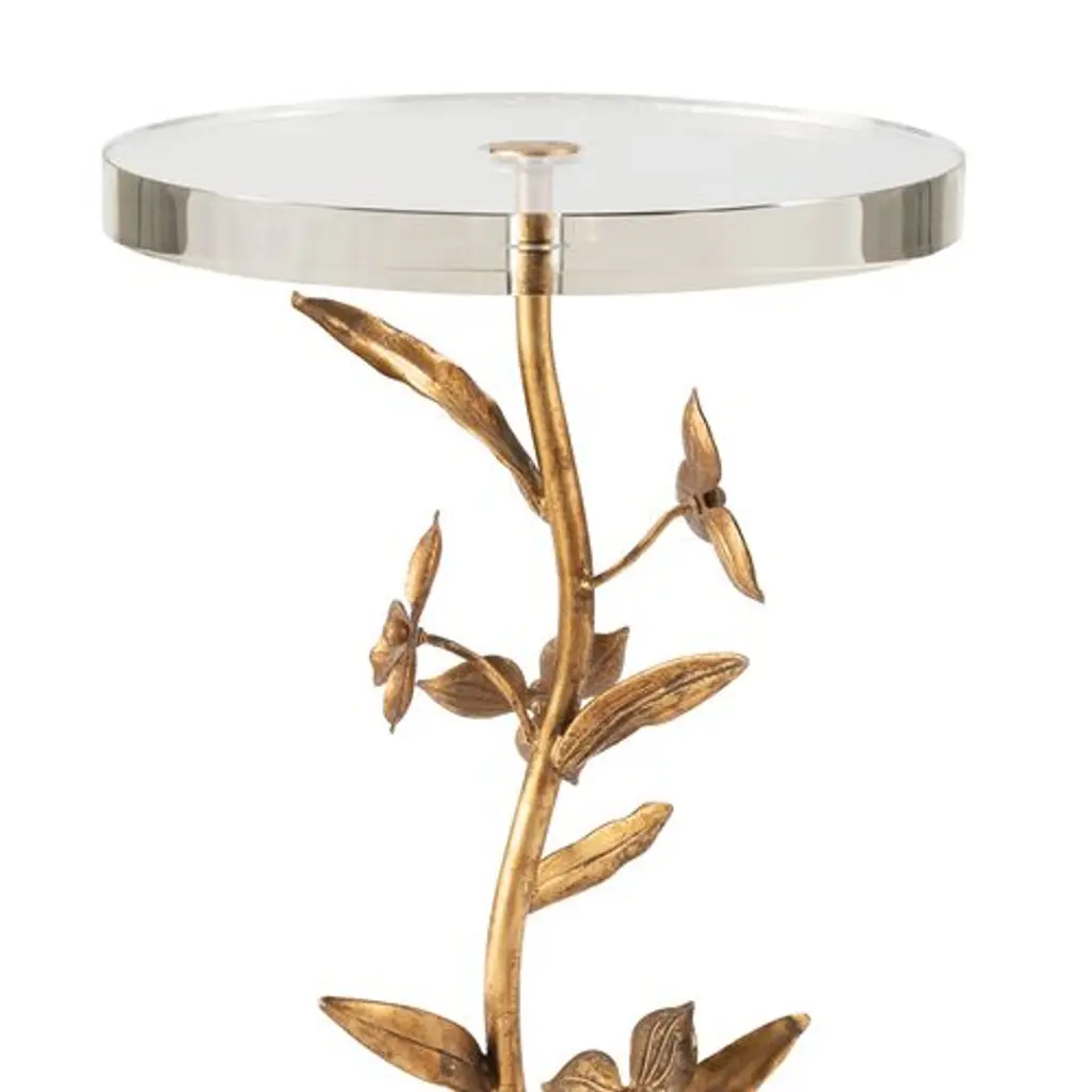 With a golden body crafted to resemble leaves emerging from a sapling's branches, this occasional table is as much a sculpture as it is a functional piece of furniture. The luminous alabaster base and the thick transparent acrylic top add to the timeless glamour.