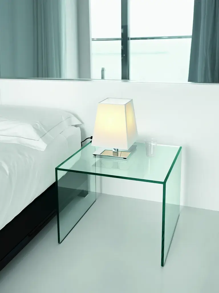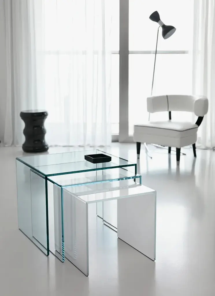 Trio is a modular set of bed side tables, made entirely of glass, and has a thickness of 12mm. It is available in transparent, extra clear, smoked or extra clear white lacquered glass. Because of the modularity they give a touch of character and elegance to the surrounding environment. Depending on the assembly the Trio nightstands are suitable both for living area and bedrooms.