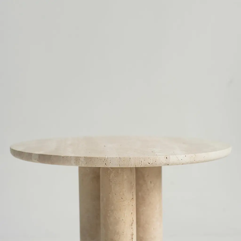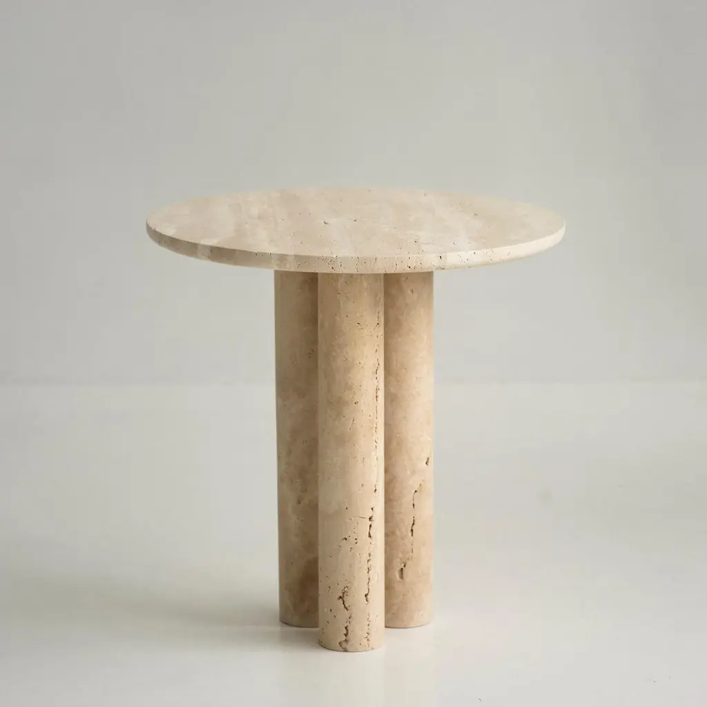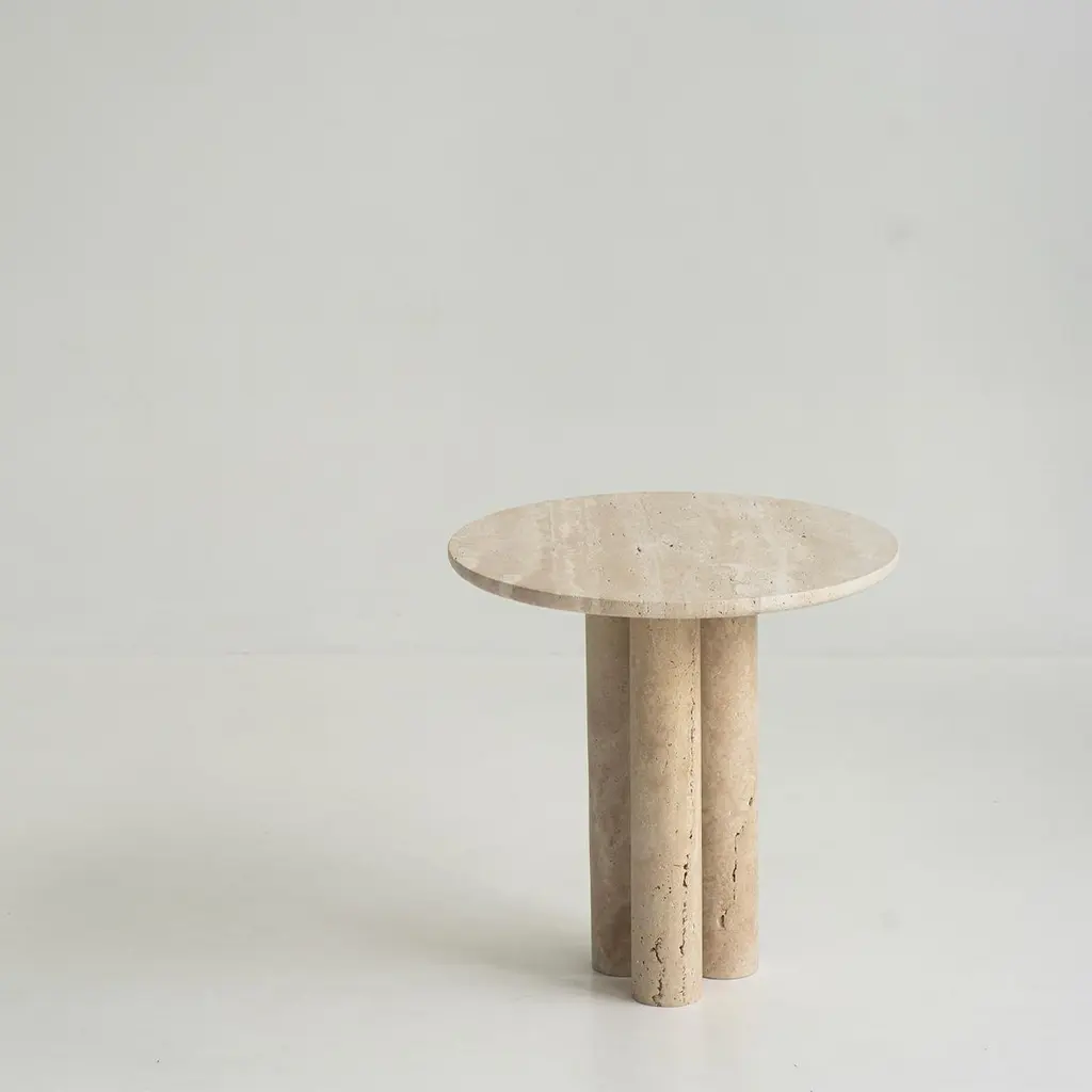 Travertine Side Table on three pieces of cylinderStunning, aesthetic, timeless are words that can be used to describe this elegant and modern travertine side table from Kiwano. Expertly crafted and finished by hand, our travertine side tables are a study in sculptural simplicity. Natural variations in the stone's distinctive veining, tonal hues and organic texture reveal the inherent beauty and one-of-a-kind character of each piece. Material: Travertine.