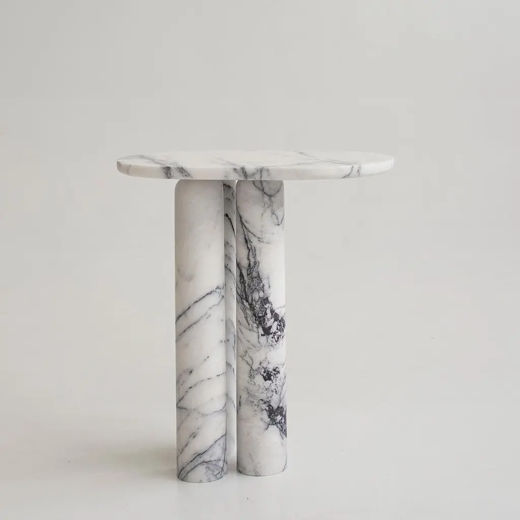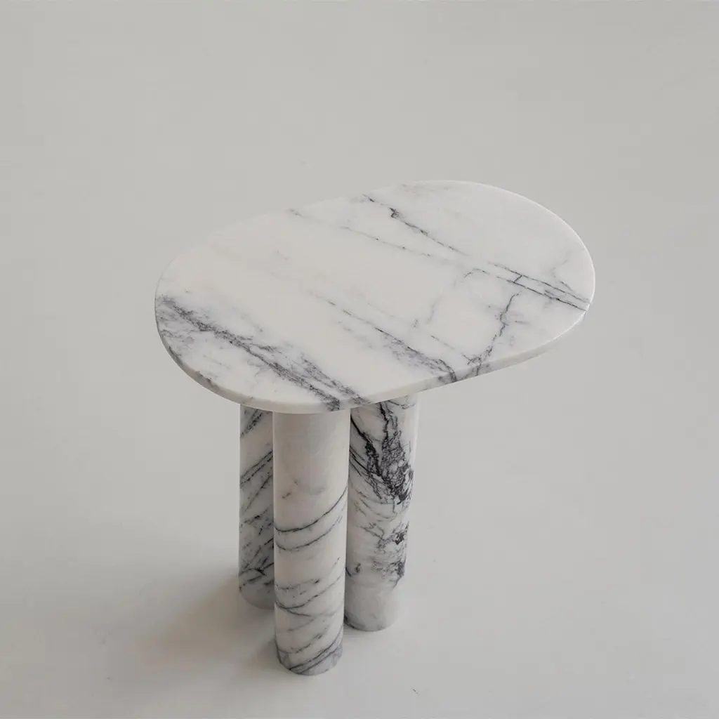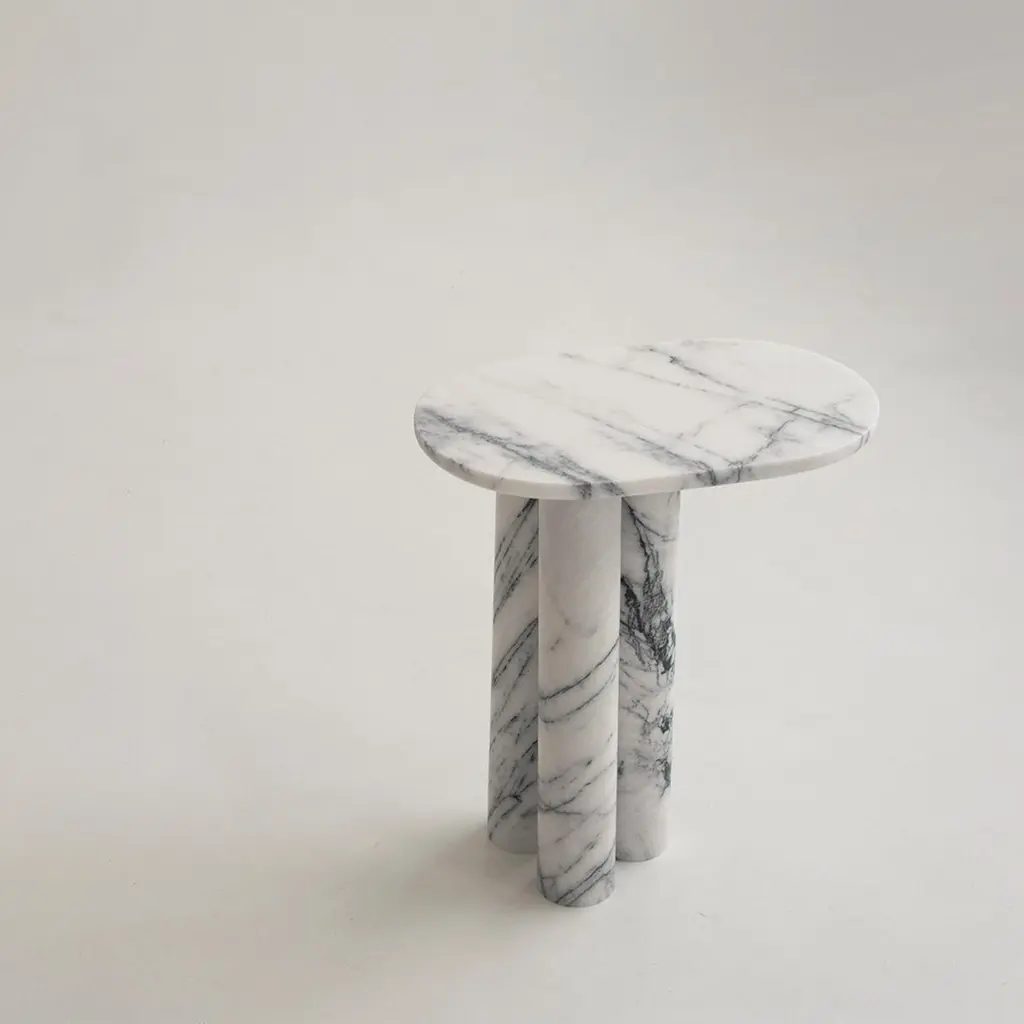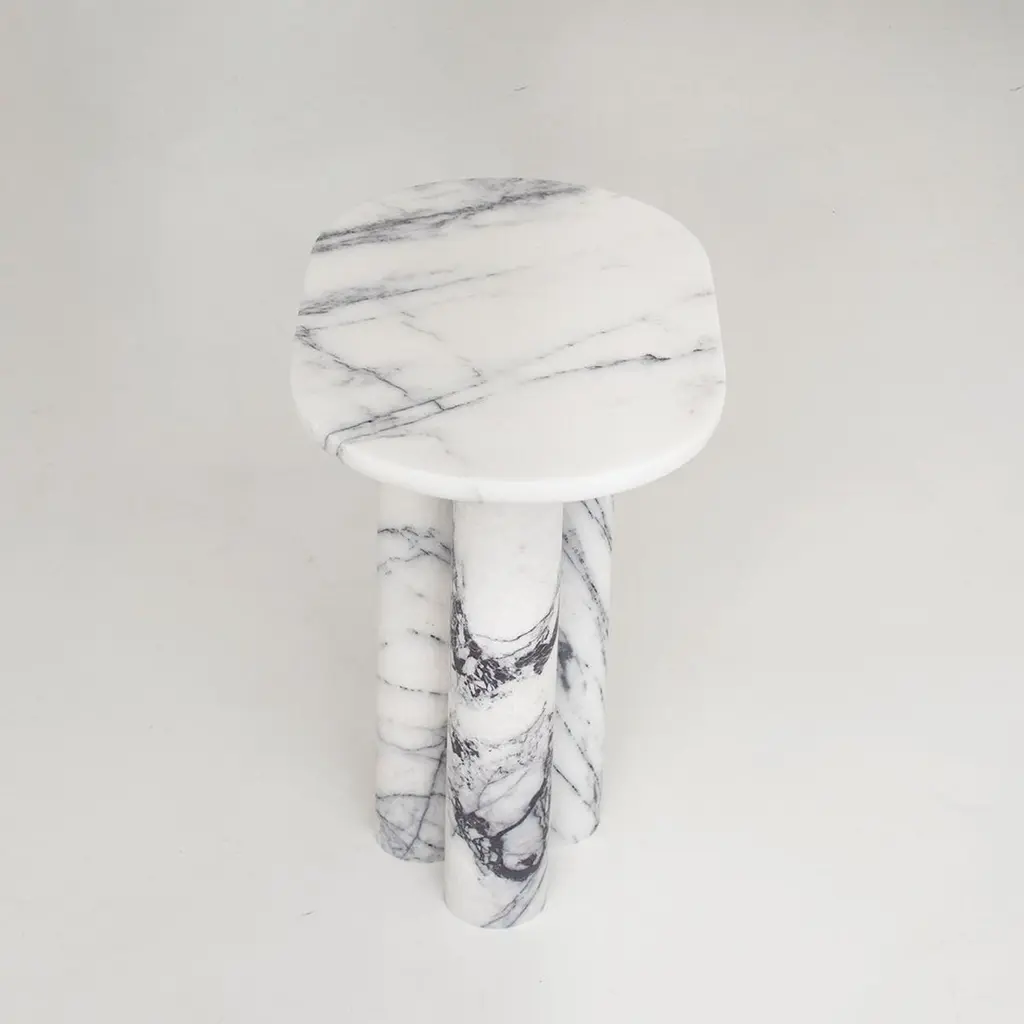 White Lilac side table on three pieces of cylinderStunning, aesthetic, timeless are words that can be used to describe this elegant and modern lilac side table from Kiwano. Expertly crafted and finished by hand, our lilac side tables are a study in sculptural simplicity. Natural variations in the stone's distinctive veining, tonal hues and organic texture reveal the inherent beauty and one-of-a-kind character of each piece. Material: Marble.