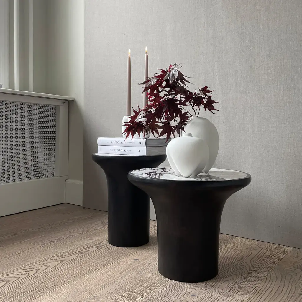 Inspired by Brutalism Architecture from the 1970's, the Trumpet Tables are designed as a trumpet shape with a soft curve and a circular tabletop. Trumpet is all about clean geometric shapes and embracing the beauty of natural materials. Made from a base of fiber concrete, the Trumpet tables features a tabletop of exquisite marble, emphasising the rich and beautiful patterns of natural stone. The polished surface softly reflects light, adding a warmth to the Trumpet tables. Designed by Kristian Sofus Hansen & Tommy Hyldahl.