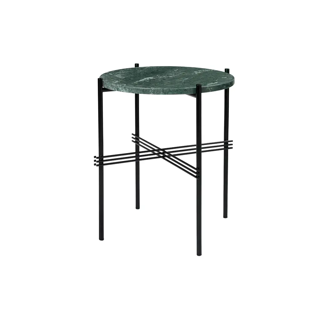 With its signature crosshatch steel base and a round top in a choice of luxurious marble varieties, Gubi extends its TS series in an elegant side table version. With the defining metal motif suggested by a 1930s building in Copenhagen, design studio GamFratesi offers the 4-legged frame in a choice of black or brass finish. At once polished and playful, the table makes a readily functional addition next to a comfortable chair or at bedside.
