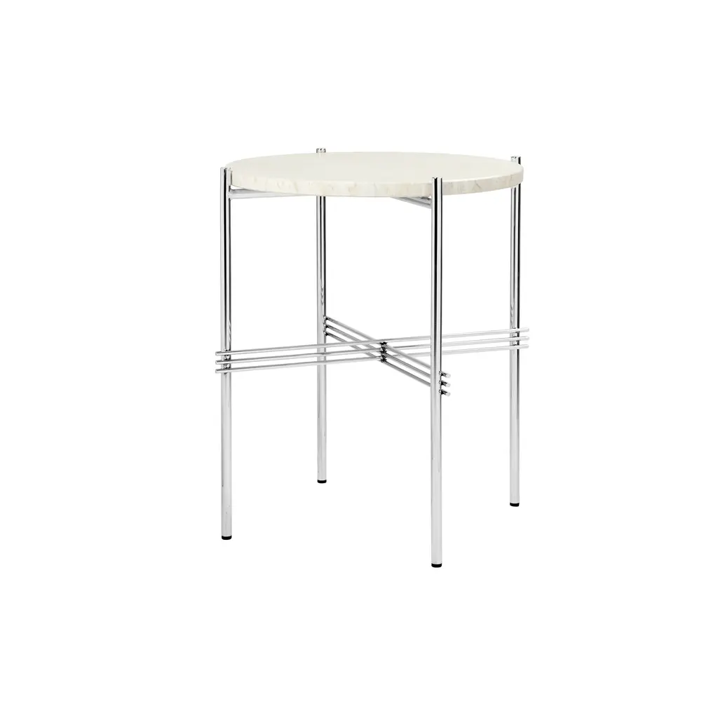 With its signature crosshatch steel base and a round top in a choice of luxurious marble varieties, Gubi extends its TS series in an elegant side table version. With the defining metal motif suggested by a 1930s building in Copenhagen, design studio GamFratesi offers the 4-legged frame in a choice of black or brass finish. At once polished and playful, the table makes a readily functional addition next to a comfortable chair or at bedside.