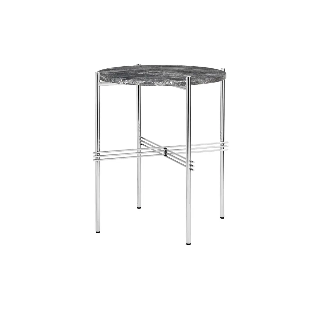 With its signature crosshatch steel base and a round top in a choice of luxurious marble varieties, Gubi extends its TS series in an elegant side table version. With the defining metal motif suggested by a 1930s building in Copenhagen, design studio GamFratesi offers the 4-legged frame in a choice of black or brass finish. At once polished and playful, the table makes a readily functional addition next to a comfortable chair or at bedside.