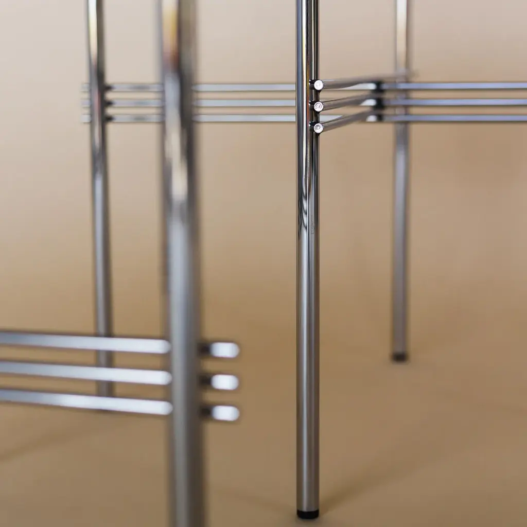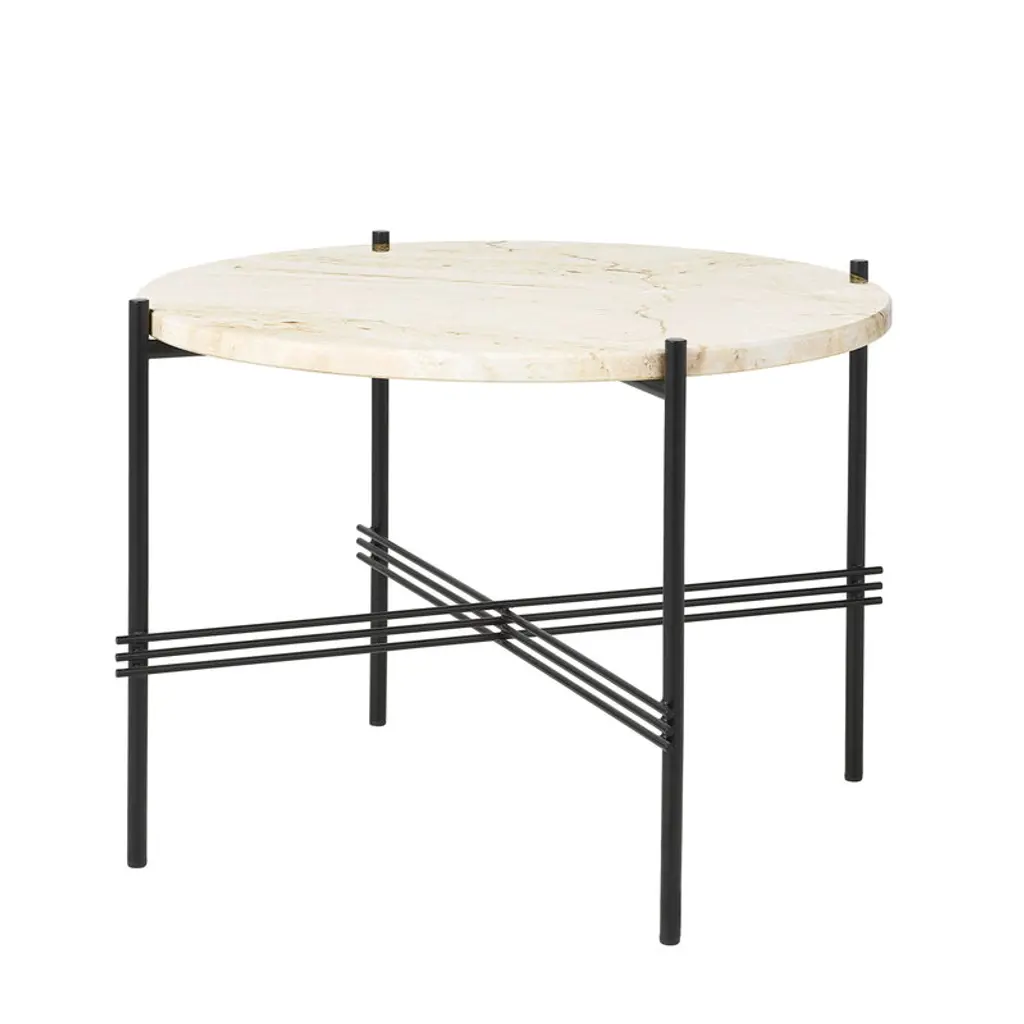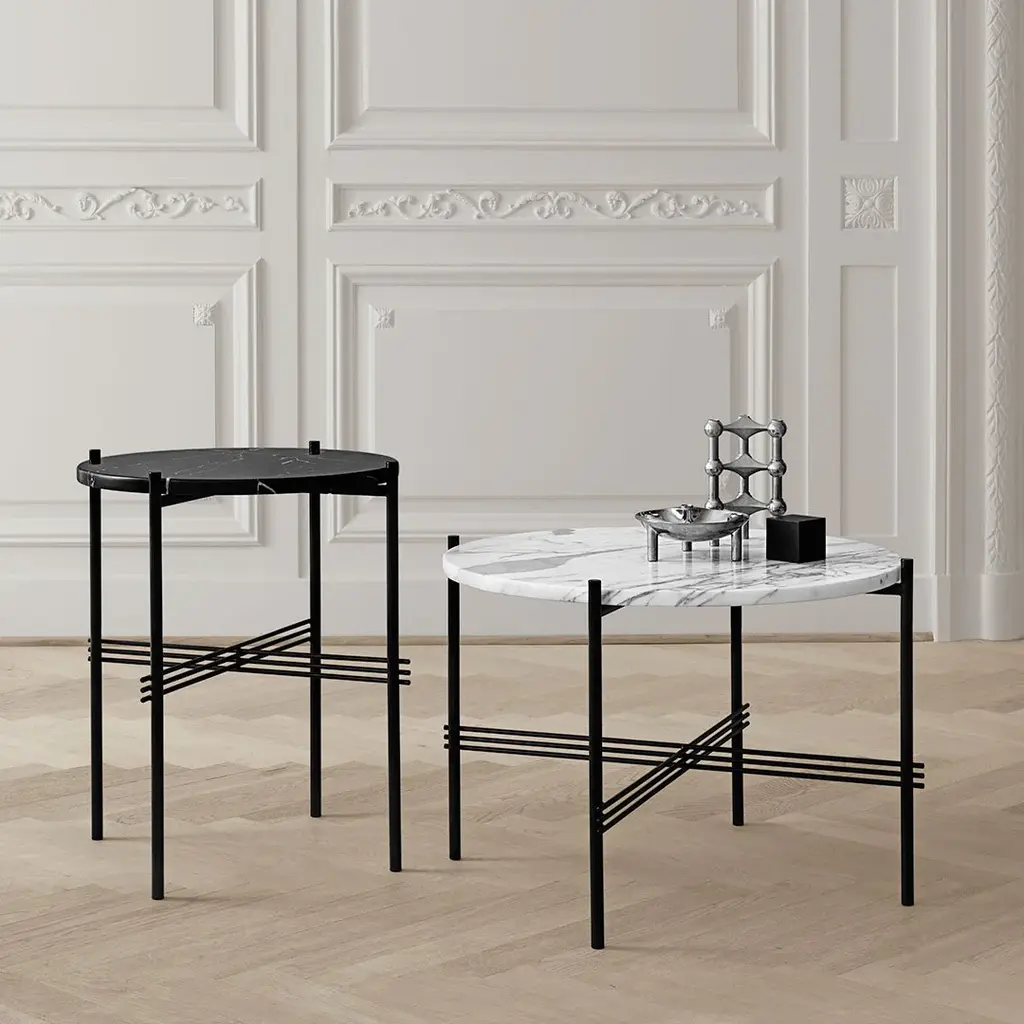 The TS Side Table creates a sophisticated and sculptural aesthetics for any room with its characteristic slender legs, beautifully crossing details and contrasting solid table top. Designed by GamFratesi for the renowned restaurant The Standard in Copenhagen, where not only its name got its inspiration but also aesthetics and material choices were found. Available in glass or marble with black or brass frame.