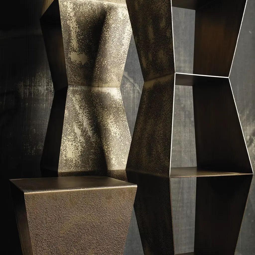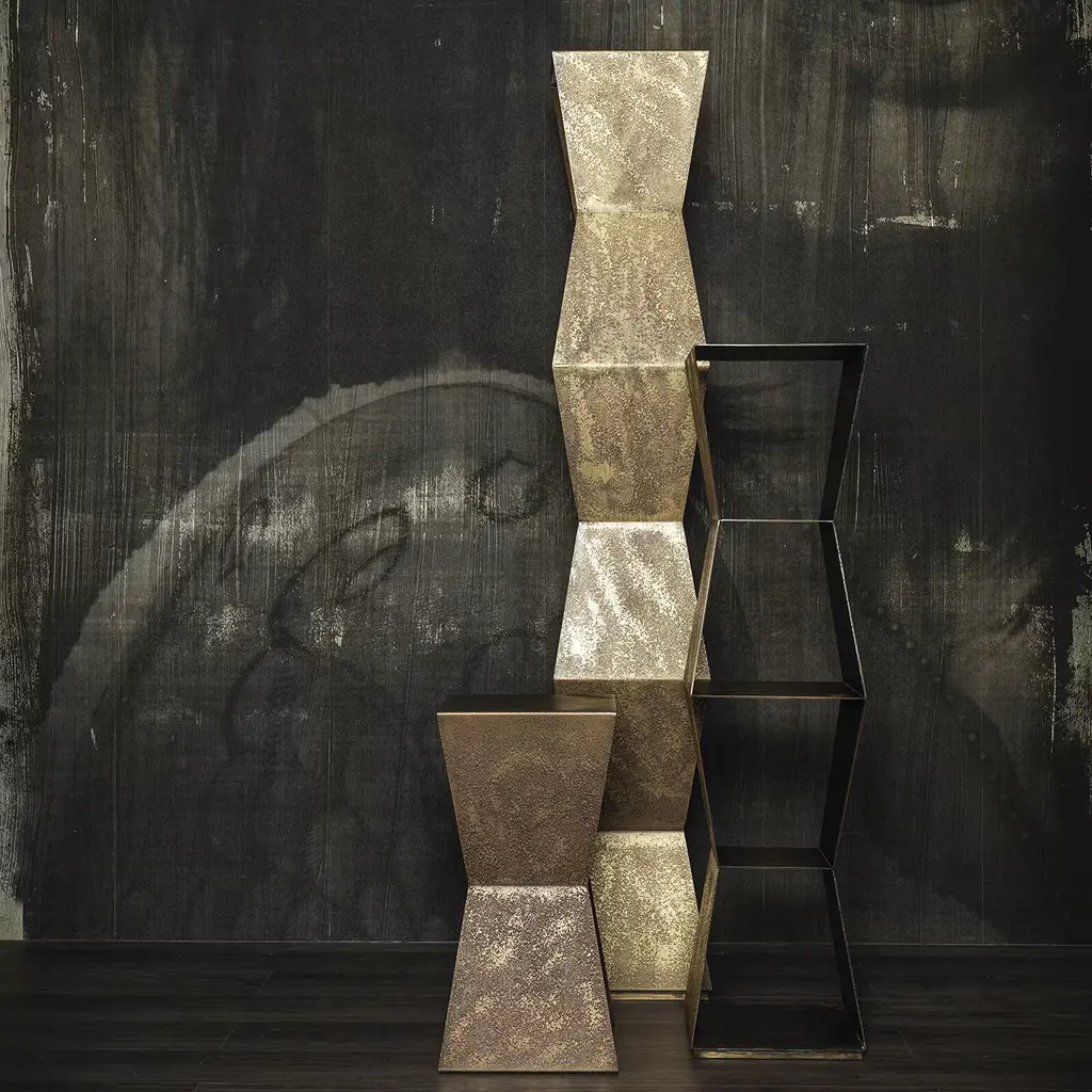 The perfect match to the Tula Tall Bookcase or the Tula Side Table, this exquisite piece is a small bookcase with four shelves and a striking geometric silhouette vertically rising in a self-supporting way. Crafted of metal, the piece is finished with a galvanic coating of eroded bronze showcasing exquisite and unique hues.