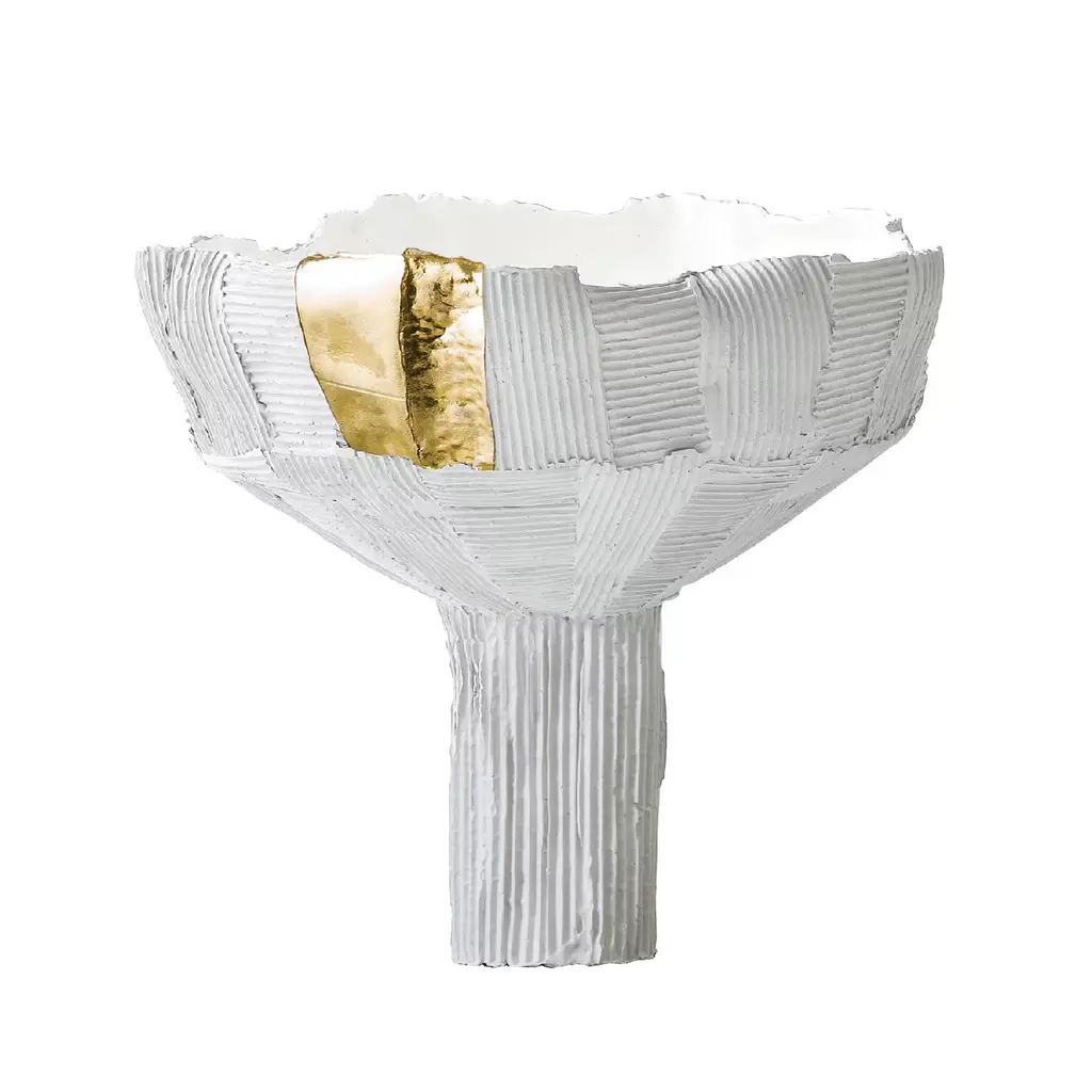 Inspired by the sinuous form of a blooming tulip, this refined white bowl elevates home decor to art. Marked by a highly-textured surface, the bowl features expressive horizontal and vertical ridges and a single striking gold panel insert, creating a dynamic color and textural contrast. The distinctive feel of the paper clay is achieved by blending paper pulp and natural fibers to the clay mixture. Used as a centerpiece on a long dining room table or a low-lying side table, this piece will shine in any decor. Every one of Paola Paronetto’s creations is unique. Slight variations in shape, colour and size are to be considered a guarantee of authenticity and value. They are finished with non-toxic satin-finish enamels. Although very rarely, it is possible for them to leak after long periods of exposure to water. It is therefore advisable to test their water resistance before using them on delicate surfaces. They should not be used as dining utensils. The white pieces can be washed with water or sanitizing products, whereas the coloured pieces must be treated more gently and cleaned with a feather duster or a soft cloth, dry or moistened very slightly with water.