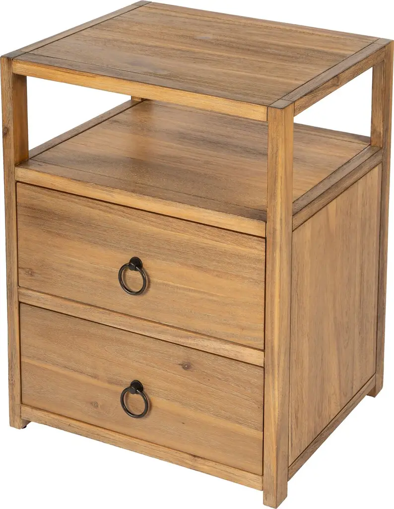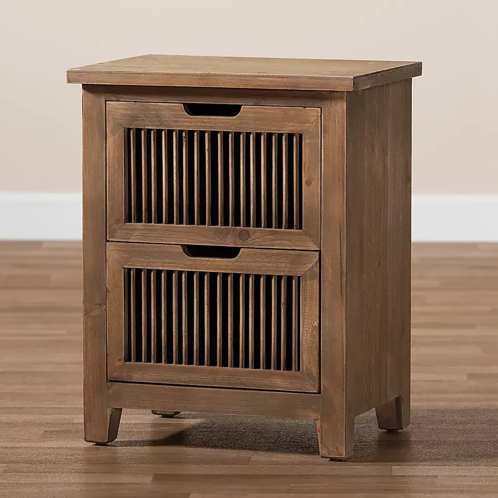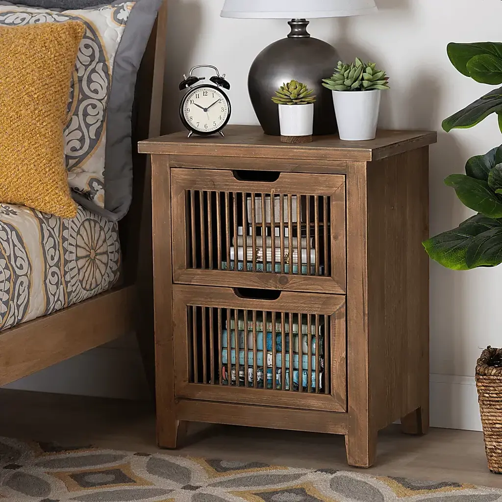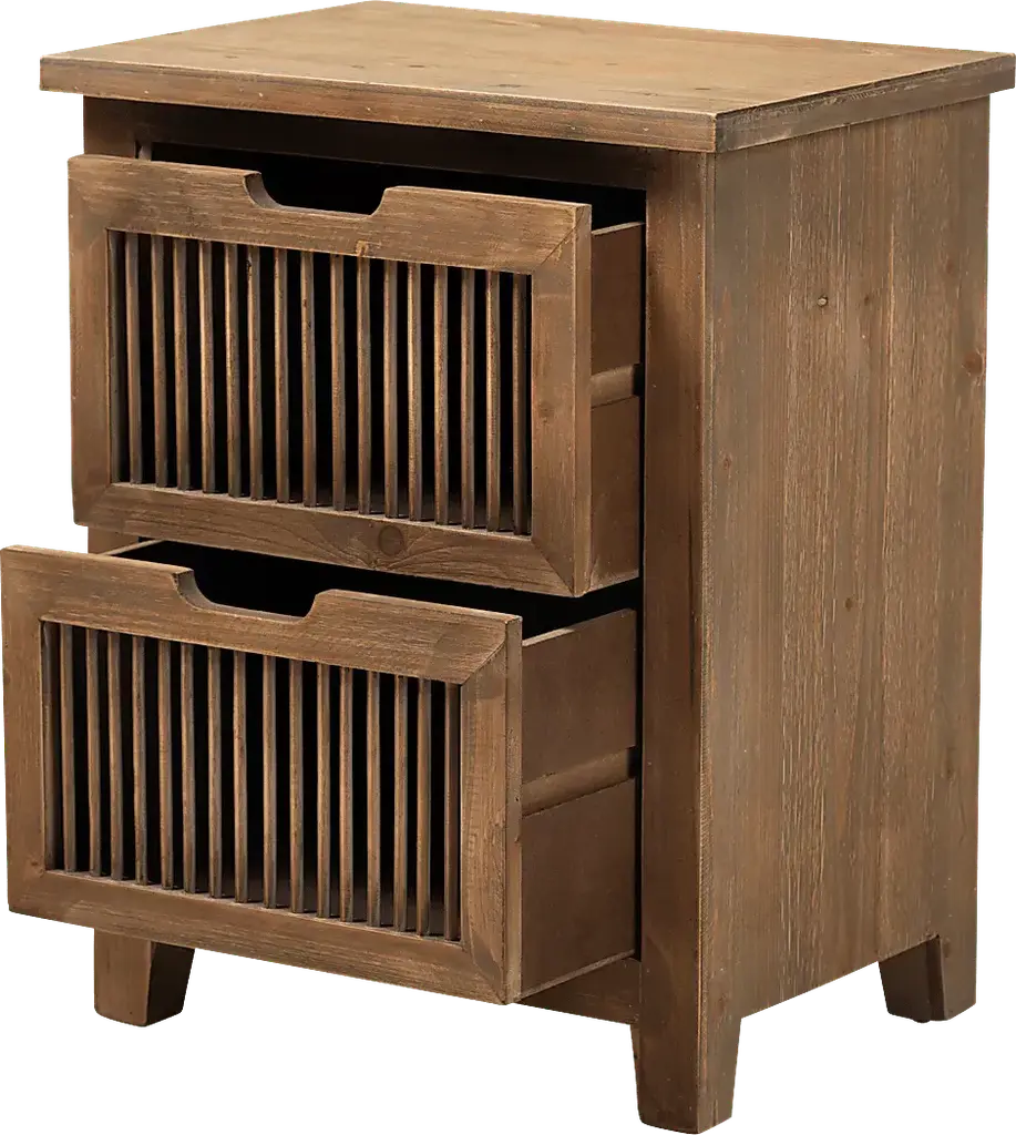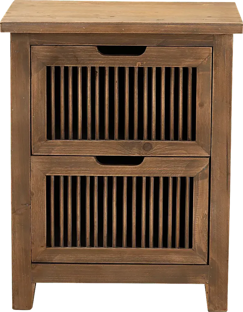 Rustic tones and clean lines make the Tulipgold brown end table a handsome addition to any space. This sturdy wood end table displays a medium oak finish that highlights the wood grains for a cozy, rustic look. Two drawers provide ample space to store a variety of household essentials. Spindle detailing lends visual interest, while cut-out drawer handles enhance the natural appeal of the end table. The Tulipgold will arrive fully assembled.