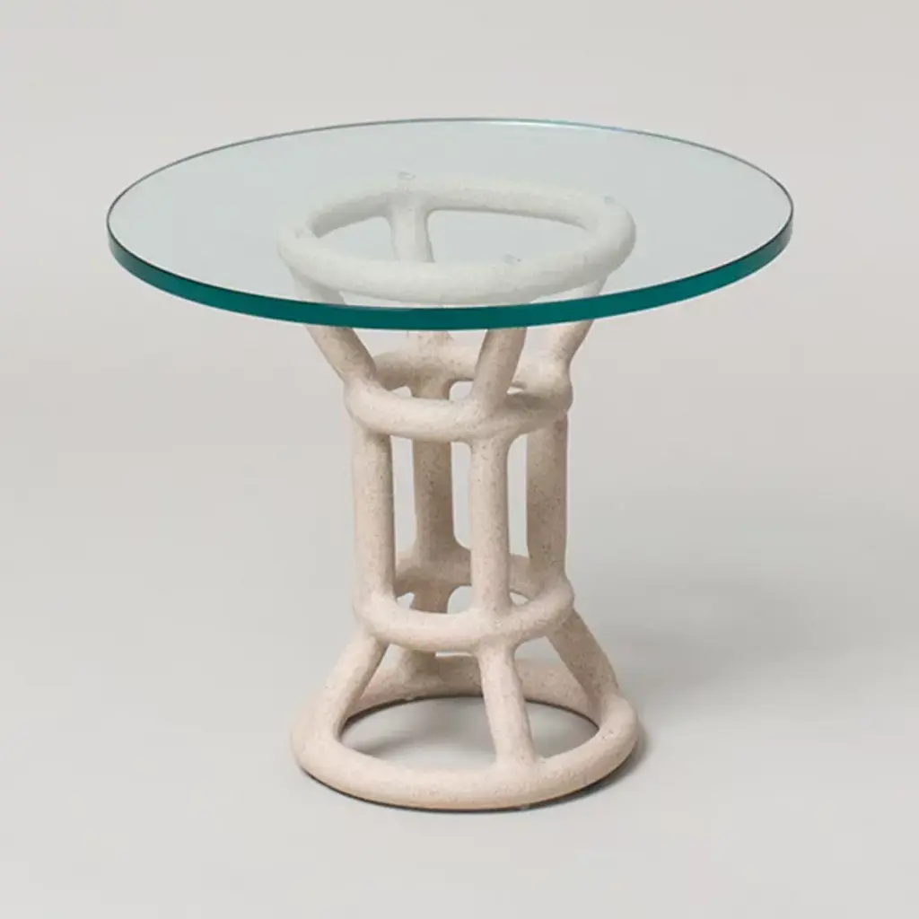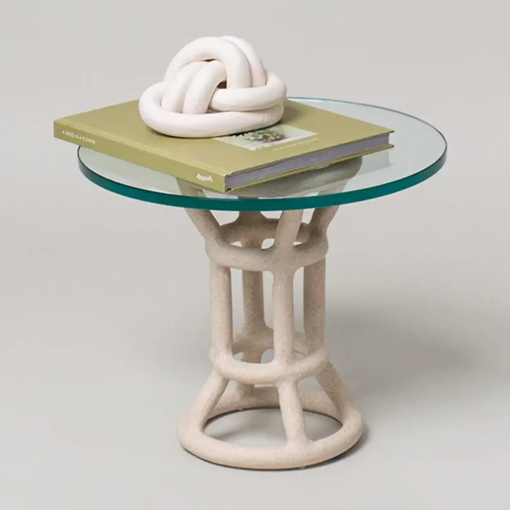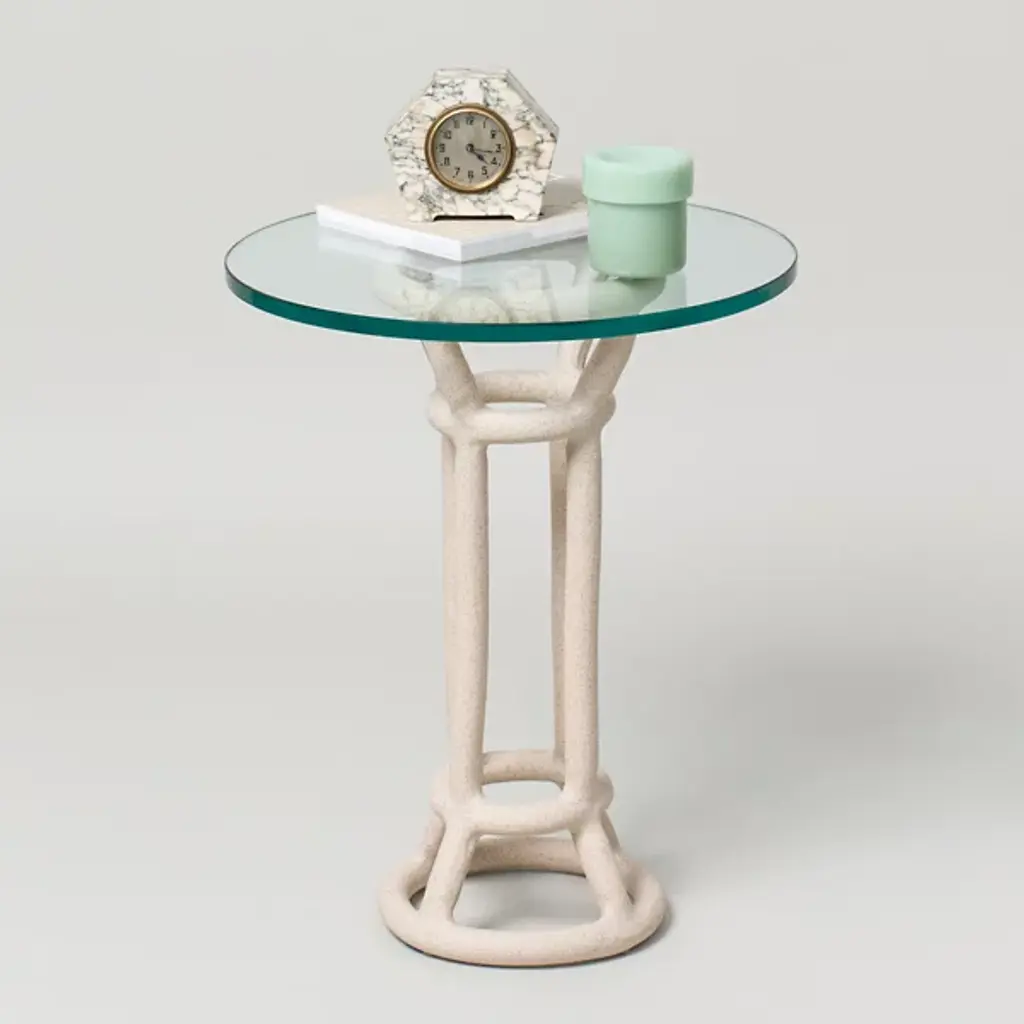The Turret Accent Table from SIN is an artistic solution to indoor storage and a logical expansion of SIN’s iconic Fig shelving system. Fig is short for Configuration, and this table is no exception to its central design elements, using handcrafted ceramic stoneware bases with an open tower design to elevate a circular tabletop of half-inch thick tempered glass. The smooth top contrasts well with the unique, artisanal texture of the ceramic column below, both surface detail and form, adding a mix of airy appeal and a strong structure beneath.