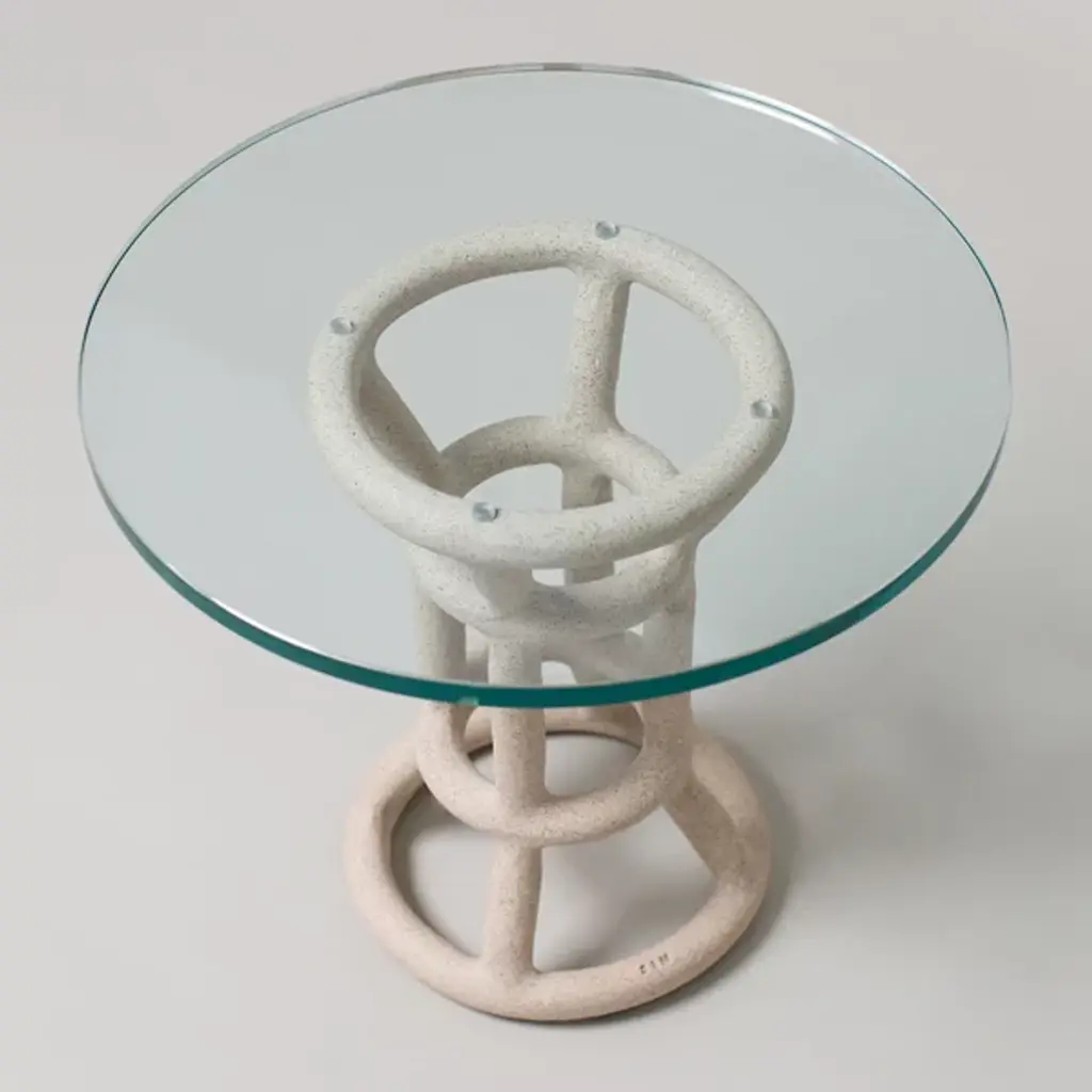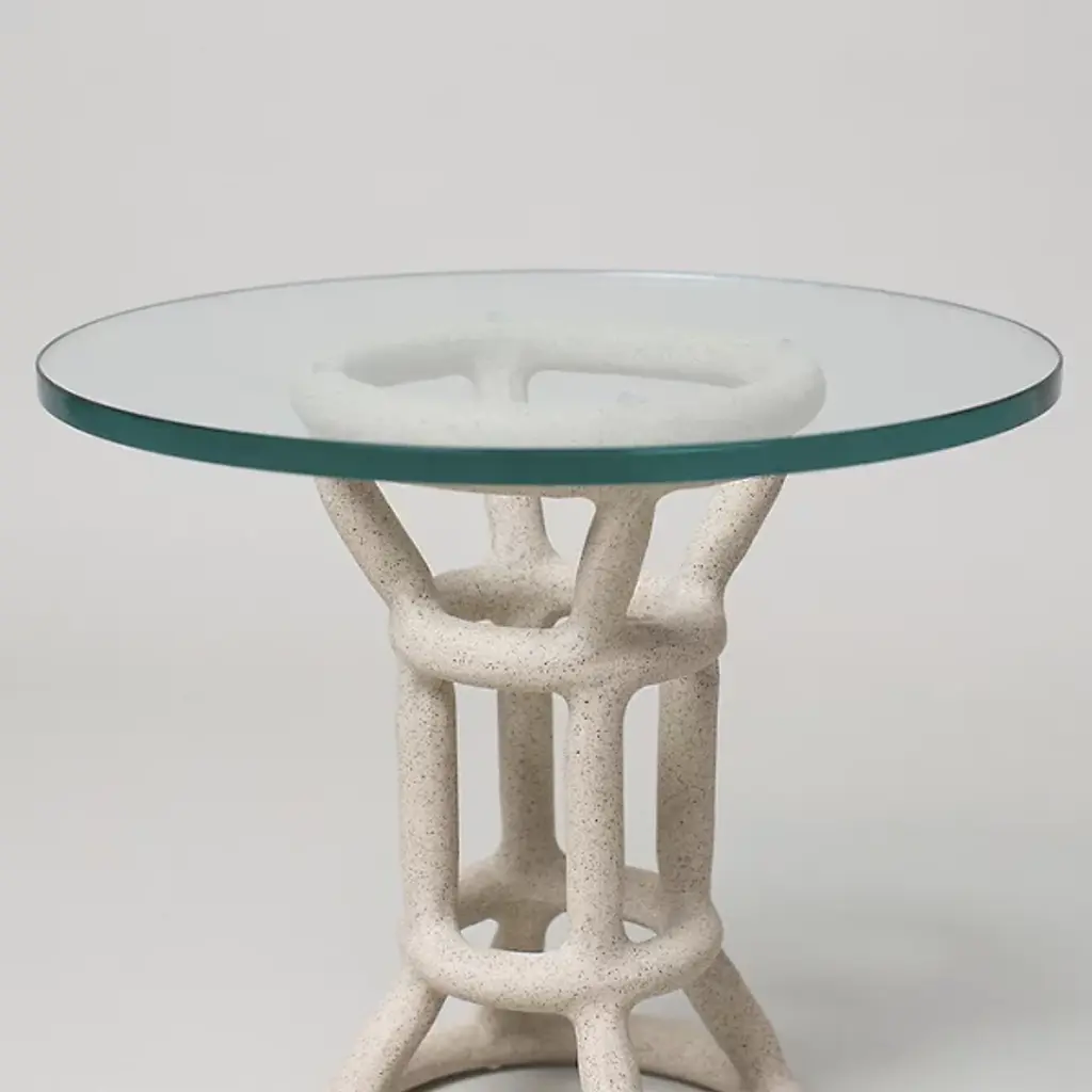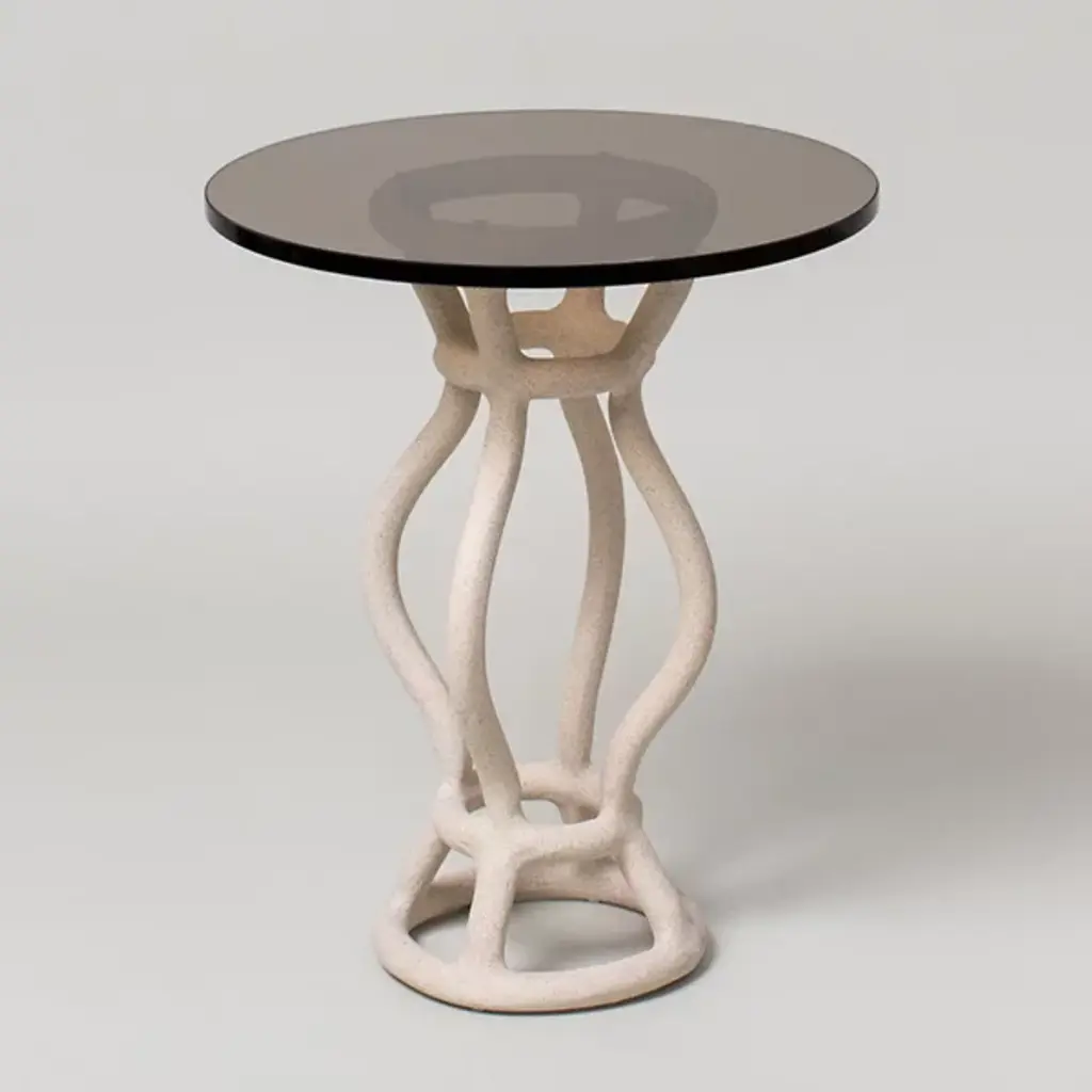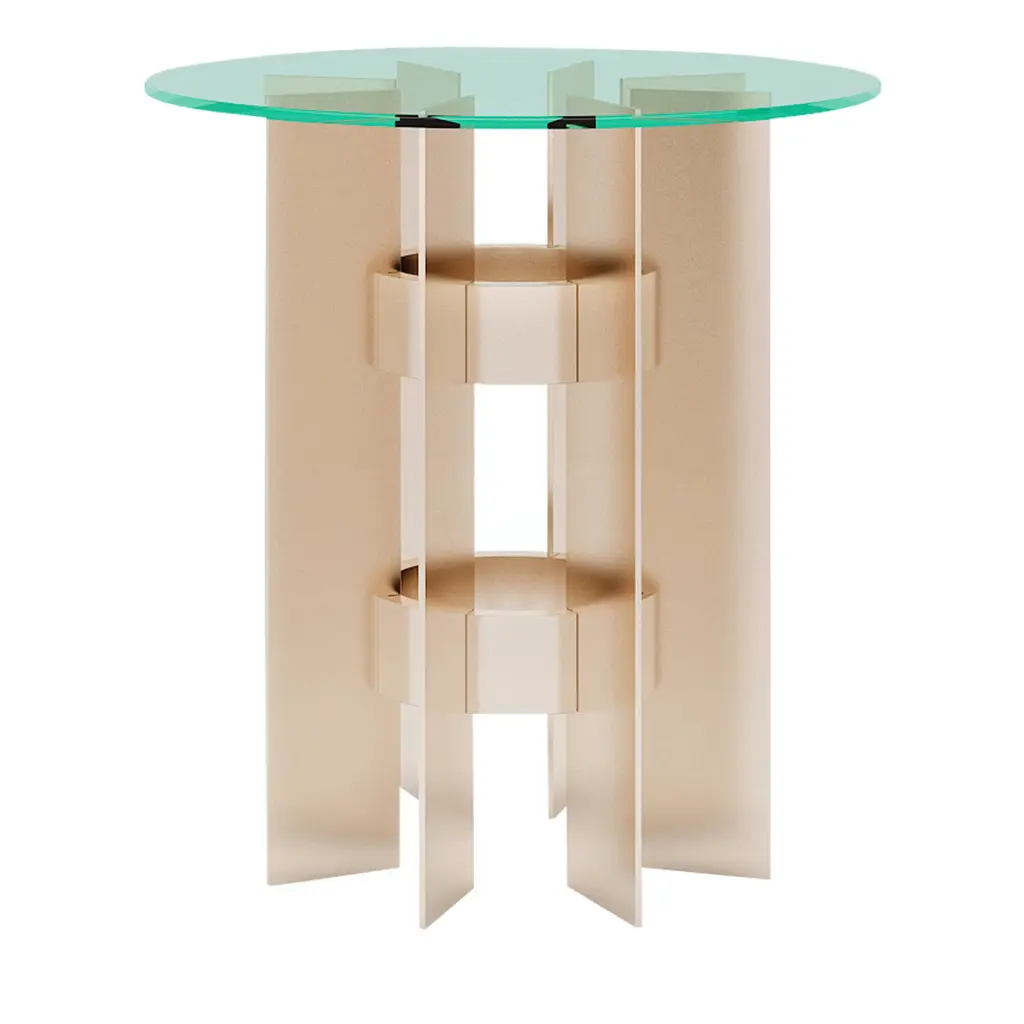 The Turret Accent Table from SIN is an artistic solution to indoor storage and a logical expansion of SIN’s iconic Fig shelving system. Fig is short for Configuration, and this table is no exception to its central design elements, using handcrafted ceramic stoneware bases with an open tower design to elevate a circular tabletop of half-inch thick tempered glass. The smooth top contrasts well with the unique, artisanal texture of the ceramic column below, both surface detail and form, adding a mix of airy appeal and a strong structure beneath.