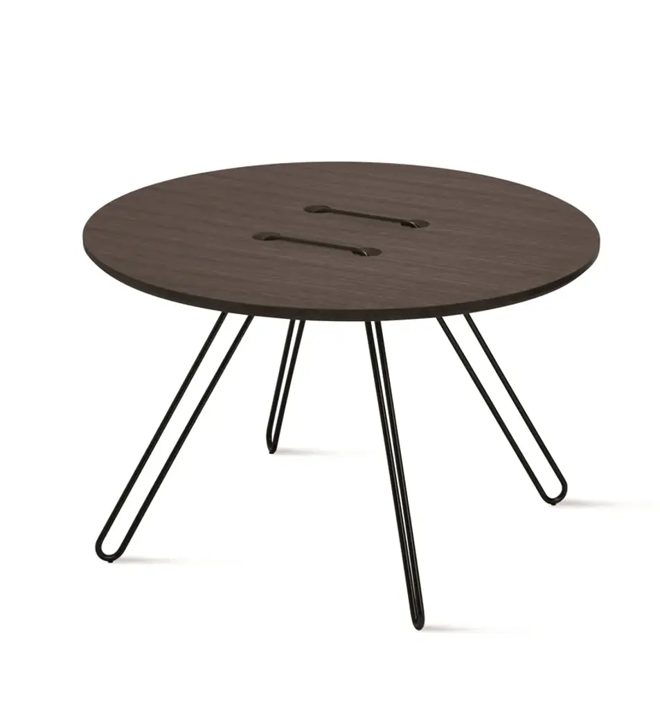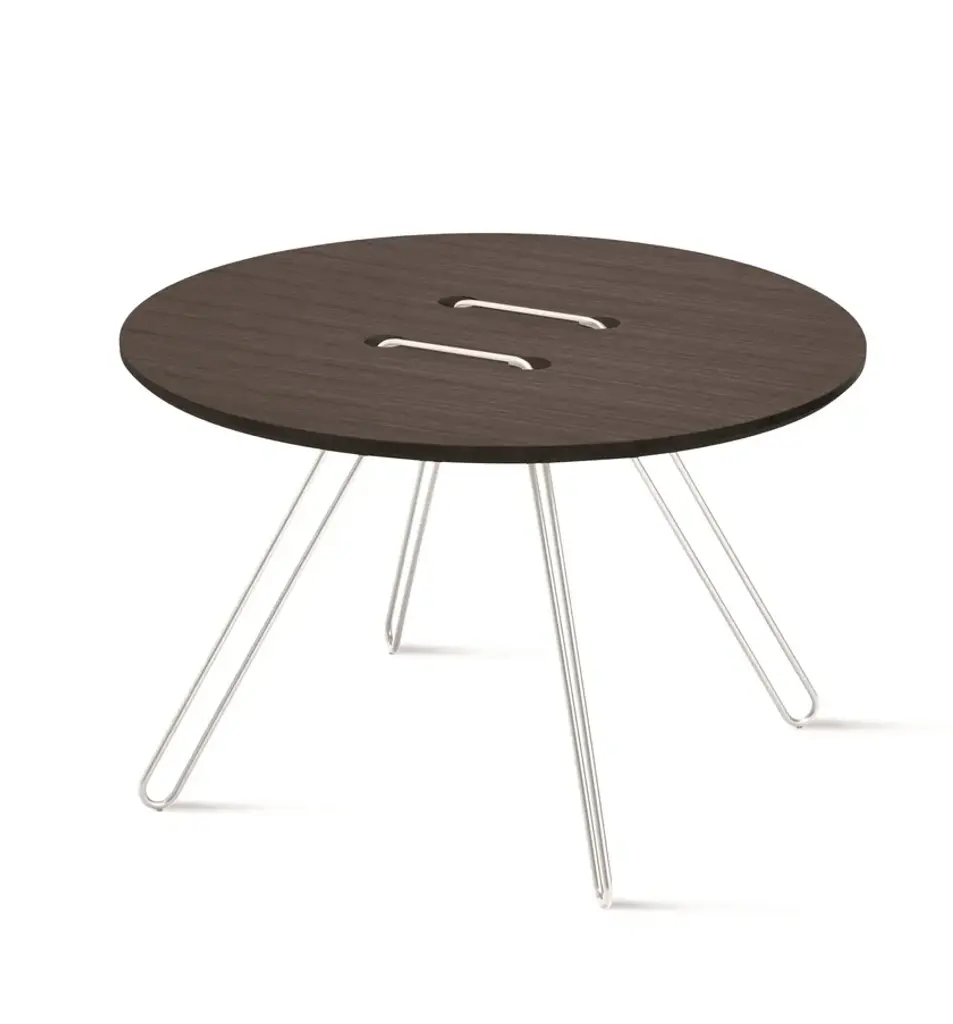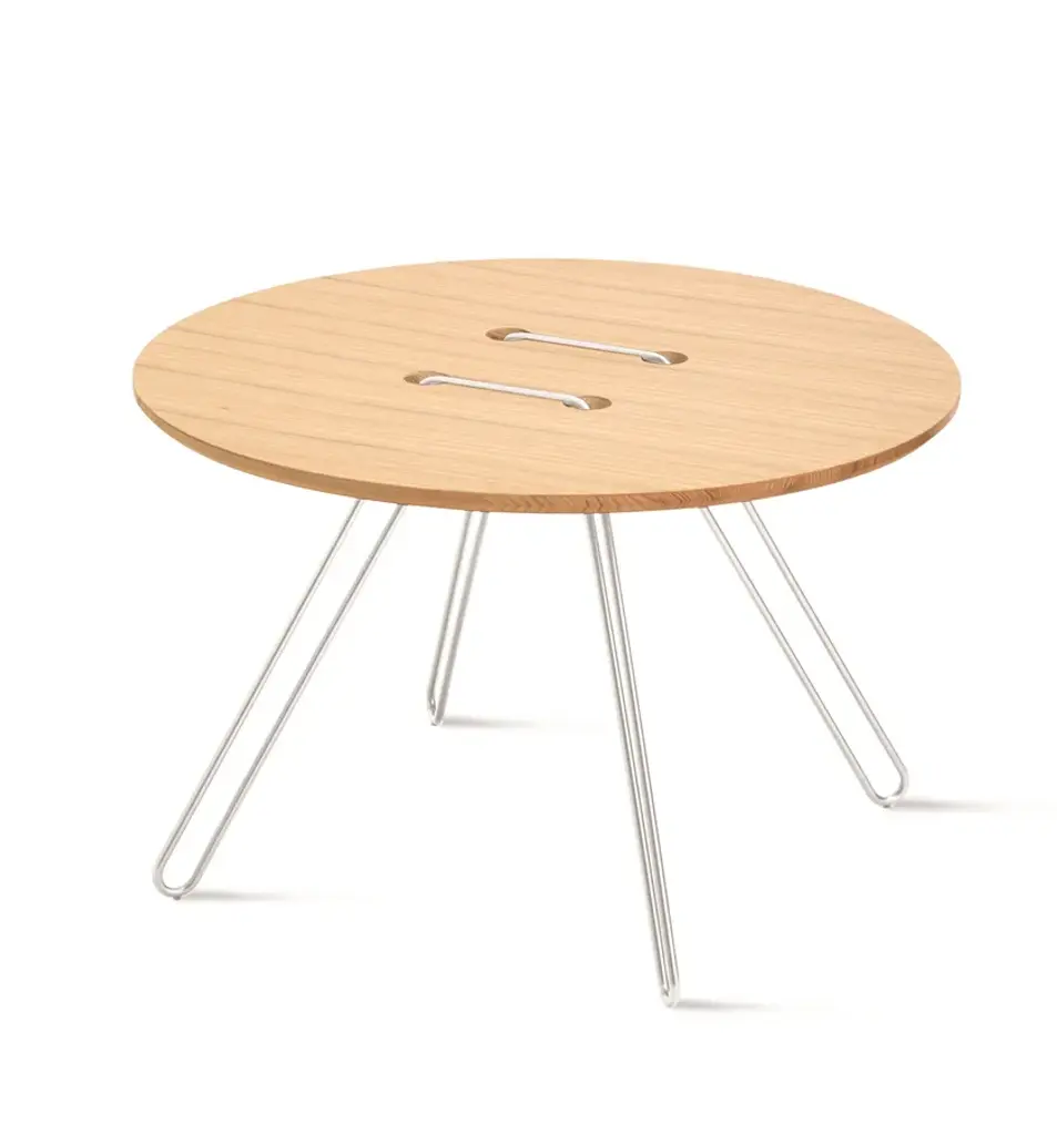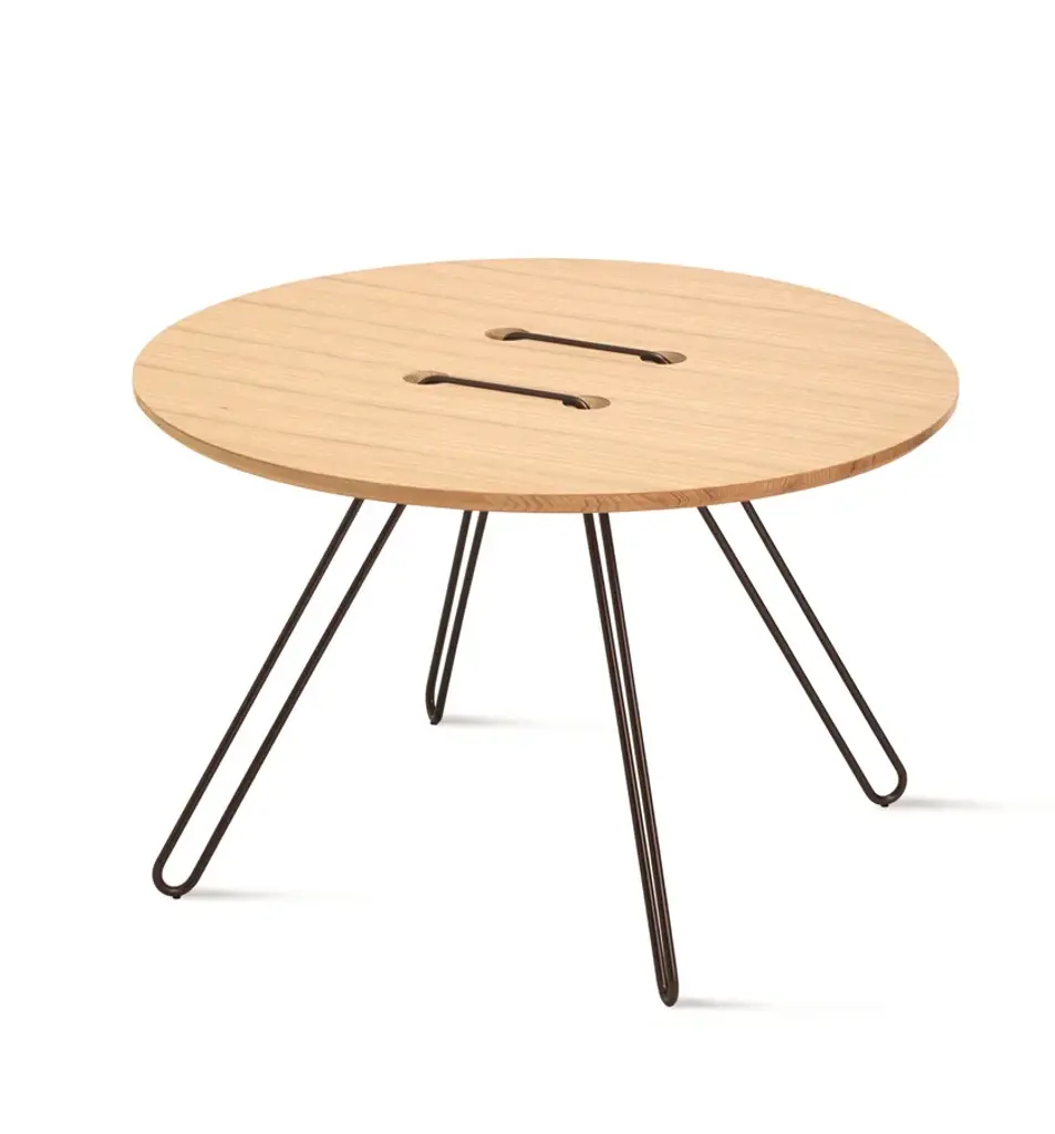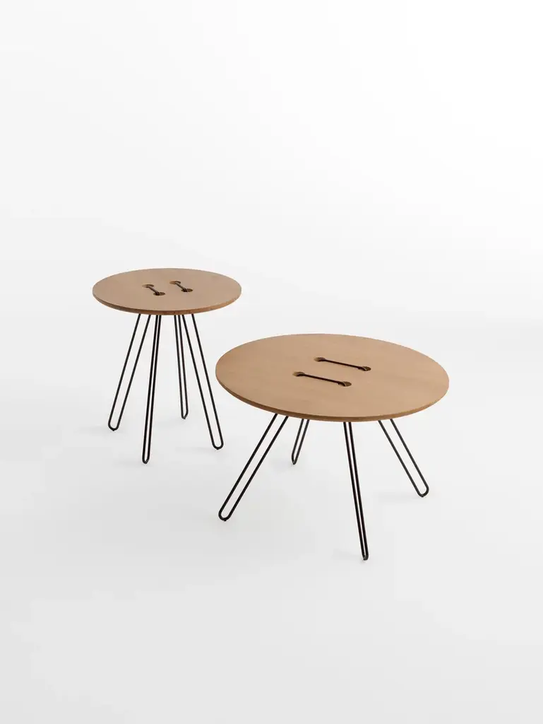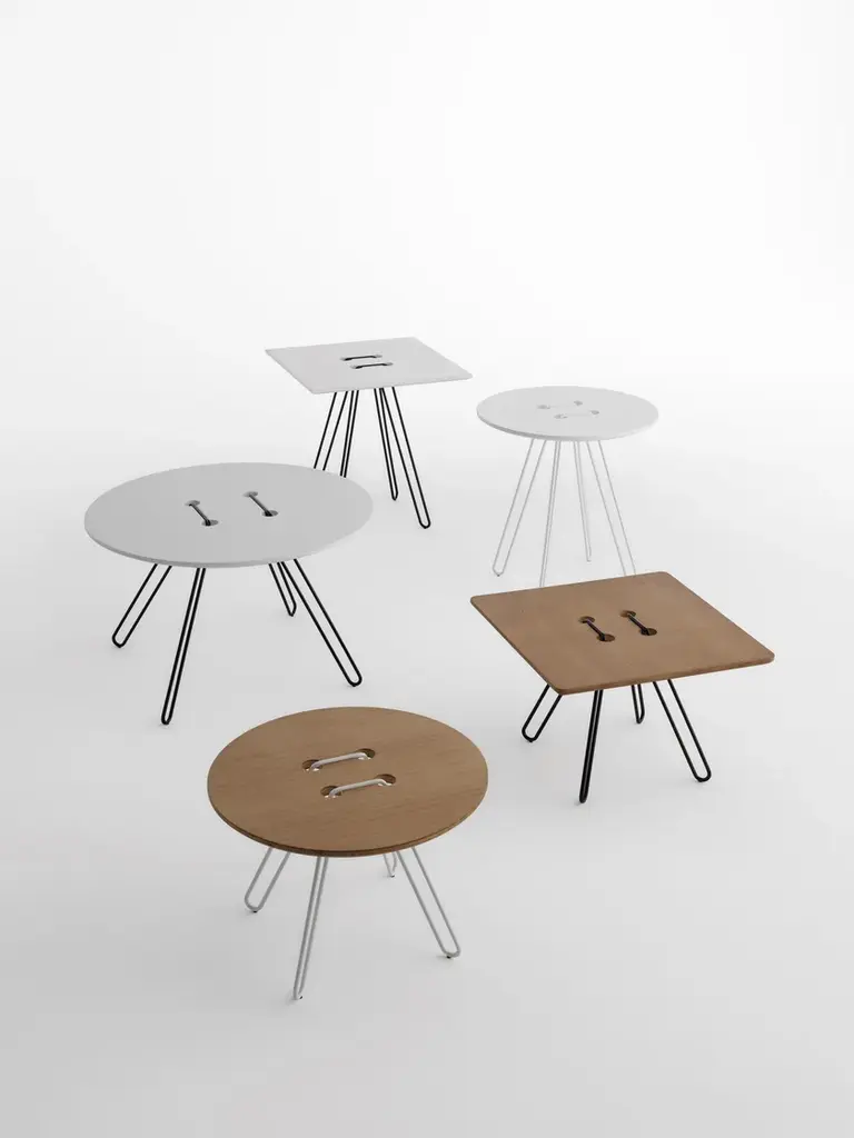 Twine Table is a series of tables inspired by one of mankind’s most simple inventions: the button. The table top is an over-size button, whilst the metal wire pierces and twists around the surface to create an elegant base. A playful and nostalgic addition to any interior. Available in a range of colours. “The idea of the tables arose when the designers, Lisa and Anna, were looking into the world of construction. They had recently been working with some embroidery for an exhibition, and they asked themselves – is it possible to stitch a table together? Inspired by the idea of needlework, they passed a metal wire through a table top. The wire then became the legs as well as the structure. The playful Twine Tables, in the shape of a button, are completely at ease by a sofa, an easy chair or just by itself”. MATERIALS AND FINISHESTop: White lacquered MDF or solid oak natural or walnut painted oak.Structure: black, white or bronze painted metal.