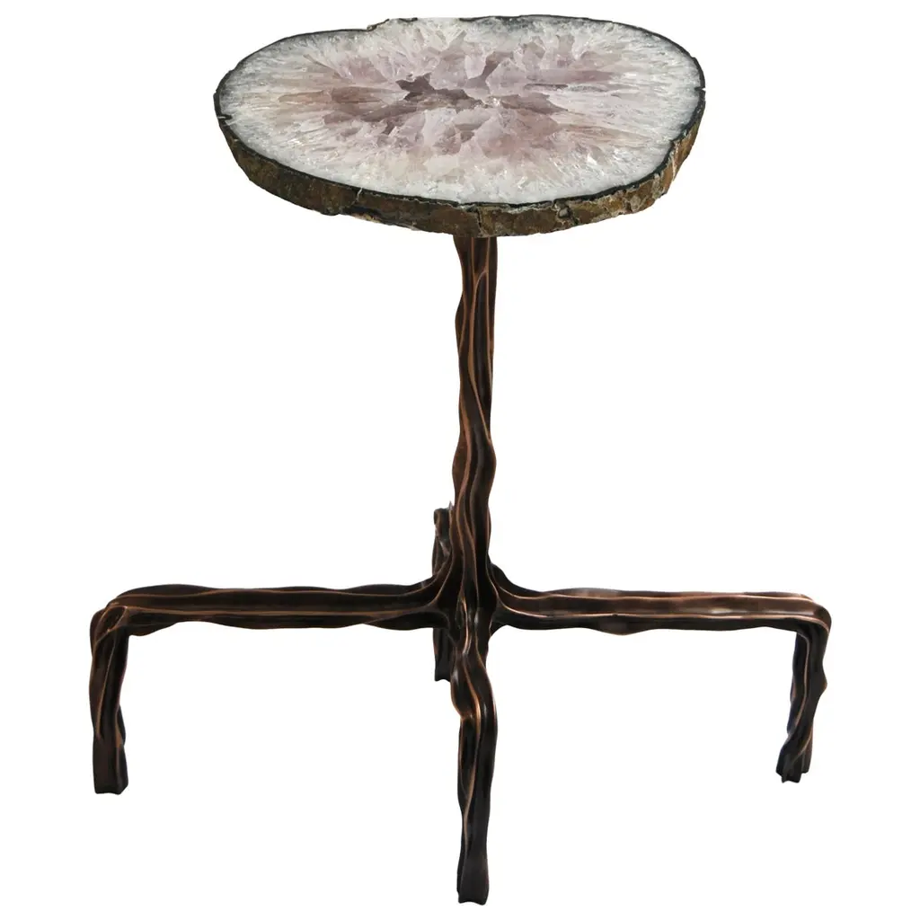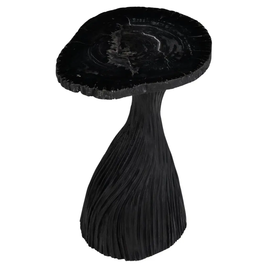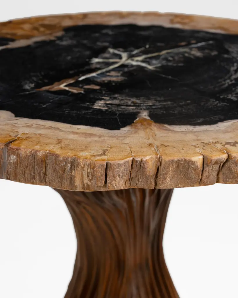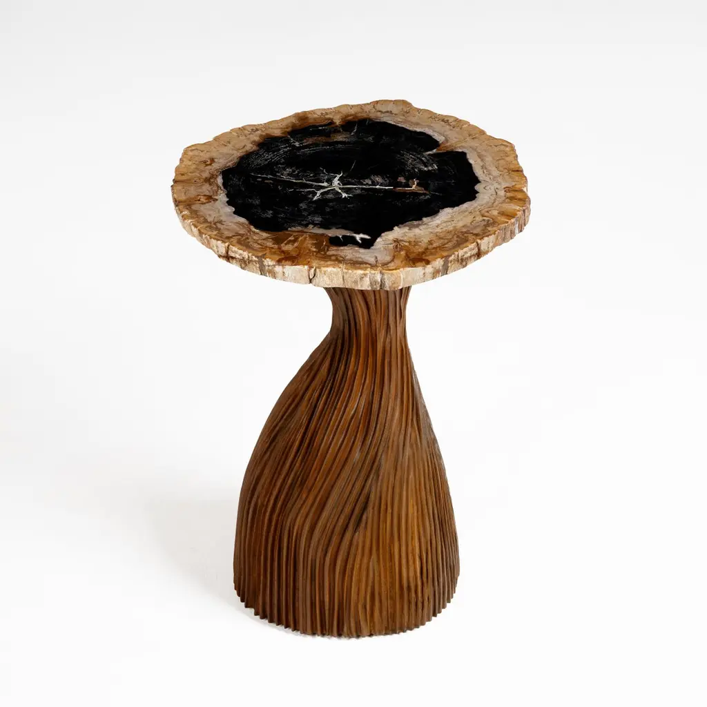 A twist of surrealism for your domestic fantasy. Meet ‘Twisted Fantasy’, an organic hand-sculpted spiral form side table. Carved from solid acacia and burnt using the traditional method of Shou Sugi Ban to enhance the natural grain and character of the wood. Featuring a striking petrified wood table top which fuses effortlessly with the sculptural base.Petrified wood is created from fossilized trees transformed into stone by a mineralization process that occurs underground, over hundreds of millions of years. This rare material features striking colors and motifs created by the mineral formation process, comprized of semi-precious minerals such as quartz, chalendony and jasper. This is a meticulously hand sculptured product. Each object will have its own unique presence and feature interesting variations in the natural materials and forms created during the artisanal process.Dimensions:W 17.7 x D 19.3 x Height 24.8 in.(W 45 x D 49 x 63 cm)Customization: This piece is available in a variety of curated petrified wood table tops. Contact us for any personalized requests.Handmade to order unless listed in stock.----------Odditi takes a curious look at the relationship between nature and humanity, exploring our inner and outer landscapes and creating objects that live between the worlds of art and design.