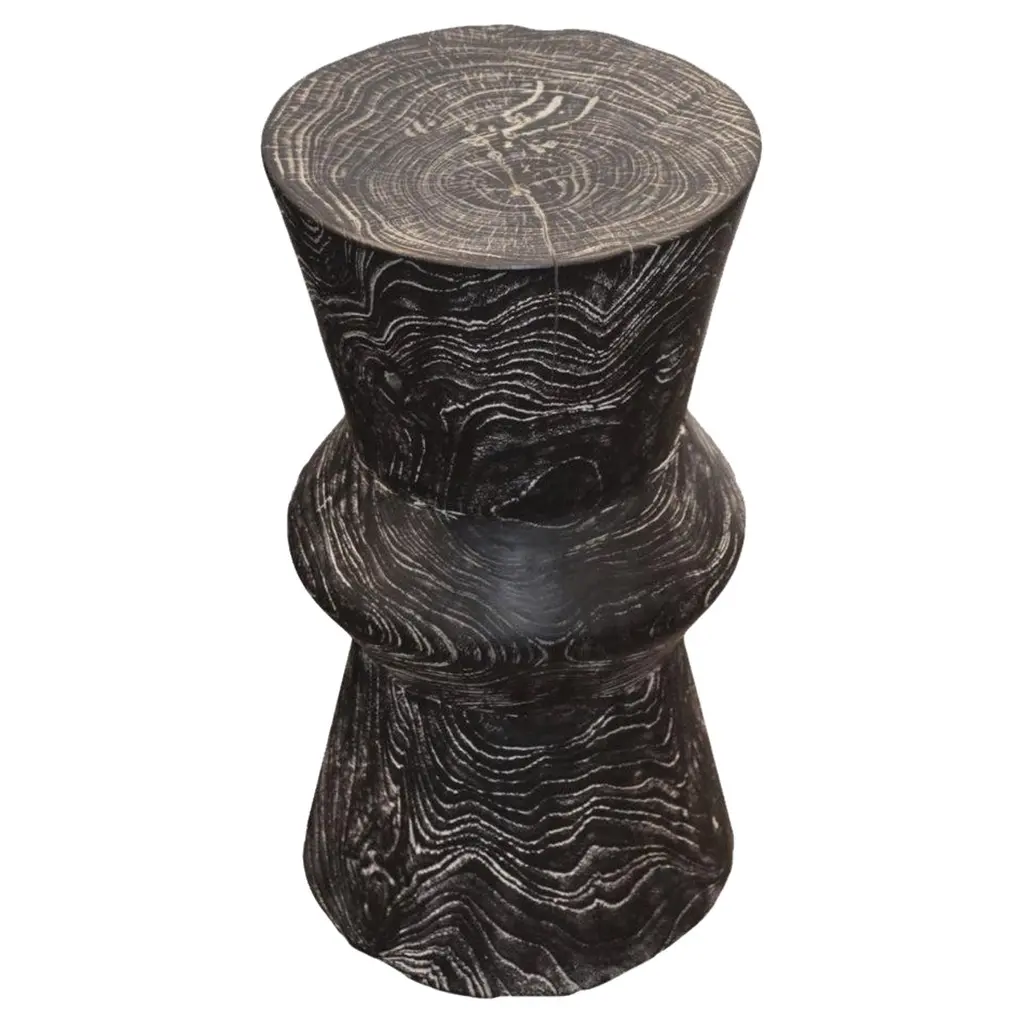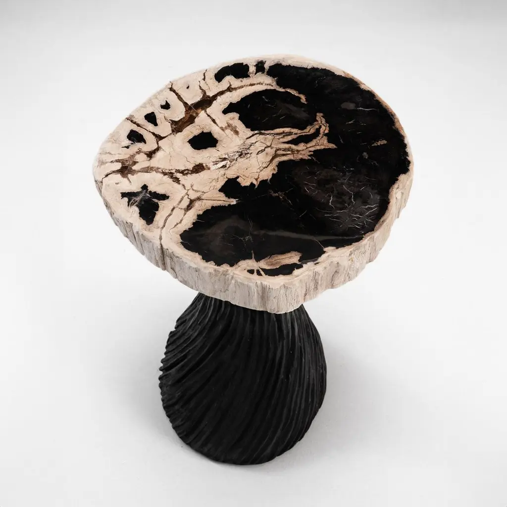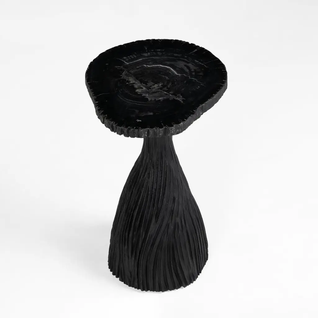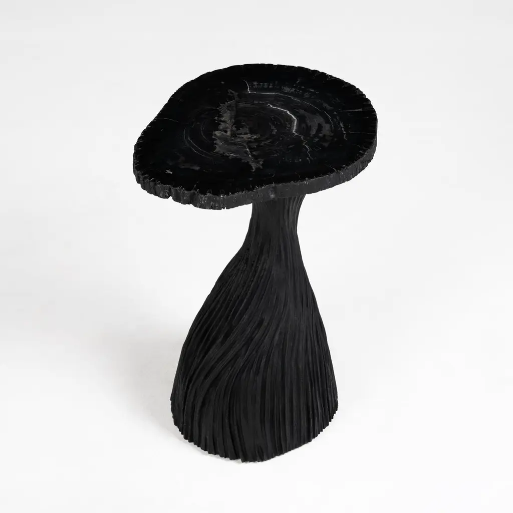 A twist of surrealism for your domestic fantasy. Meet ‘Twisted Fantasy’, an organic hand-sculpted spiral form side table. Carved from solid acacia and burnt using the traditional method of Shou Sugi Ban to enhance the natural grain and character of the wood. Featuring a striking petrified wood table top which fuses effortlessly with the sculptural base.Petrified wood is created from fossilized trees transformed into stone by a mineralization process that occurs underground, over hundreds of millions of years. This rare material features striking colors and motifs created by the mineral formation process, comprized of semi-precious minerals such as quartz, chalendony and jasper. This is a meticulously hand sculptured product. Each object will have its own unique presence and feature interesting variations in the natural materials and forms created during the artisanal process.Dimensions:W 17.7 x D 19.3 x Height 24.8 in.(W 45 x D 49 x Height 63 cm)Customization: This piece is available in a variety of curated petrified wood table tops. Contact us for any personalized requests.Handmade to order unless listed in stock.----------Odditi takes a curious look at the relationship between nature and humanity, exploring our inner and outer landscapes and creating objects that live between the worlds of art and design.