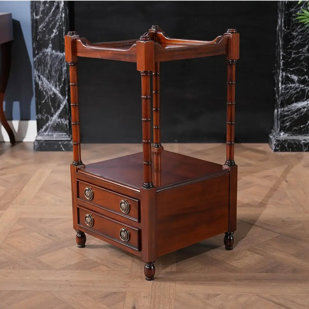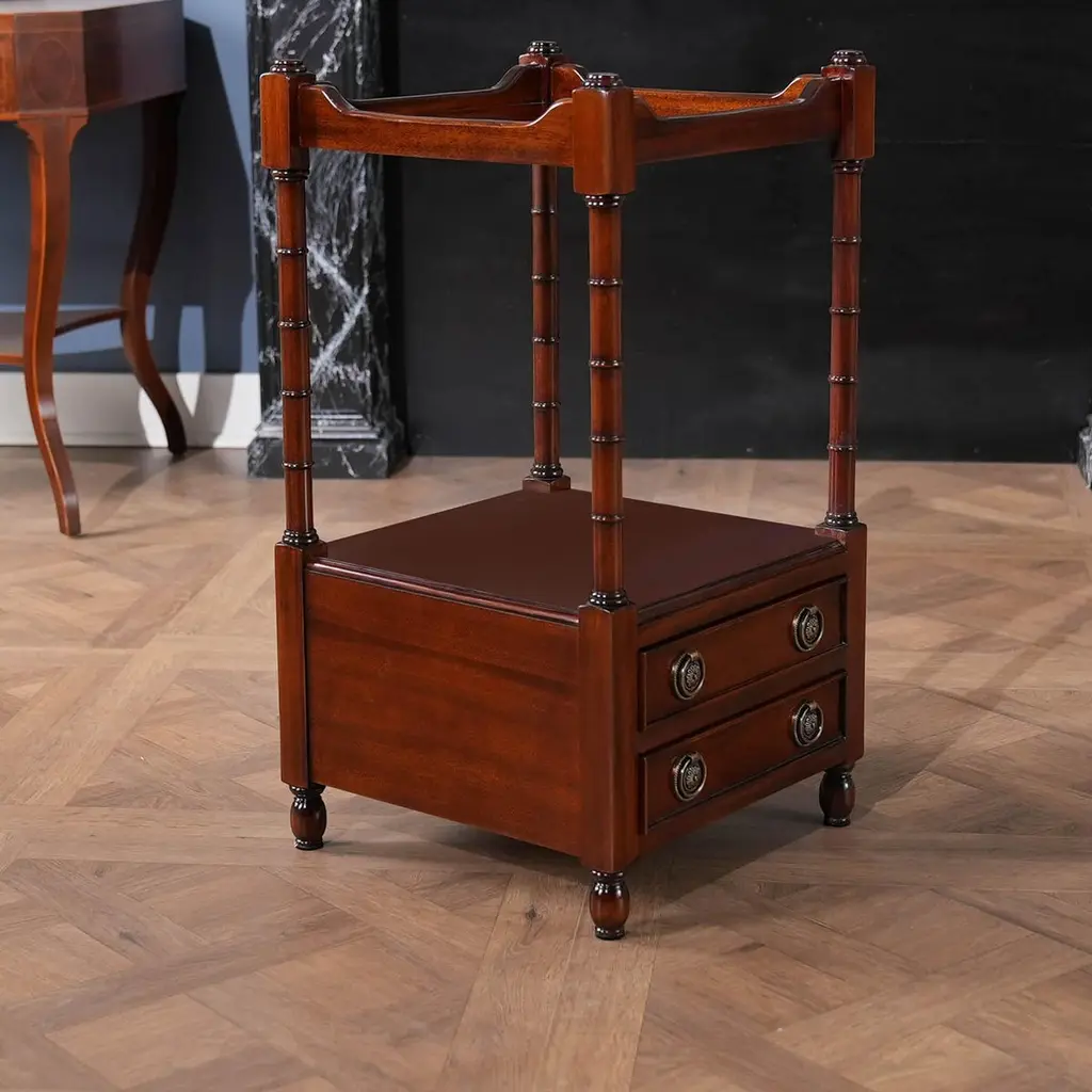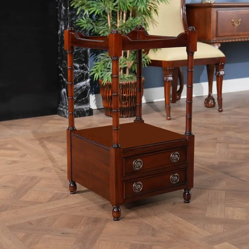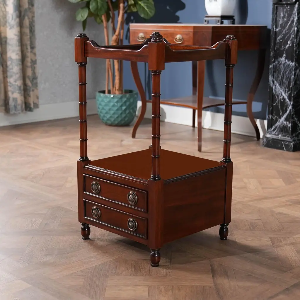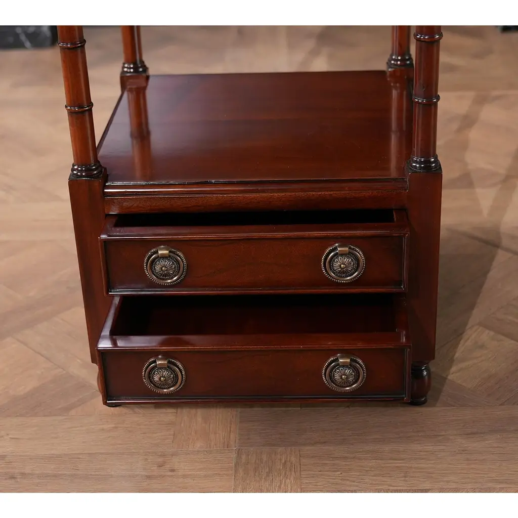 Popular for centuries this style of Mahogany Two Drawer Stand was first produced as an etagere which, once broken or damaged, would have been cut down to make an end table. They were in such high demand that cabinet makers began producing them as you see them now. Solid and decorative the Two Drawer Stand are perfect on either side of the sofa in the living room but are also often utilized as nightstands in the bedroom. The mahogany solids are manufactured using plantation grown and sustainable harvested mahogany while the veneered tops are hand selected by our skilled master craftsmen.Measures 15″w x 15″d x 28″h metric 38 38 71