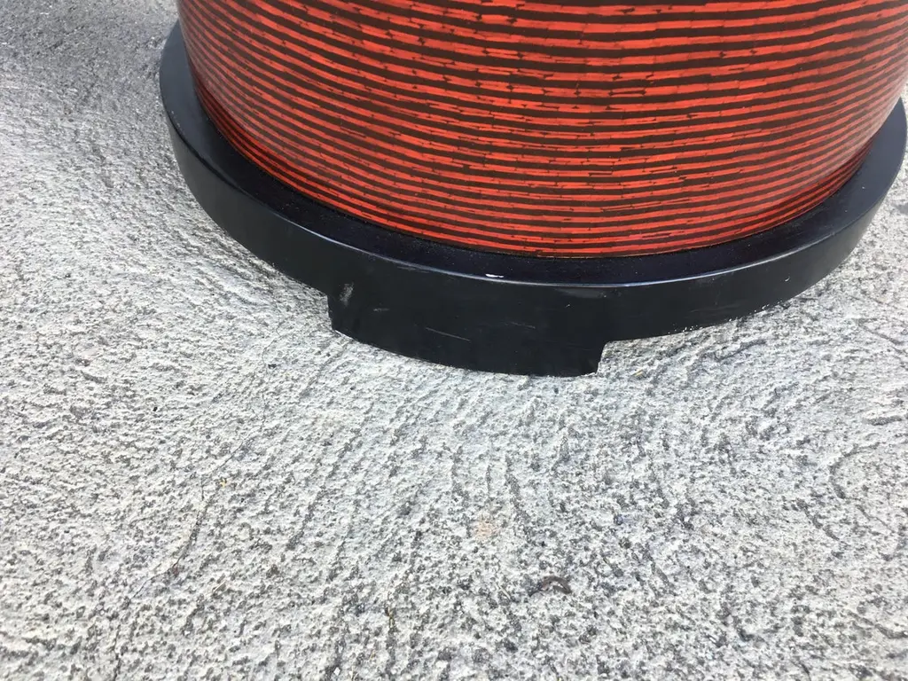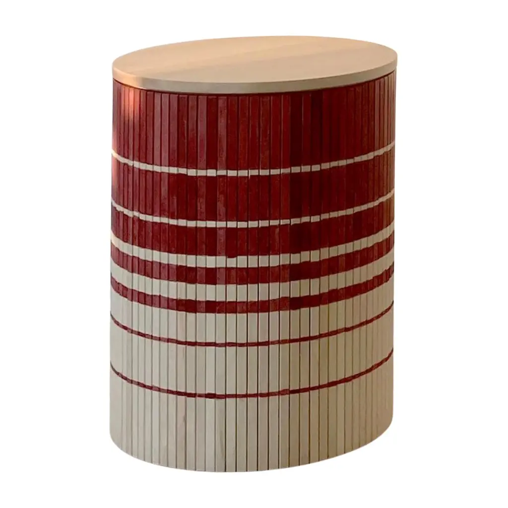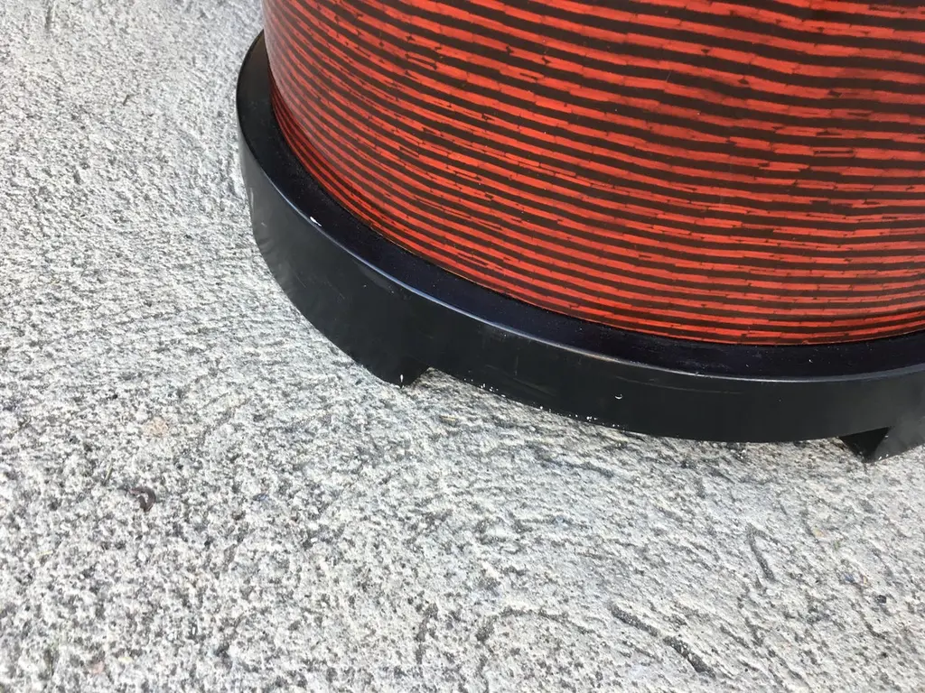Two-tone Cubist Style round side table with red and tan textured vinyl tops. Matching coffee table available search "Two-Tone Cubist Style Round"Available- 2