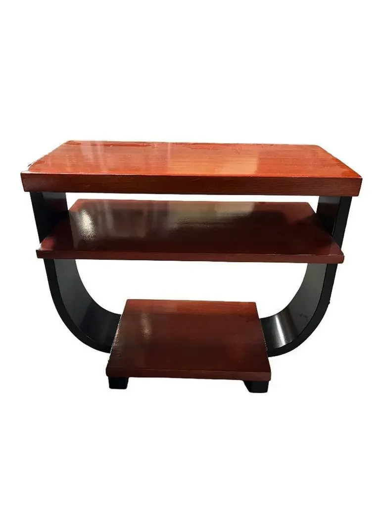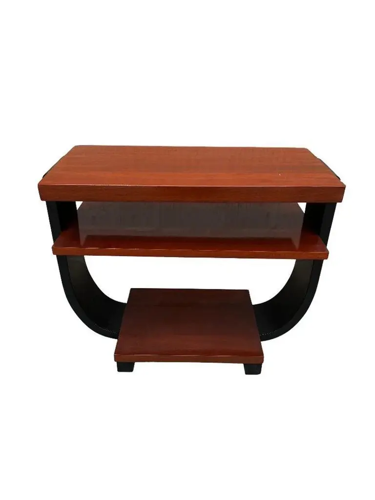 Two-tone, two-tier Art Deco side table made of Pearwood. Fantastic side profile with a great geometric round Cantaleviered Stacking table, and curio display for any small decorative items. The table was designed by Gilbert Rohde for Brown Saltman Furniture company. This is a listing for one table, with 2 tables available Gilbert Rohde was a pioneering American industrial designer, known for his innovative Art Deco and modernist furniture designs, contributing significantly to mid-20th-century design aesthetics. Brown Saltman was a prominent mid-20th-century American furniture manufacturer known for its innovative designs and collaborations with influential designers, contributing to the modernist design movement -Dimensions- Hx22" Wx26.75" Dx12" United States, 1930