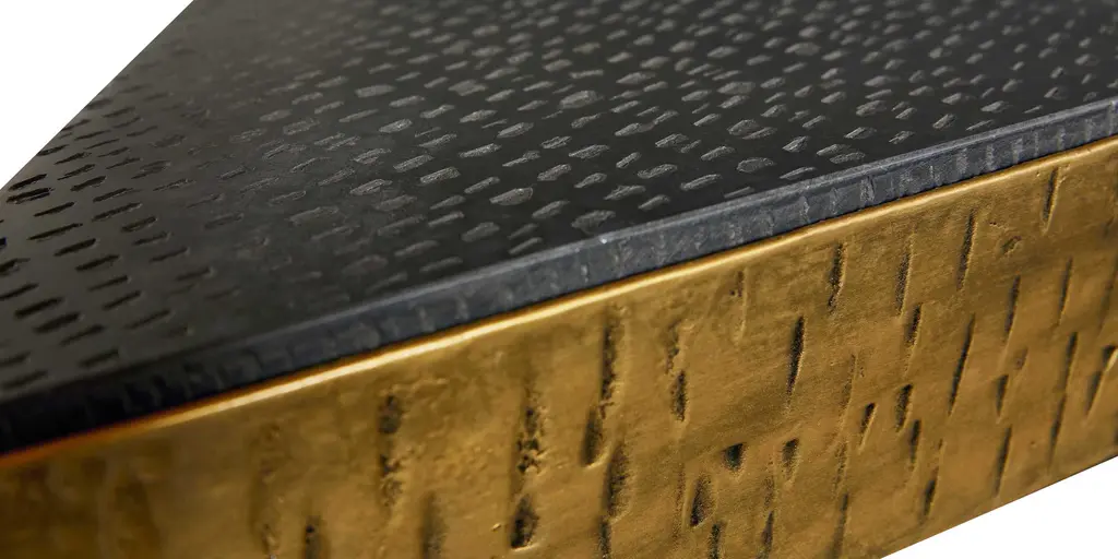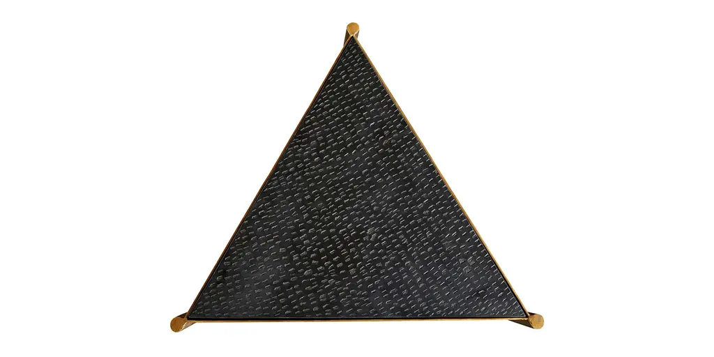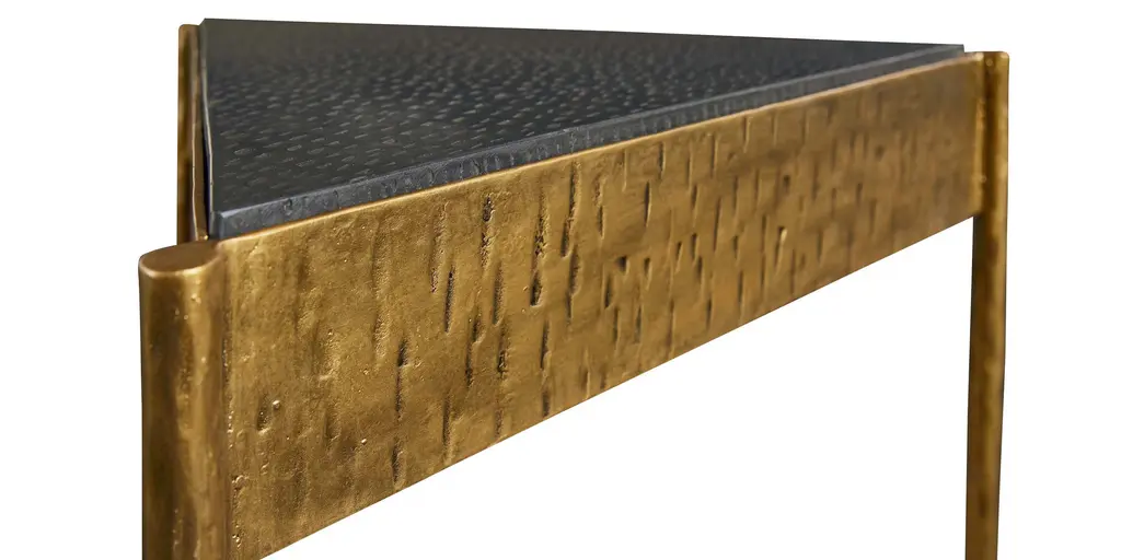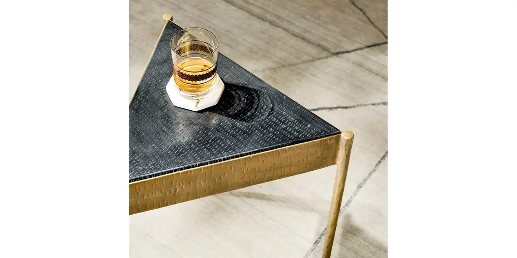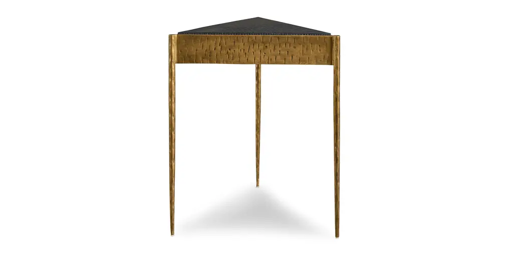 This little love triangle brings unmistakable drama to the room. Use it chairside on its own, or pair it with another Tyro table to form a square. Eyes are drawn to its bold black Kadappa marble top, quarried from Indian black limestone and hand textured for added dimension. The iron base, with gently tapering legs, is heavily distressed in a hand-applied brass finish for visual interest and warmth. The marble is sealed for added protection, but coasters are recommended. H24" D17" W19"