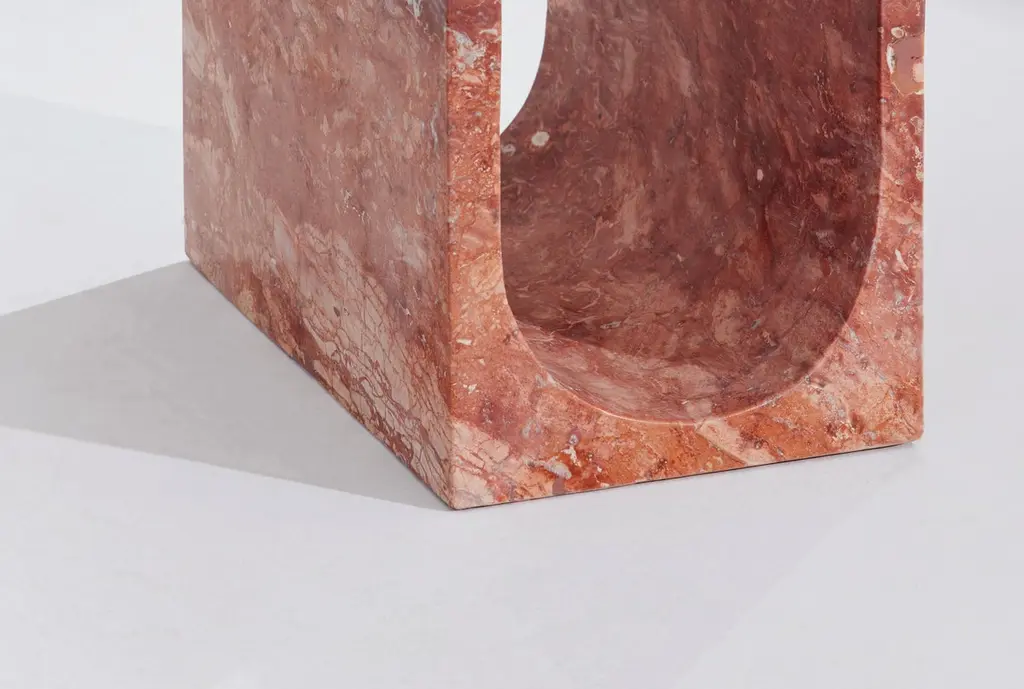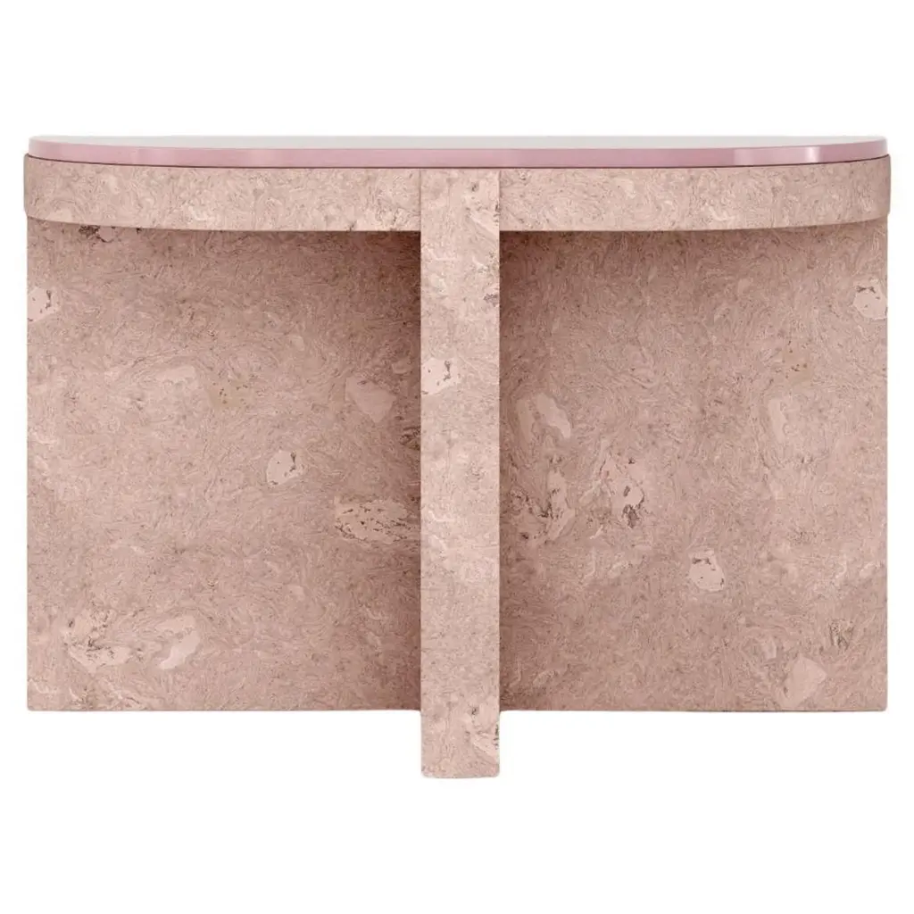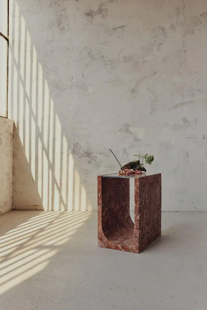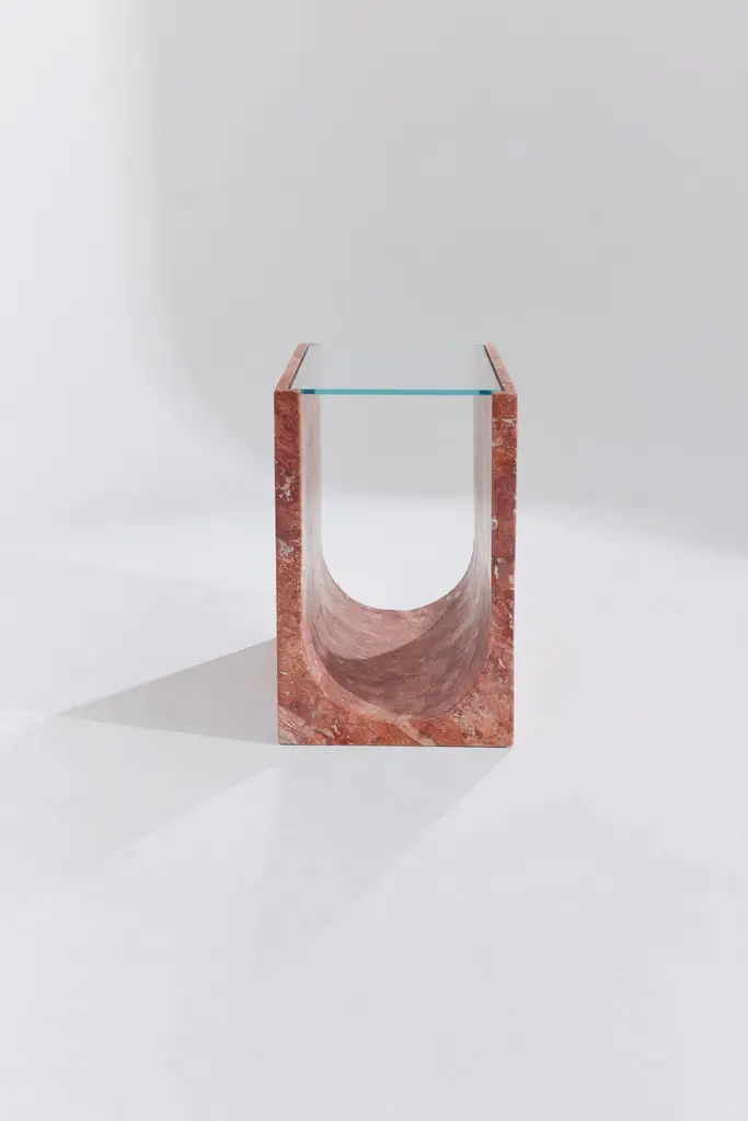 Artemis Red Travertine Side Table by RAFFINATODimensions: D 40 x W 30 x H 50 cm.Materials: Red travertine and glass.This table is available in different stone options: Red Travertine, Light Travertine, Silver Travertine, Calacatta Viola, and Brown Onyx. Please contact us.The Artemis table is a combination of a solid rectangular volume and an extracted cylindrical volume. Two oppositely rising surfaces generate a transparent and smooth plane. This design is a unique and elegant piece for your interior. It can blend with any interiors, as a bedside table, a side table, or decorative objects.RAFFINATO is a design brand specializing in natural stone. Inspired by the mystic nature of marbling art and the intercontinental spirit of Istanbul, designer Dicle Varsak transforms precious natural stones into outstanding design objects.RAFFINATO was created as an appreciation of the hidden gems of nature, such as marble, onyx, and travertine. The trace of time, infinite color and texture combinations, and fluid, dynamic creation are characteristic features of natural stone that ensure each design piece is unique and personalized.Our mission is to create functional and sculptural designs that enable users to establish a strong connection with the concept of beauty. Each design is the result of a refined combination of geometry, color, and texture.At the center of our work is a deep passion for design, producing high-end furniture, respecting natural stone, and revealing the unique pieces hidden within the stone.