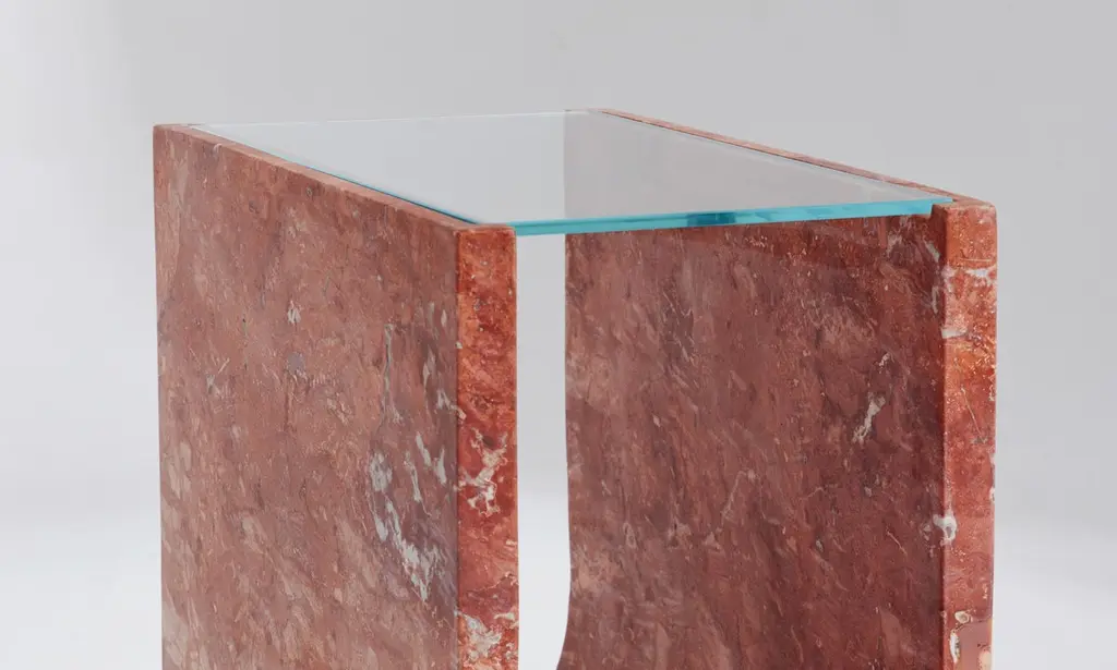 U Shape Base Red Travertine Side Table With Transparent Glass Top By Raffinato
