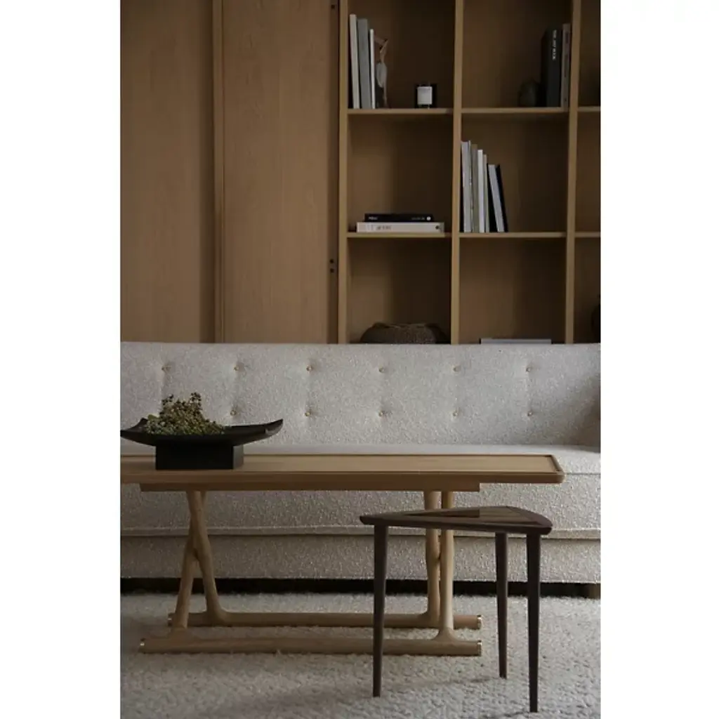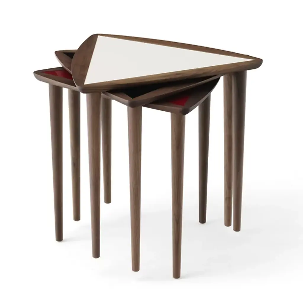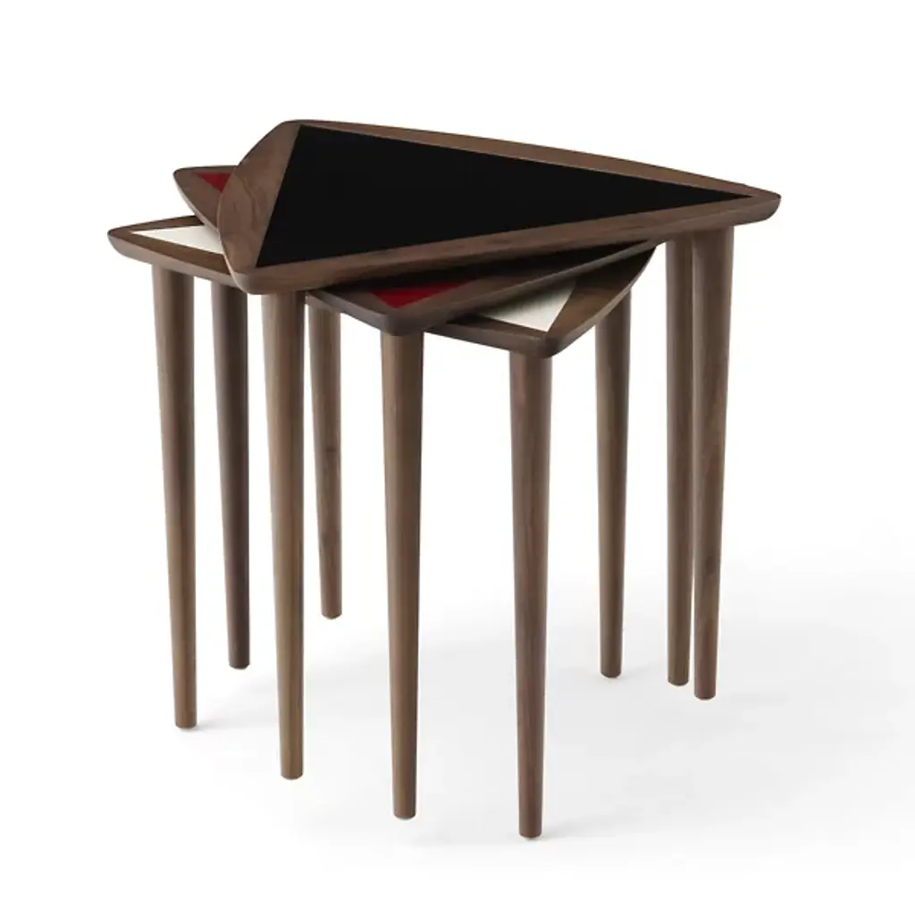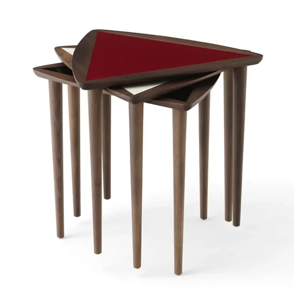 Crafted by Arthur Umanoff in the 1950s, the Umanoff Nesting Side Table from Audo Copenhagen offers a space-saving solution with a touch of mid-century modern charm. It features colored laminated panels in geometric shapes, and it combines practicality with a sleek, solid walnut construction. Whether it is stacked together or used separately, these three tables add a decorative and functional element to any space, blending tradition with innovation effortlessly.