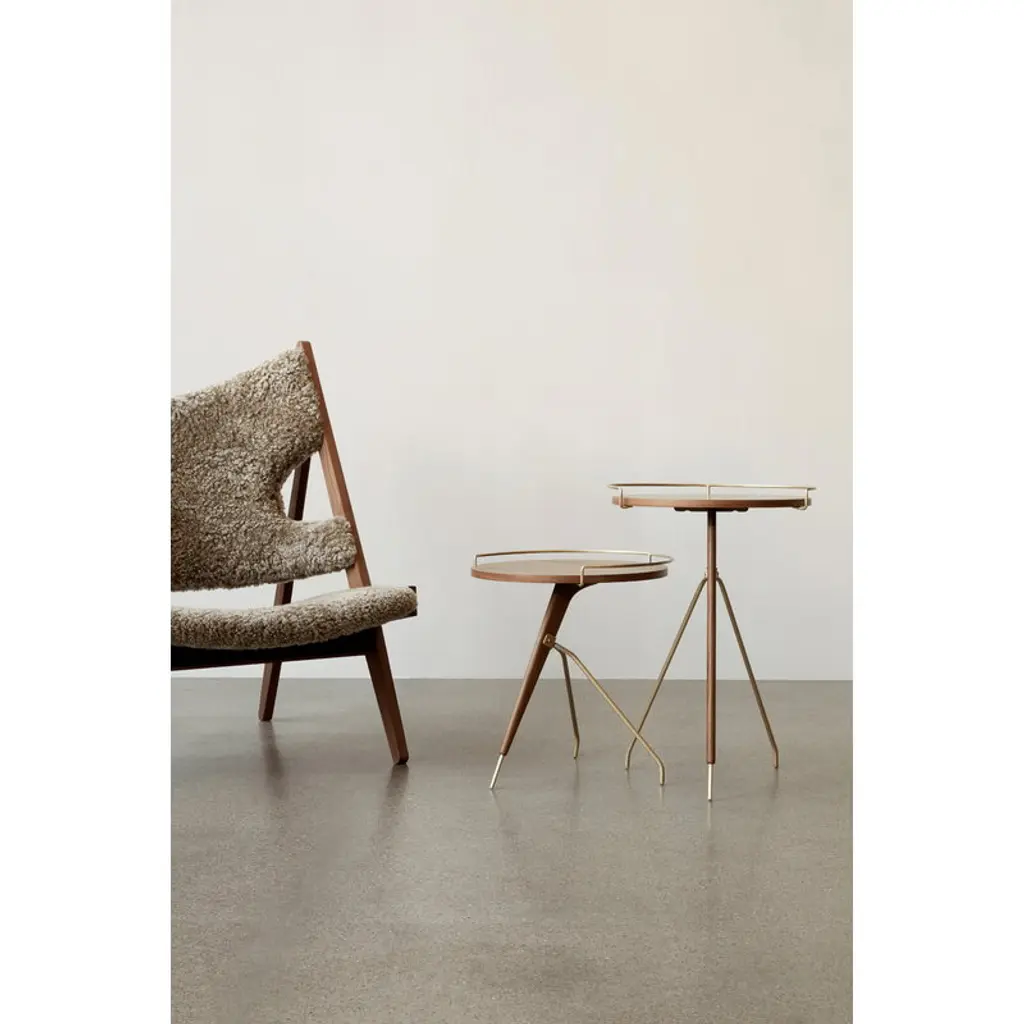 The Audo Copenhagen's Umanoff side table was designed by Arthur Umanoff in the 1950s. The reissued table challenges traditions with tapered legs, unexpected details and rounded design. The table combines high-quality walnut solid wood and brushed brass and serves perfectly as a surface for a cup of coffee, book or flower vase. The Umanoff side table fits effortlessly even in a smaller space. The Umanoff collection brings iconic designs by Arthur Umanoff back into production. American-born Arthur Umanoff was one of the designers of the modern movement in the middle of the century. In his designs, Umanoff favored long-lasting natural materials and stylish silhouettes.