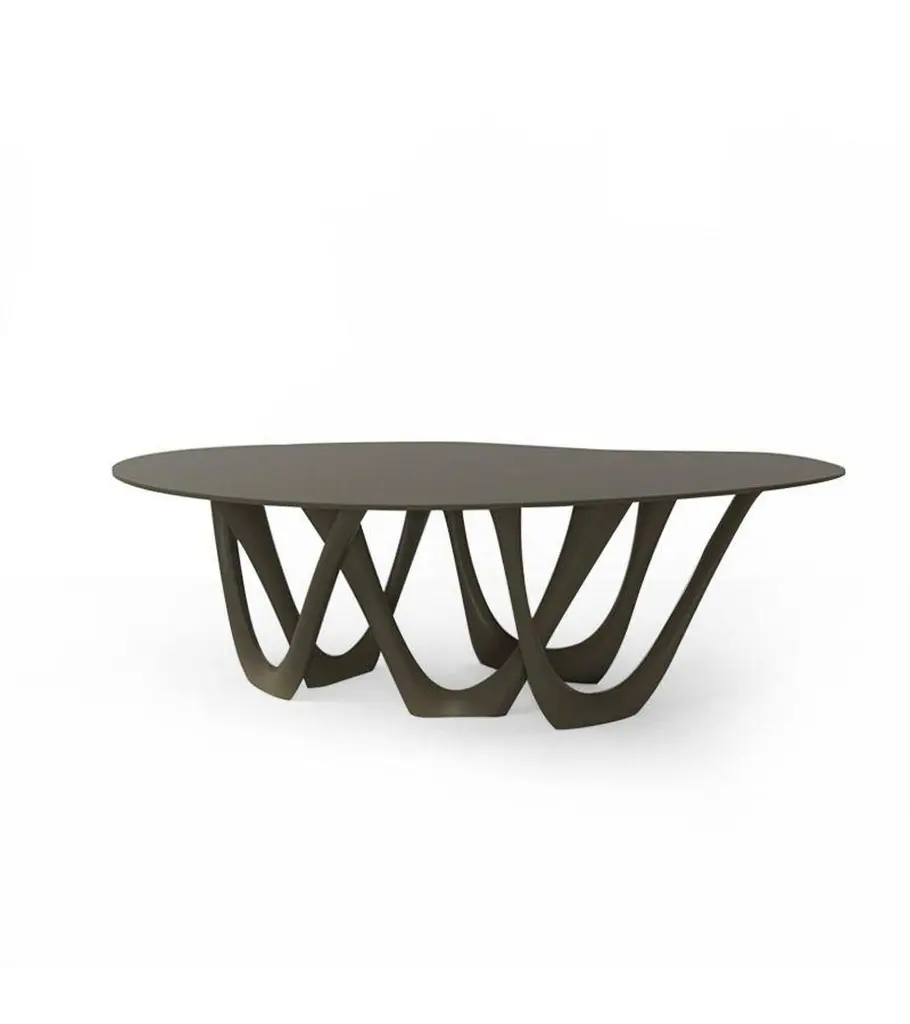 Umbra grey steel G-table by ZietaDimensions: D 110 x W 220 x H 75 cm Material: Carbon steel. Finish: Powder-Coated.Available in colors: Beige, Black/Brown, Black glossy, Blue-grey, Concrete grey, Graphite, Gray Beige, Gray-Blue, Moss Grey, Olive Green, Pale green, Resende, Stone gray, Tele gray, Umbra Grey, White Glossy, White Matt, Window grey or Yellow Olive. Available in finishes: Concrete, Stainless Steel, Wood top, and Aluminum. Also available in the side table version. G-Tables is a series of bionically shaped objects that are customized for customers' needs. Each table is “tailor-made” and created together with the user who can choose from a variety of materials, finishes and also decide about parameters like the number of people sitting at the table. The shape of the table, leg construction, and legs layout is optimized by the algorithm applied by designers to fit the distant space and meet the most demanding interiors.About Zieta: Zietas main goal is to deliver uniqueness and customization in design and construction while keeping the production, transport, and warehousing innovatively efficient.This is how they imagine the future world: Light, durable structures of customized applications produced on demand out of one-of-a-kind parts, yet efficiently.They use a computer-controlled production process. Customized pattern, customized form, customized function, one-of-a-kind product, and outstanding precision are what they deliver.You will find all of this philosophy reflected in the products. The research, they discover new possibilities, they play with forms and they deliver a beautiful, innovative, surprising outcome to people who love the design and who care about design development.They believe their work is a valuable contribution to the world of design not only by the unique beauty of the forms but most of all by opening ultra-innovative opportunities of forming and new paths for the world of the future.