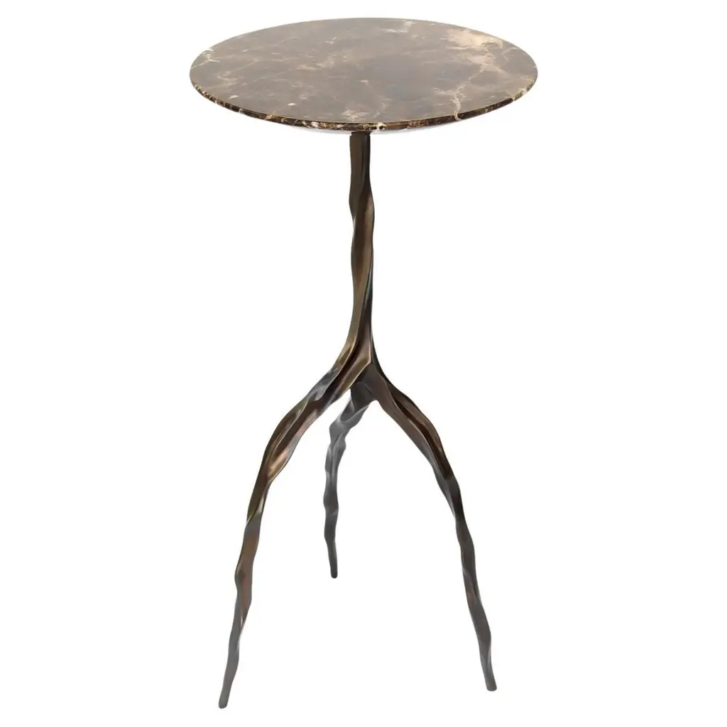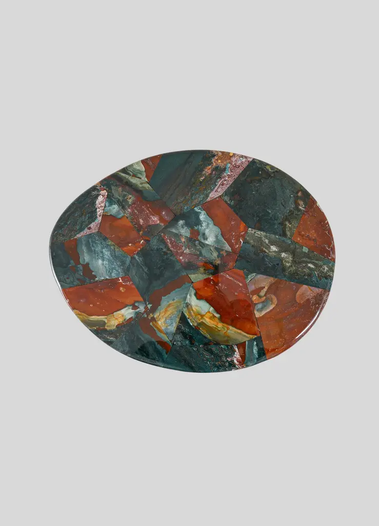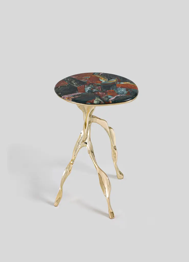 Under The Banyan Gold Side Table Large in Brass & Semi Precious Stone, Viya by Vikram GoyalEchoing ancient whispers of worship, each object captures the essence of the Banyan tree, believed to hold the divine power to fulfil wishes. Crafted with reverence, these brass objects reflect the intricate dance of aerial roots, encapsulating the symbolism of longevity, mortality, and enlightenment.Side table in brass with semi precious overlay top. Handmade in India.Product DetailsMaterial: BrassOverlay Top: Multicolor JasperSize: 16"L x 11"W x 22"H 40.6 L x 27.9 W x 55.9 H cmWeight: 13.5 kg 29.7 lbsNumber of Pieces: 1 Side TableSKU: VST459This product has been handcrafted by local artisans. As such, slight variations are a testament to the unique character of a piece made by hand.Country of Origin: India