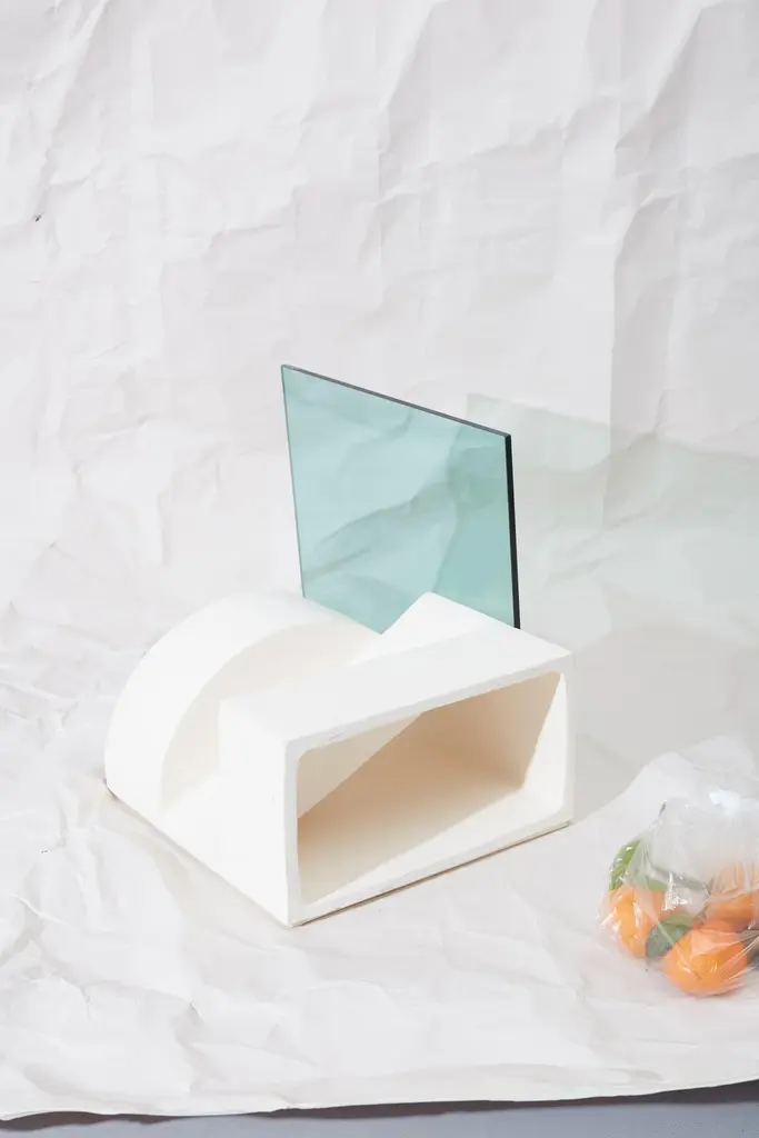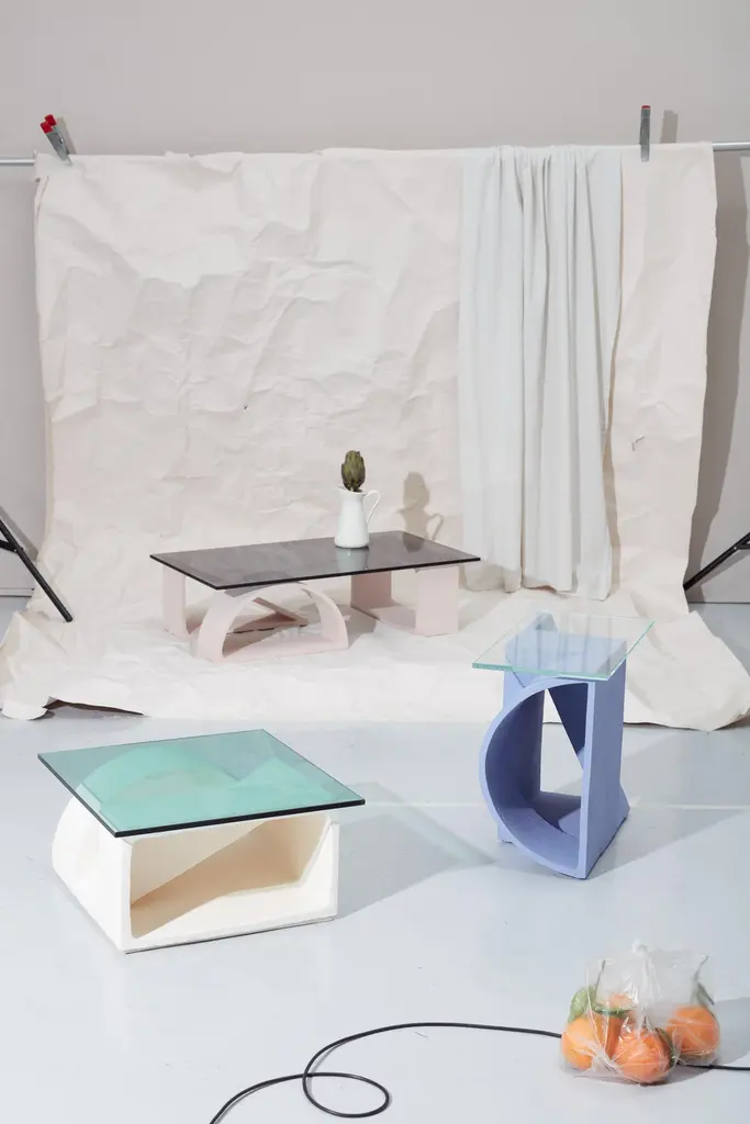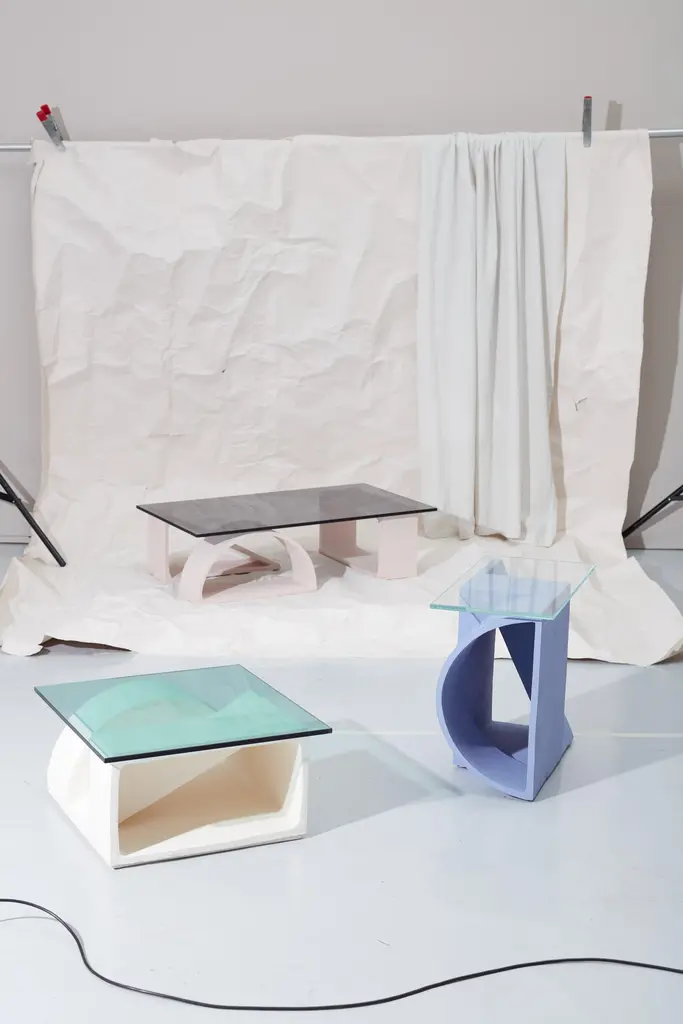 Unique ceramic side table by Theodora AlfredsdottirUnique Materials: white. Stoneware and green glassDimensions: 40 x 40 x 20 cm Glass 44 x 44 x 0.6 cmA collection of ceramic side tables that explore the possibility of using a single mould to produce uniqueobjects. With a stackable mould, the project studies if achieving uniqueness within a standardised process can add value to the outcome. A mould that consist of 3 parts in shapes based on a square, triangle and circle can be stacked differently each time a new piece is cast which results in all unique pieces. The mould can either be used to slip cast or press mould ceramics which then are fitted with a glass top to create a table.Theodora Alfredsdottir is a product design studio based in London. Theodora is an Icelandic product designer. She holds a bachelor’s degree in product design from the Iceland Academy of the Arts (2012) and a master’s degree in Design Products from the Royal College of Art in London (2015).Storytelling through objects; Theodora’s work revolves around the narrative an object can inhabit and exploring ways of objectifying that narrative. She's interested in the way an object can act as documentation of its manufacturing process; a record of what went on between the machine, tools, craftsman and material as well as it can communicate its origin and former life. In short, the object creates its own factual narrative. That often leads to the discovery of unexpected qualities as well as it gives the user a subtle opportunity to reconsider our material world and explore value in a different way.