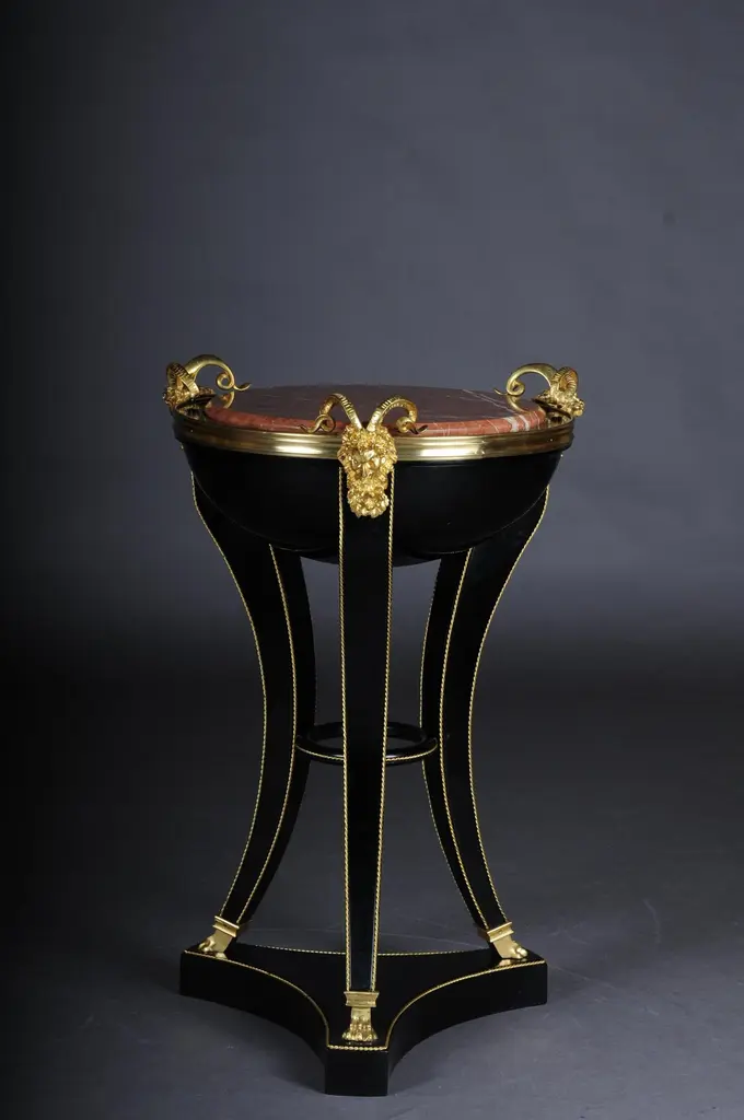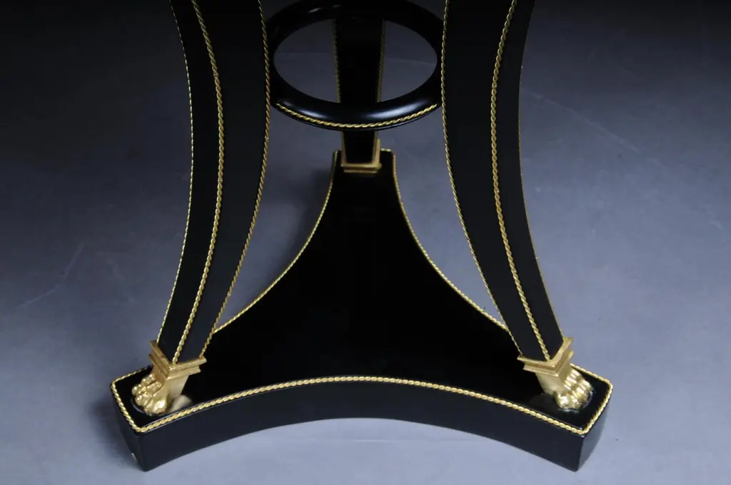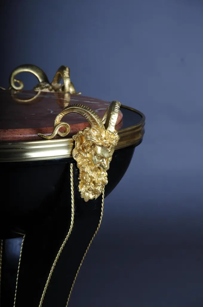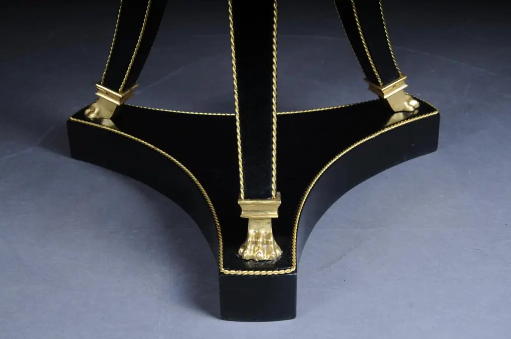 Unique ebonized side table in the Empire stylePiano black polished veneer on solid wood. Hemisphere with marble slab on satyr mask with tapered curly square legs in bronze lion paws ending on base plate retracted on three sides. The fittings are pronounced and of exceptionally good qualityBeautiful patina, with shellac hand polish.(G-Sam-186).