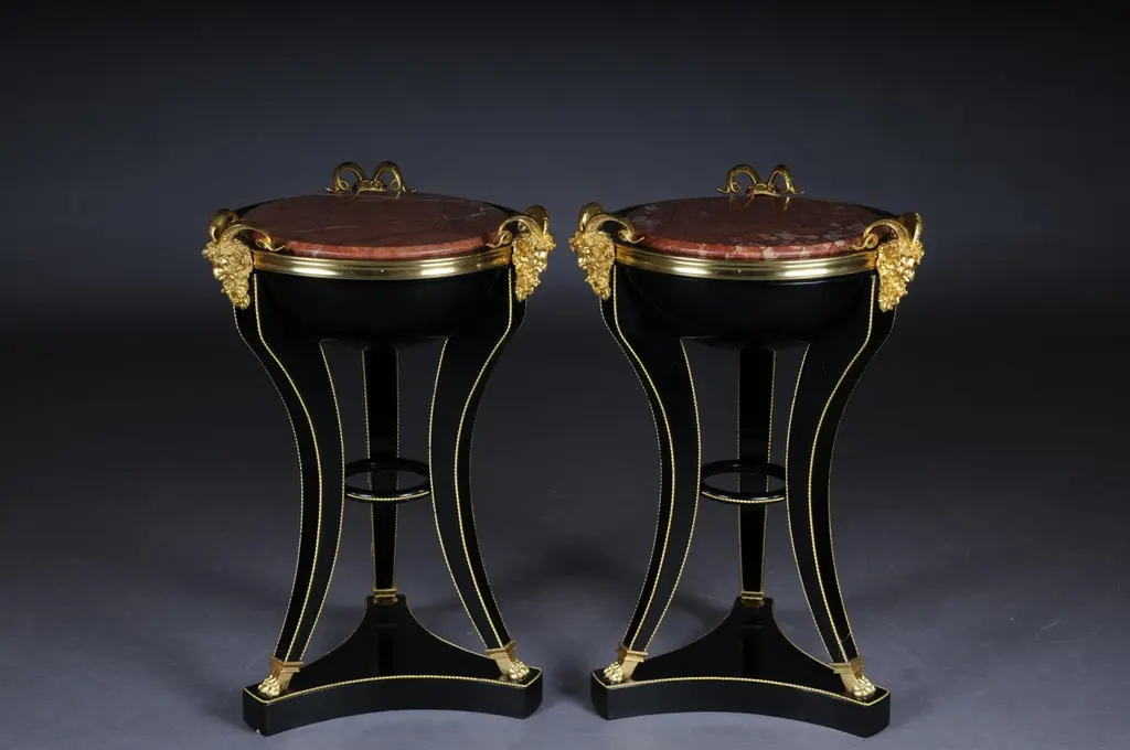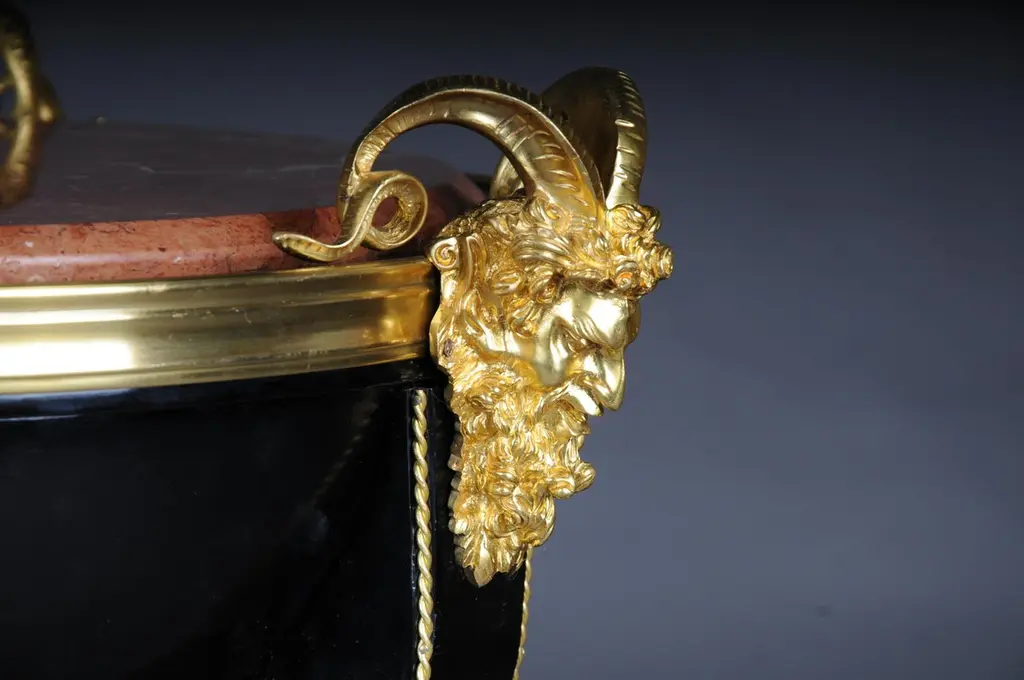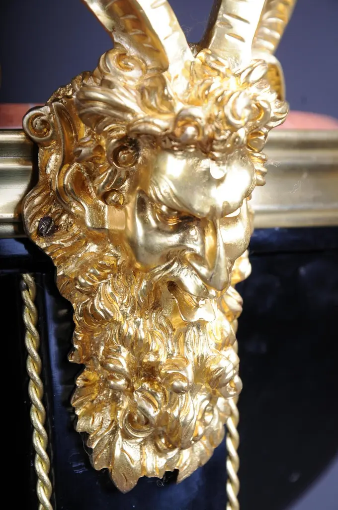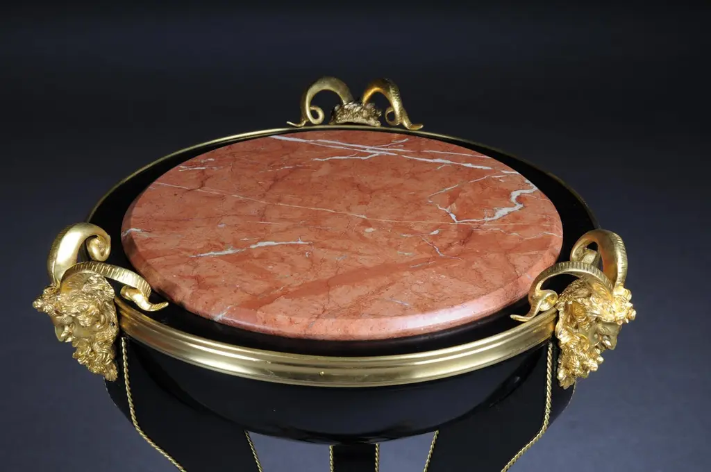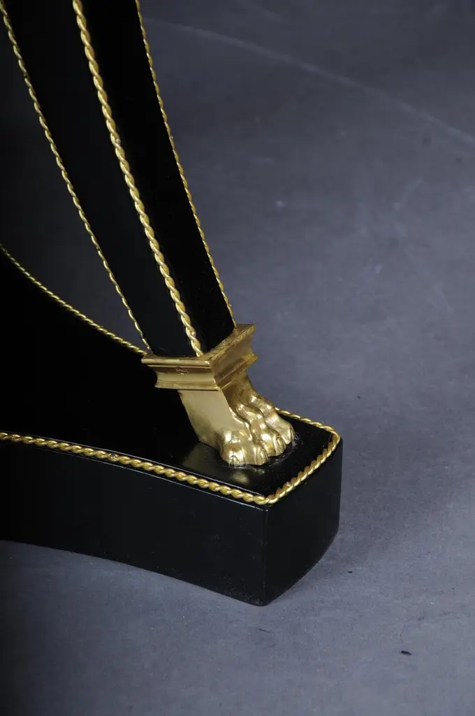 Unique ebonized side table in the Empire stylePiano black polished veneer on solid wood. Hemisphere with marble slab on satyr mask with tapered curly square legs in bronze lion paws ending on base plate retracted on three sides. The fittings are pronounced and of exceptionally good qualityBeautiful patina, with shellac hand polish.(G-Sam-186).
