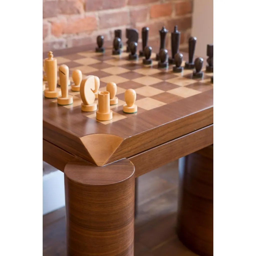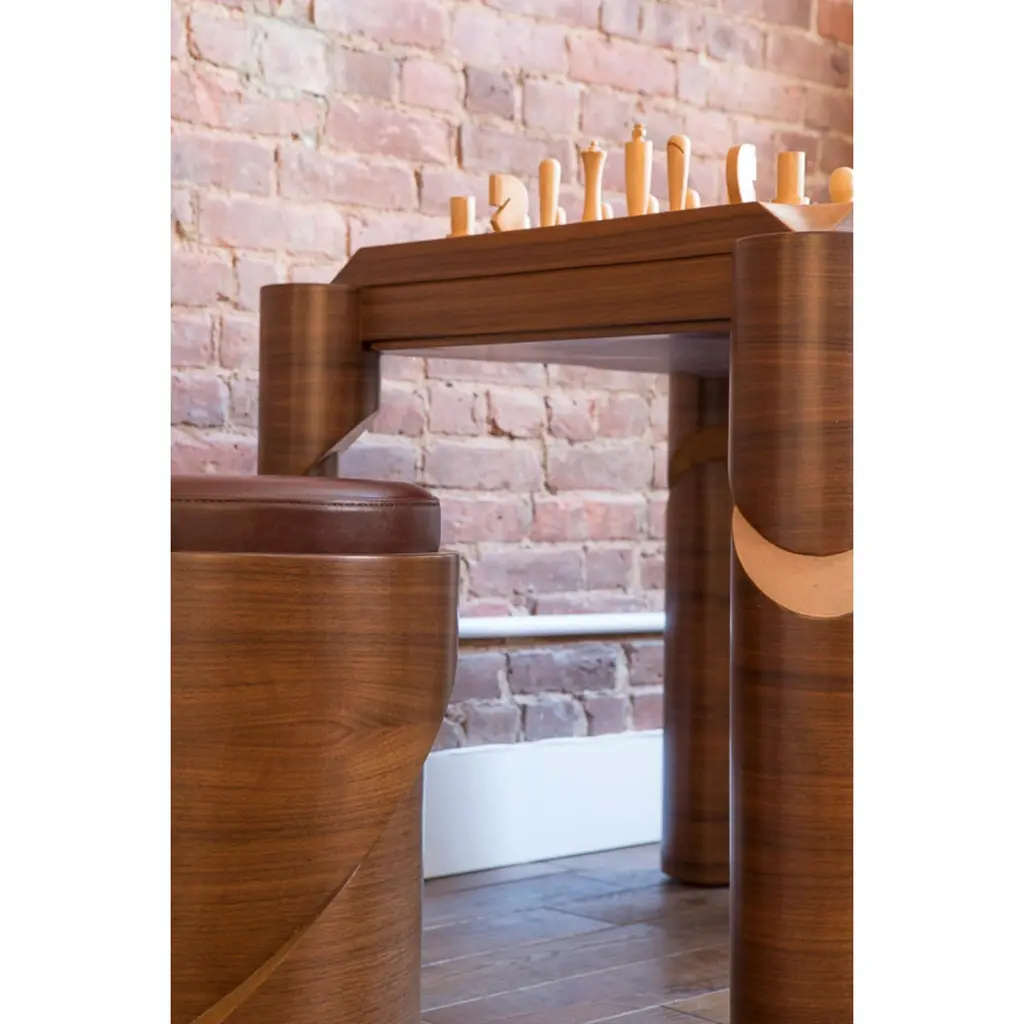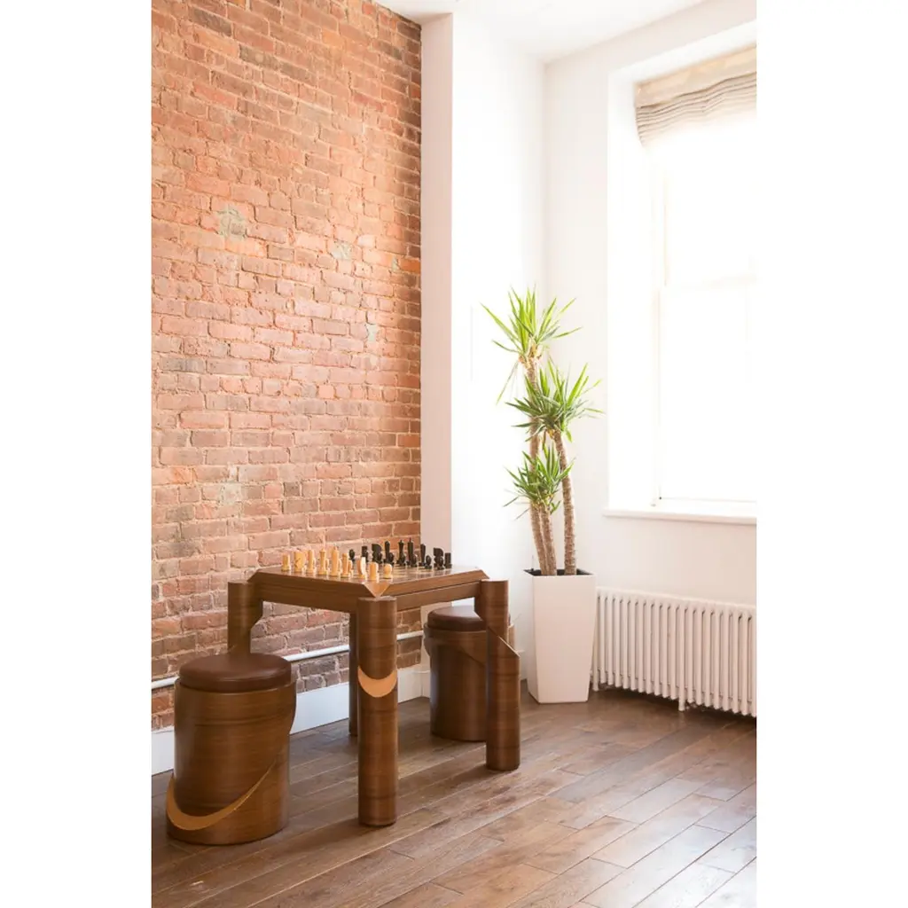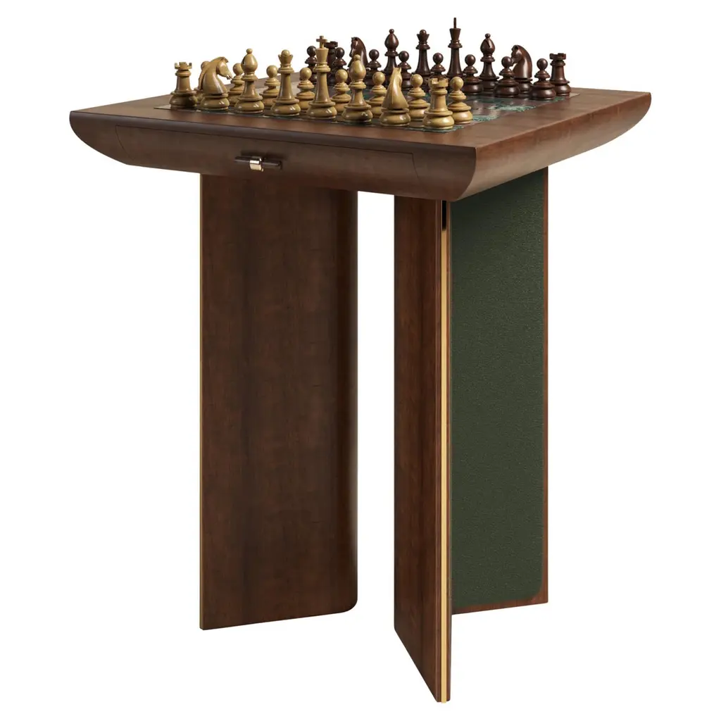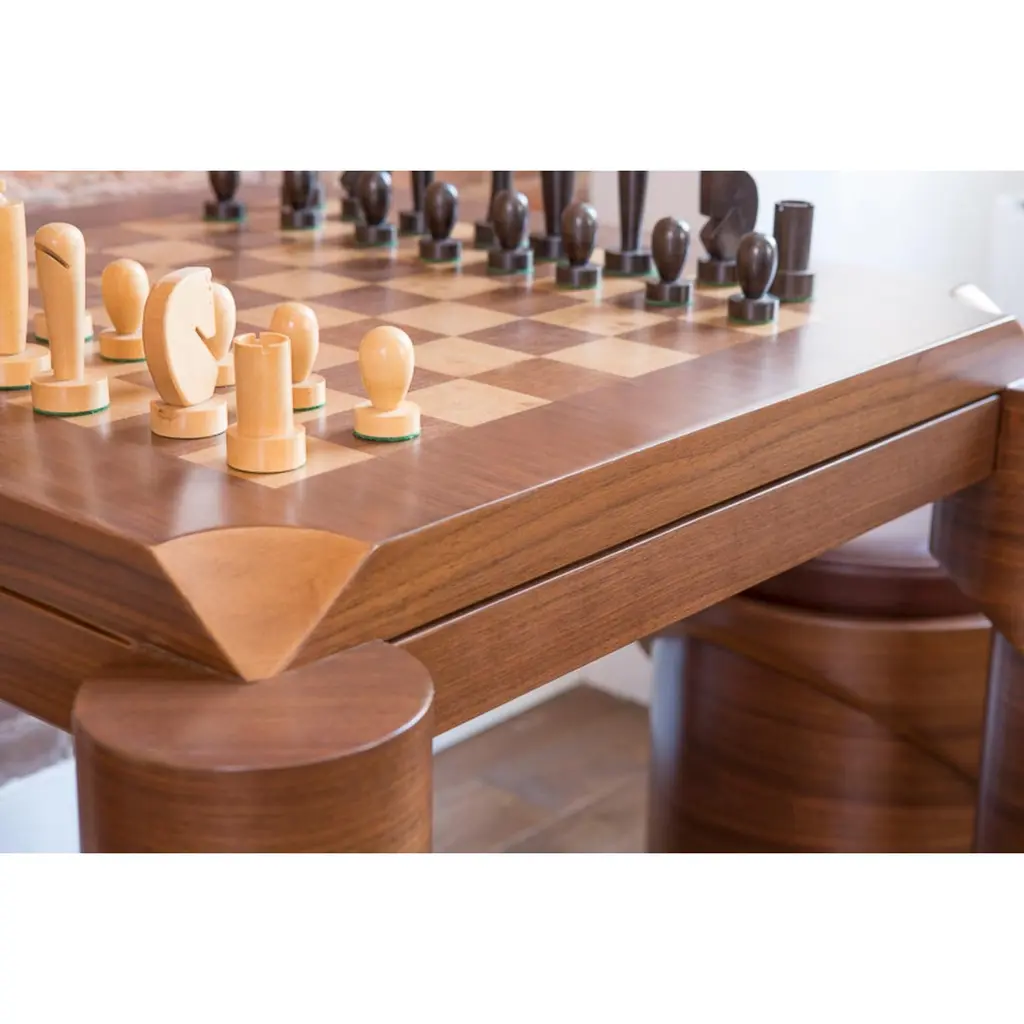 Unique Matte Grandmaster’s game table by Ekin VaronDimensions: W 101.6 x D 101.6 x H 76.2 cm Stools: D 35.5 x 43.1Materials: Walnut, maple veneer, leather.Backgammon & ChessThe ancient game of chess is based on strategy and winning is ultimately being the better strategist. The table was designed to reflect this exchange between opponents. The players think long-term, protect certain pieces, while losing other pieces to get ahead in the game. This constant change in mindset: protect, let go, lose, capture creates a shift in power throughout the game, and the table reflects these shifts. The delicate reveals and movements on the table and its legs are an idea into battle between a player and his opponent.The lid has chess board on one side, and plain walnut veneer on other. There is a magnet within the lid, so you can pick up lid with a magnet piece. It can be used as chess/backgammon and simple side table. Comes with 2 sitting stools. The drawer to store game pieces as well as put your cocktail glass while playing is lined with leather or felt.Ekin Varon is the founder and creative director of Ekin Varon Design Studio. Born and raised in Istanbul, Ekin has worked in various architecture firms and furniture design studios after completing her academic education in the furniture department of Rhodes Island School of Design. Having a sculptor mother and a father who is in the textile business, Ekin grew up having appreciation of various artistic disciplines and a desire of creative expression. In 2020, former co-founder of 15 West Studio, founded Ekin Varon Design Studio. Interdisciplinary art is at the center of Ekin’s design approach. Using various craftsmanship techniquesat at her designs, she creates multi layered, unique furniture, objects and environments. Originality is the main driver of her designs and she achieves that by creating timeless designs that harmonize modern aesthetics with traditional Turkish craftmanship.