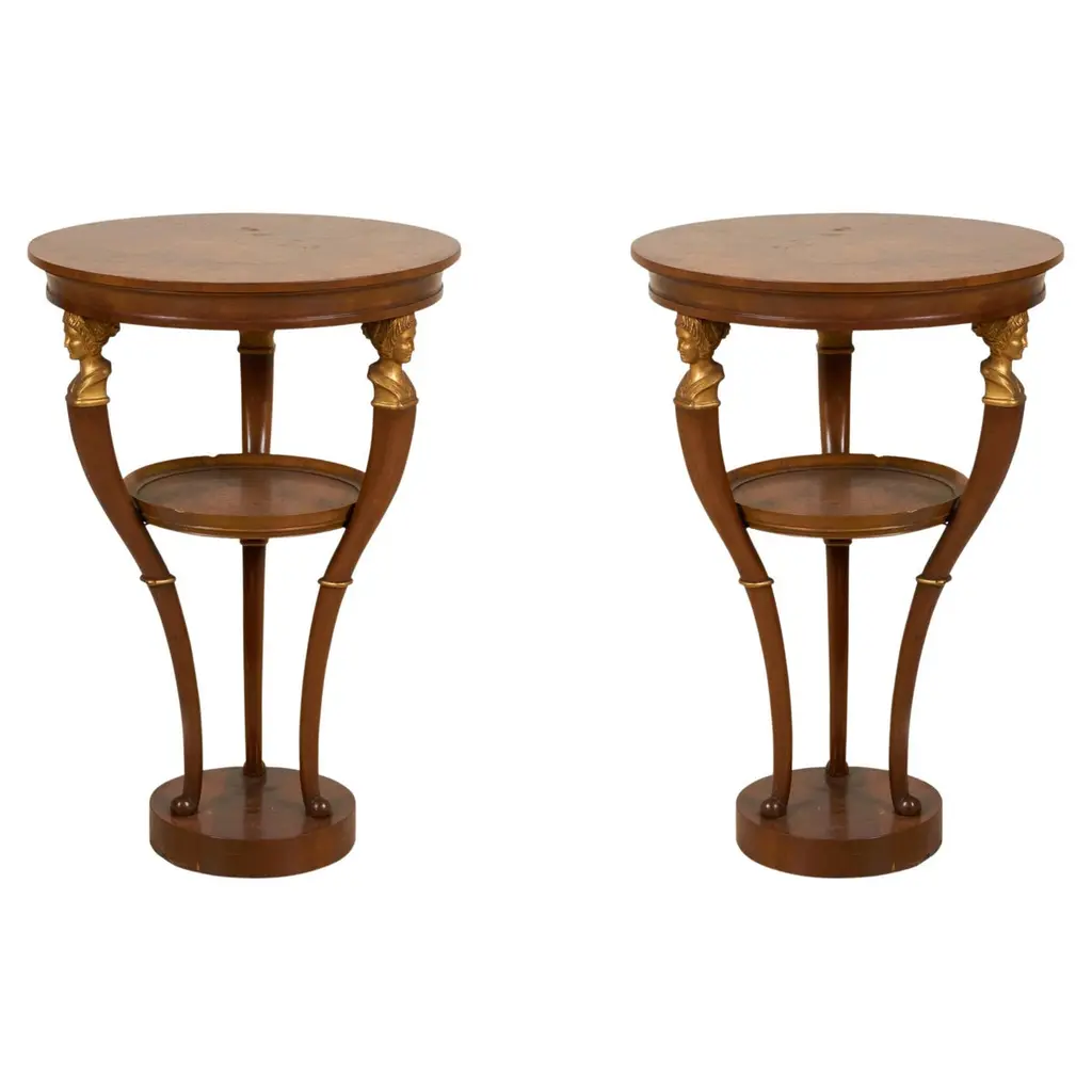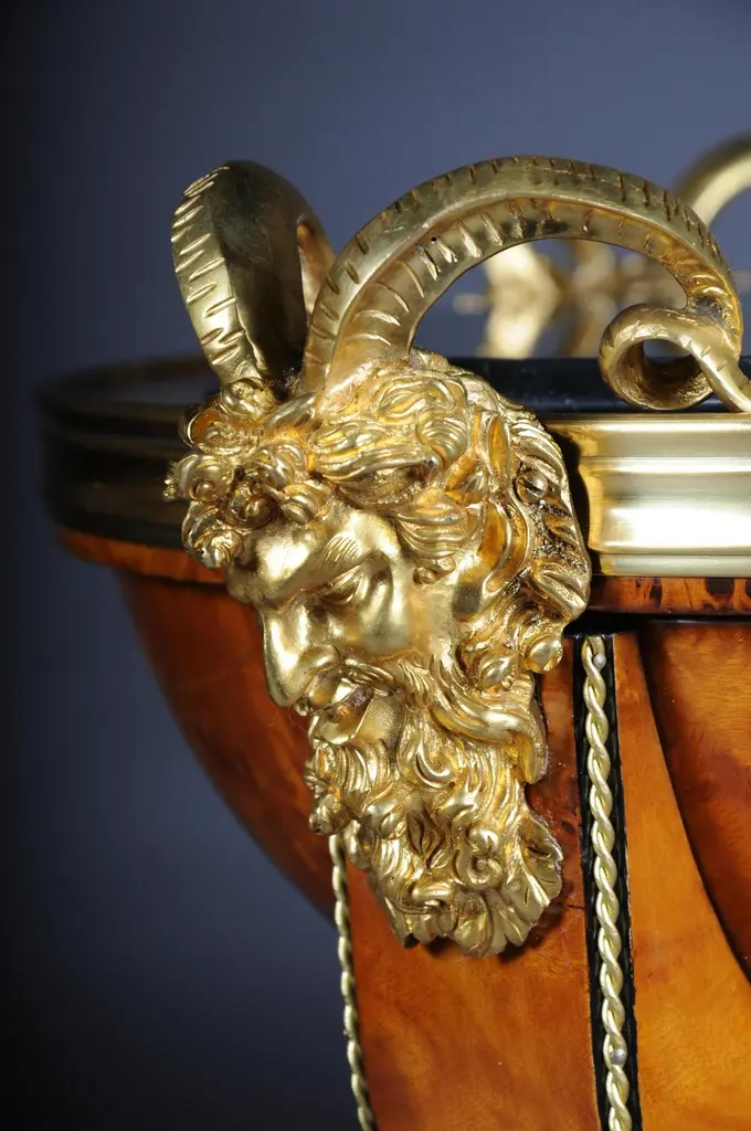 Maple root veneer on solid wood. Hemisphere with marble slab on satyr mask with tapered curly square legs in bronze lion paws ending on base plate retracted on three sides. The fittings are pronounced and of exceptionally good qualityHoney-colored veneer, nice patina, with shellac hand polish.(G-Sam-185).